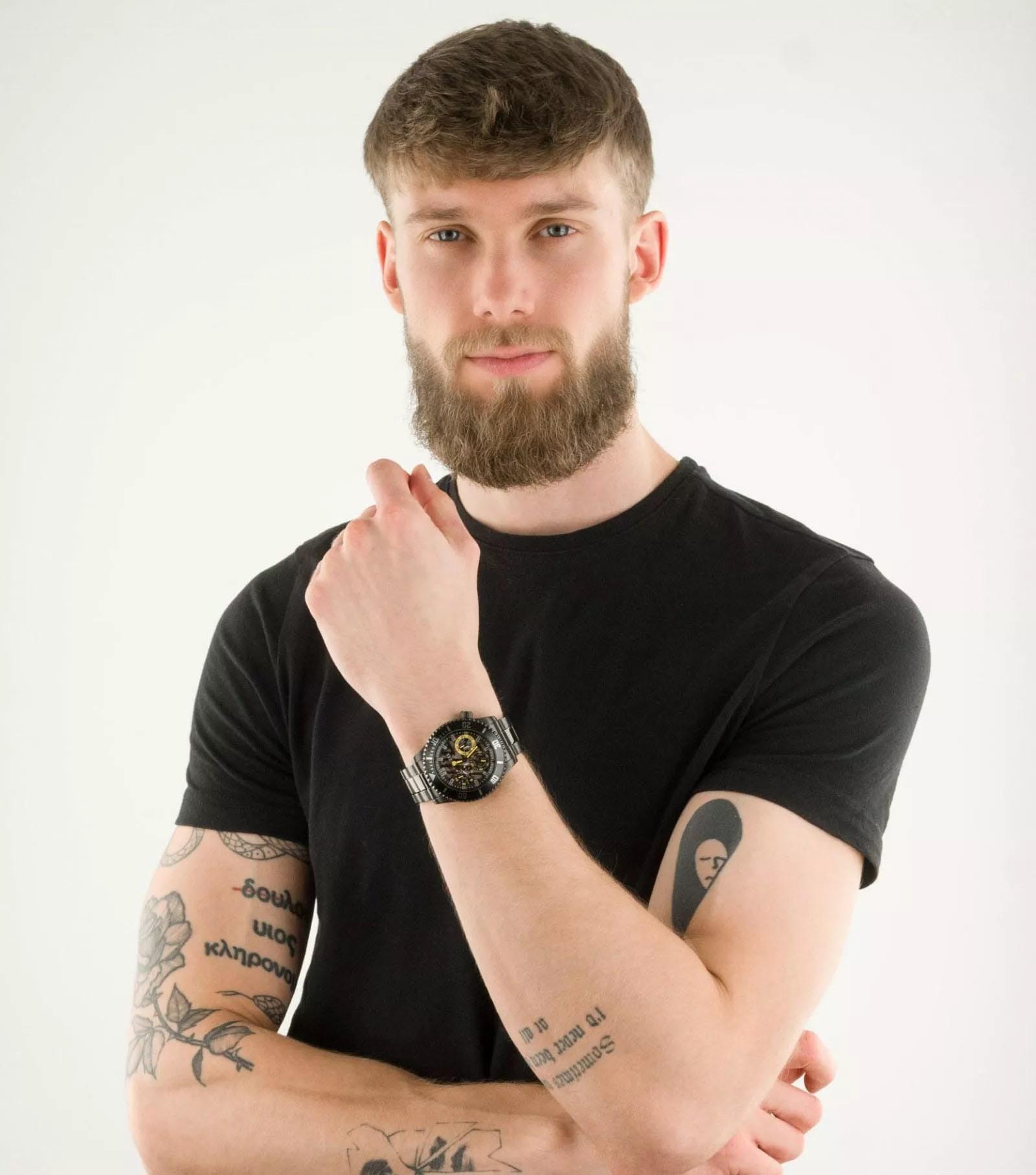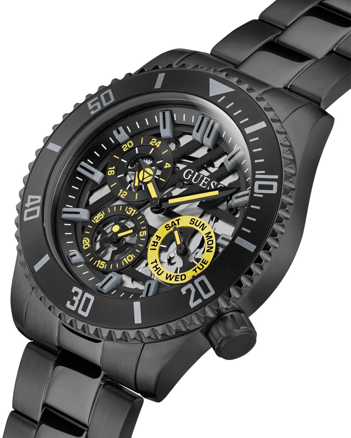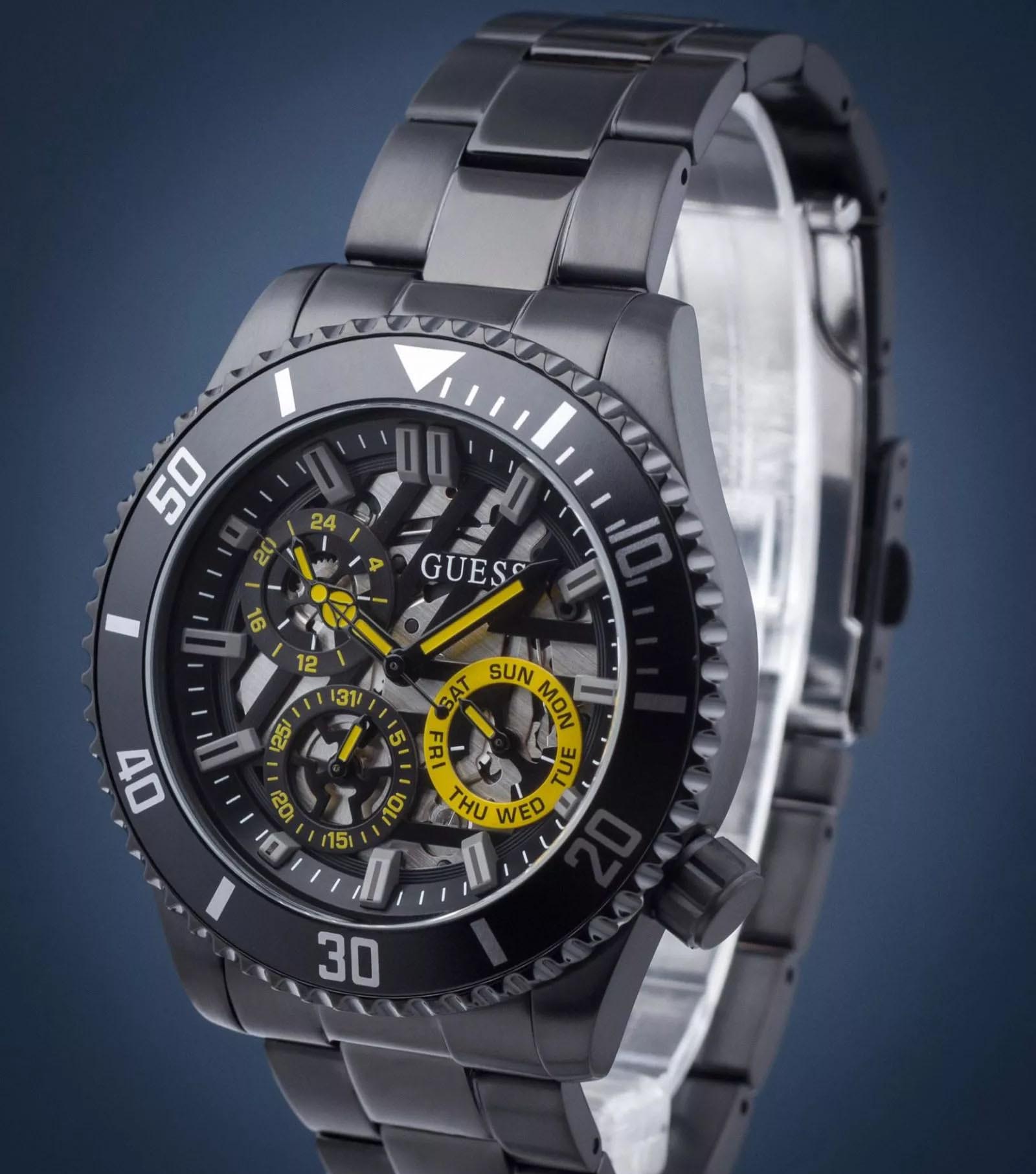Мужские наручные часы с минеральным стекломМинеральное стеклоМинеральное стекло представляет собой искусственно выращенный минерал кварца. Такое стекло отличается особой устойчивостью к повреждениям и царапинам. Уступает по некоторым качествам сапфировому стеклу. Guess Axle GW0488G3, кварцевый механизм с высокой точностью. Класс водозащиты: 50 метров, позволит защитить корпус от случайных брызг или капель дождя. Корпус часов изготовлен из стали с IP-покрытиемIP-покрытиеМетод ионного напыления. Демонстрирует повышенную устойчивость к истиранию, окислению и химическим веществам. Под воздействием высокого давления и температуры около 1500°C молекулы металла надёжно соединяются с частицами корпуса часов.. Стальной браслет на раскладной застёжкеРаскладная застёжкаТакой тип застёжки используется только на браслетах из металла. Она никогда не раскрывается полностью, происходит разделение на 2 и более частей. Раскладывающая застёжка снизит вероятность потери часов к минимуму. с IP-покрытиемIP-покрытиеМетод ионного напыления. Демонстрирует повышенную устойчивость к истиранию, окислению и химическим веществам. Под воздействием высокого давления и температуры около 1500°C молекулы металла надёжно соединяются с частицами корпуса часов.. Стрелки с люминесцентным покрытиемЛюминесцентное покрытиеПозволяет считывать показания времени в темноте. Производители наносят на стрелки, часовые индексы, безель или поверхность циферблата светонакопительный состав, дающий холодное свечение.. 12-ти и 24-х часовой формат времени. Дата и день недели вынесены на отдельные циферблаты. Смещенная рифленая заводная головка с защитой.