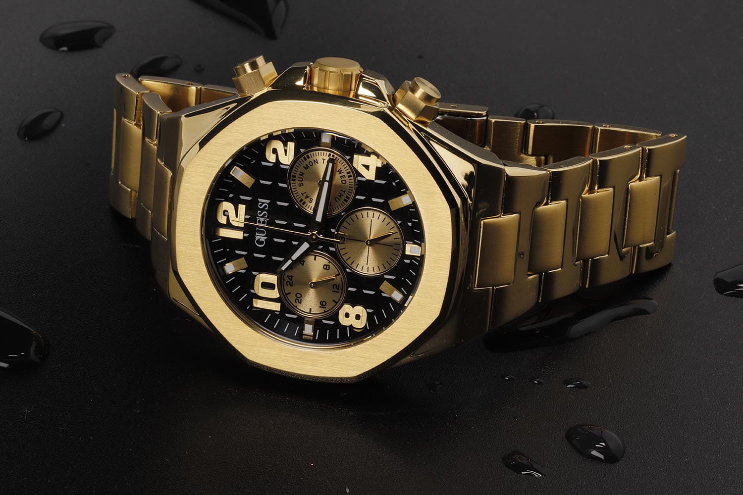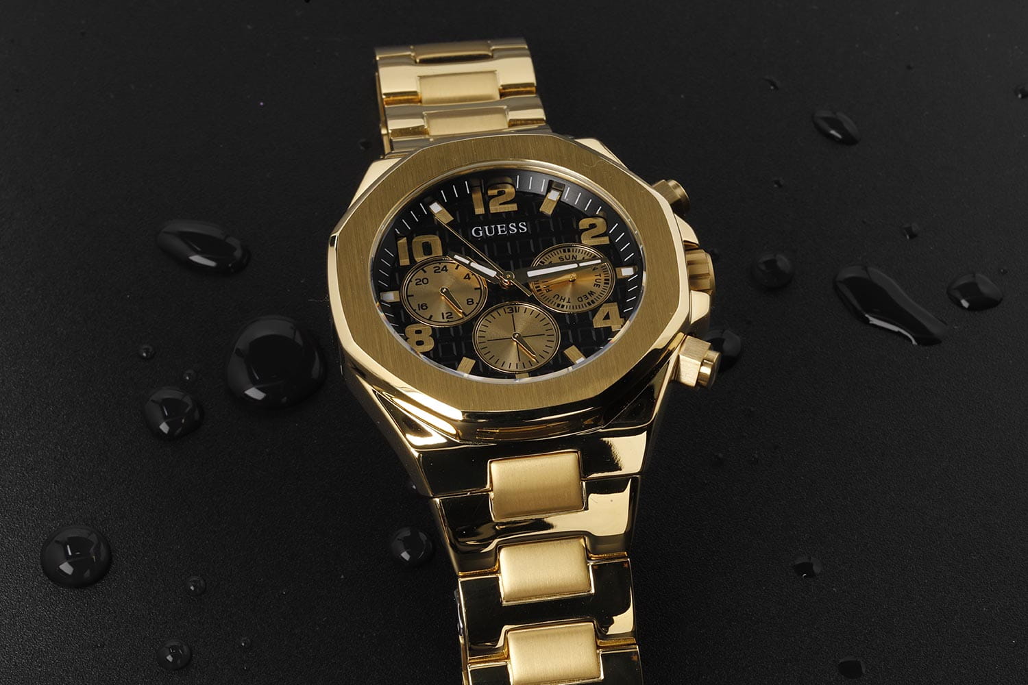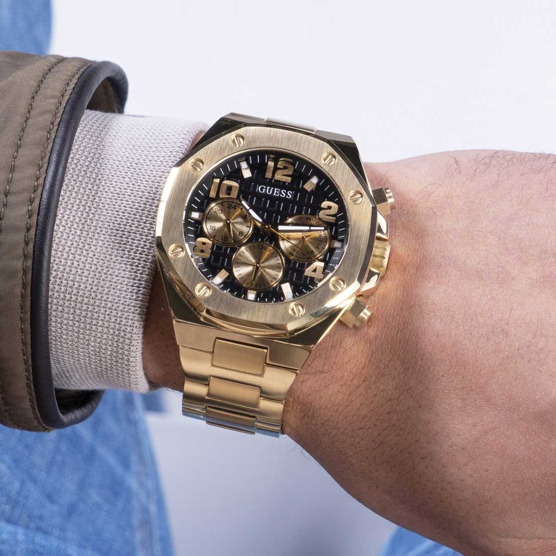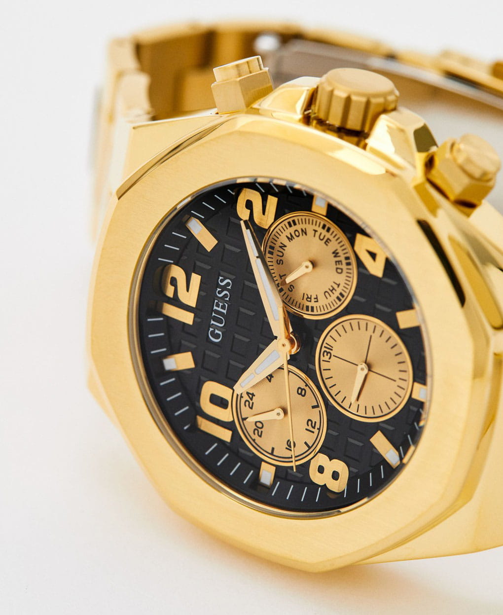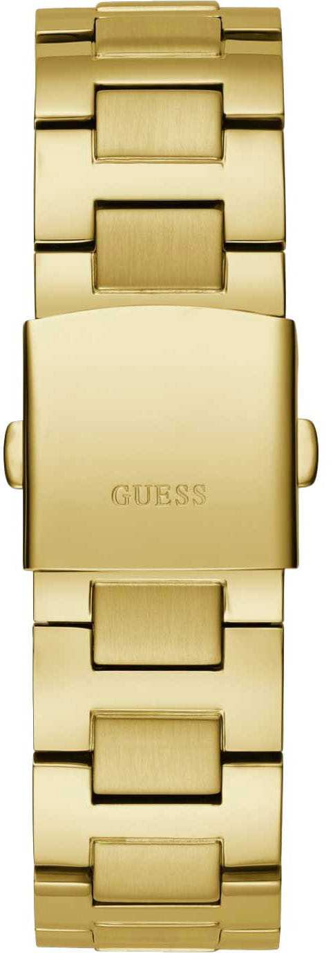 Мужские наручные часы с минеральным стекломМинеральное стеклоМинеральное стекло представляет собой искусственно выращенный минерал кварца. Такое стекло отличается особой устойчивостью к повреждениям и царапинам. Уступает по некоторым качествам сапфировому стеклу. Guess Empire GW0489G2, кварцевый механизм с высокой точностью. Класс водозащиты: 50 метров, позволит защитить корпус от случайных брызг или капель дождя. Корпус часов изготовлен из стали с IP-покрытиемIP-покрытиеМетод ионного напыления. Демонстрирует повышенную устойчивость к истиранию, окислению и химическим веществам. Под воздействием высокого давления и температуры около 1500°C молекулы металла надёжно соединяются с частицами корпуса часов.. Стальной браслет на раскладной застёжкеРаскладная застёжкаТакой тип застёжки используется только на браслетах из металла. Она никогда не раскрывается полностью, происходит разделение на 2 и более частей. Раскладывающая застёжка снизит вероятность потери часов к минимуму. с IP-покрытиемIP-покрытиеМетод ионного напыления. Демонстрирует повышенную устойчивость к истиранию, окислению и химическим веществам. Под воздействием высокого давления и температуры около 1500°C молекулы металла надёжно соединяются с частицами корпуса часов.. Стрелки с люминесцентным покрытиемЛюминесцентное покрытиеПозволяет считывать показания времени в темноте. Производители наносят на стрелки, часовые индексы, безель или поверхность циферблата светонакопительный состав, дающий холодное свечение.. 12-ти и 24-х часовой формат времени, дата и день недели вынесены на отдельные циферблаты. Метки в виде штрихов и арабских цифр. Рифленая заводная головка с защитой.