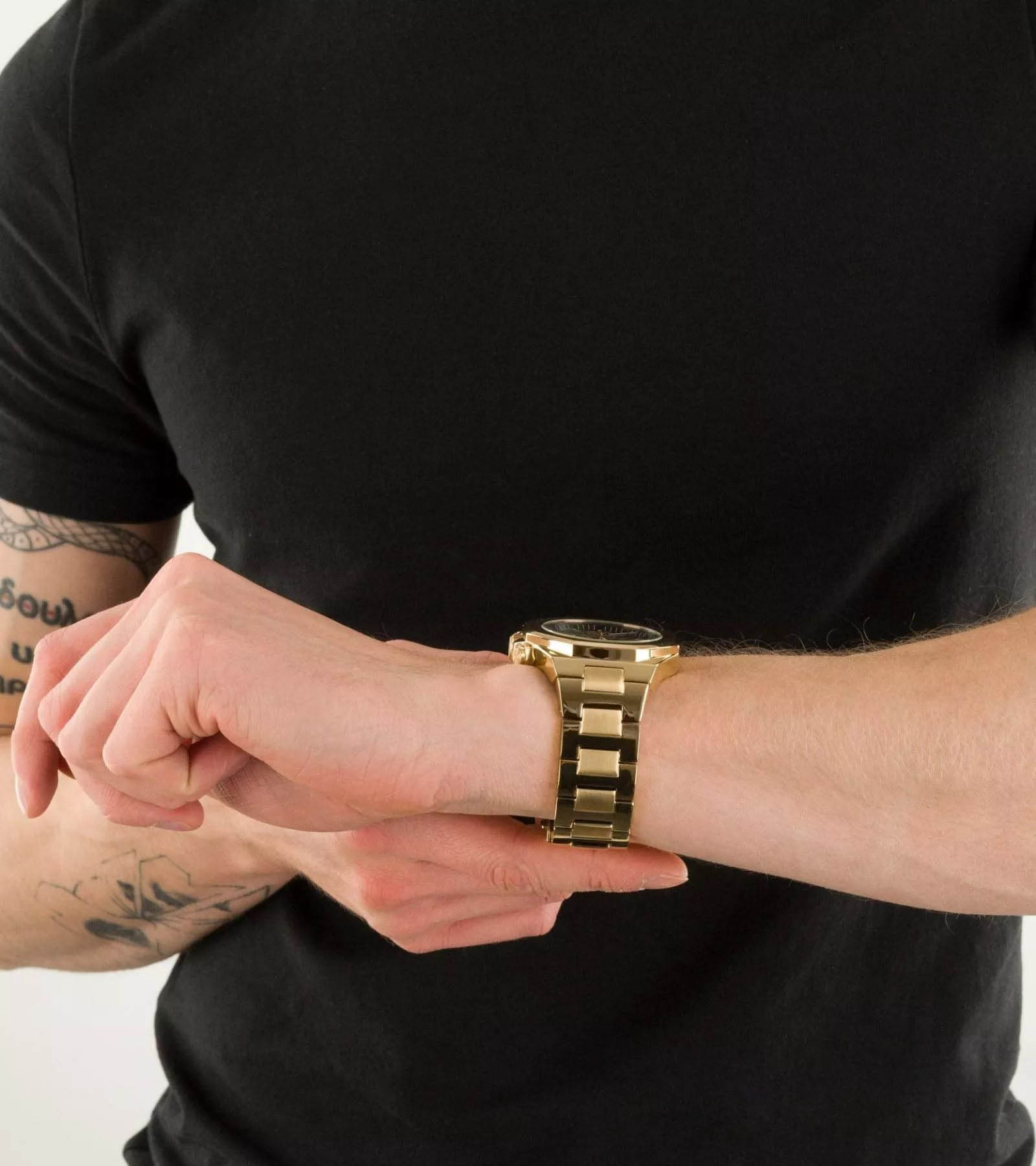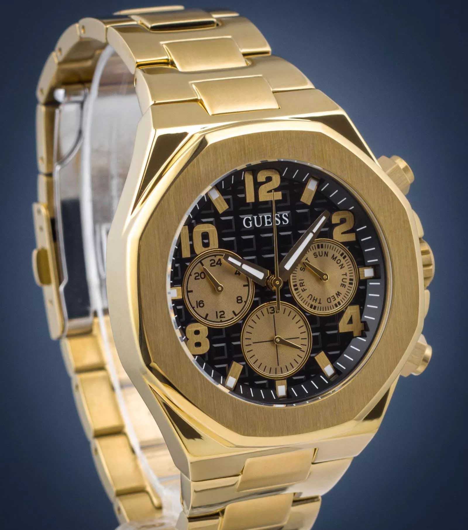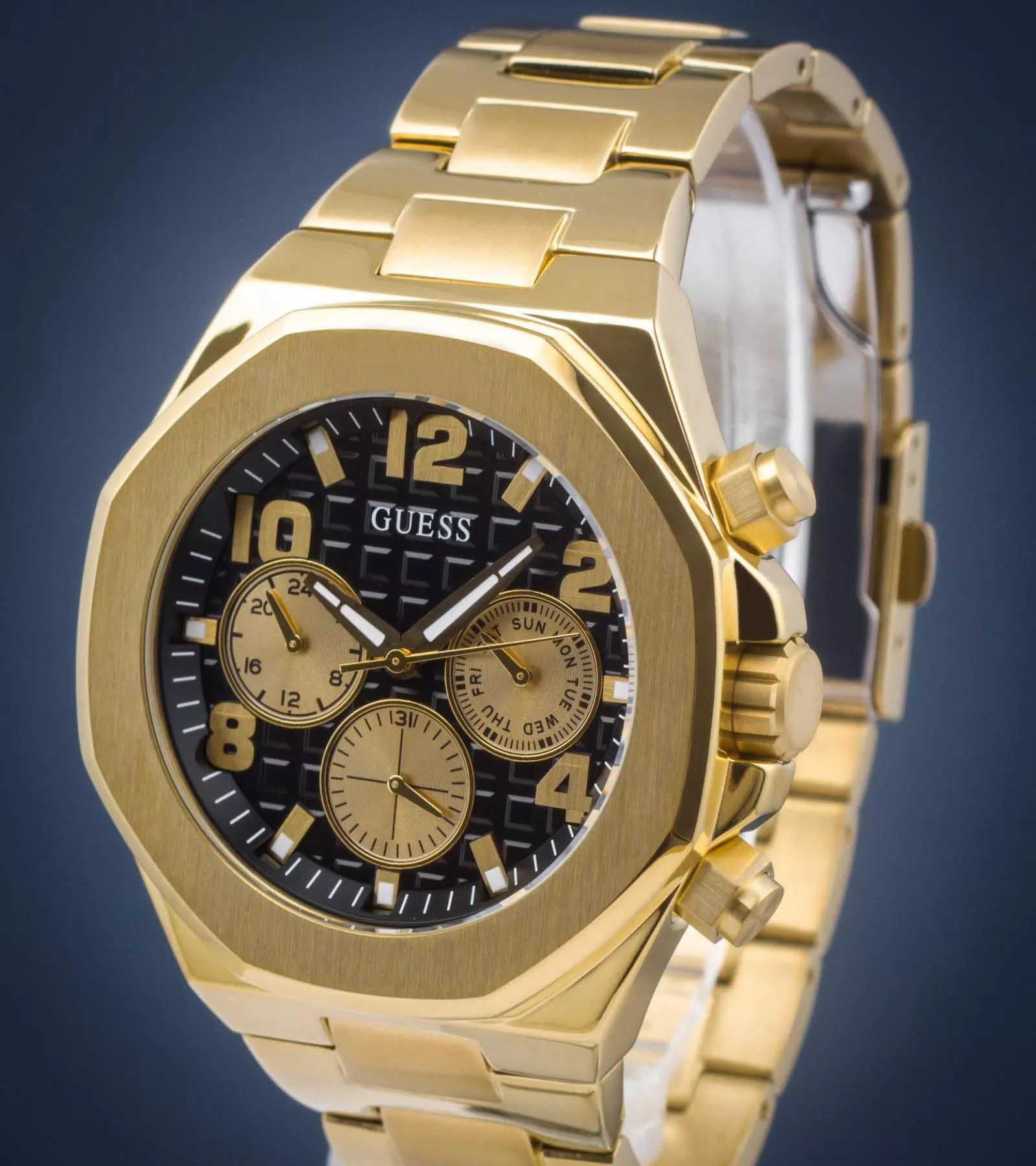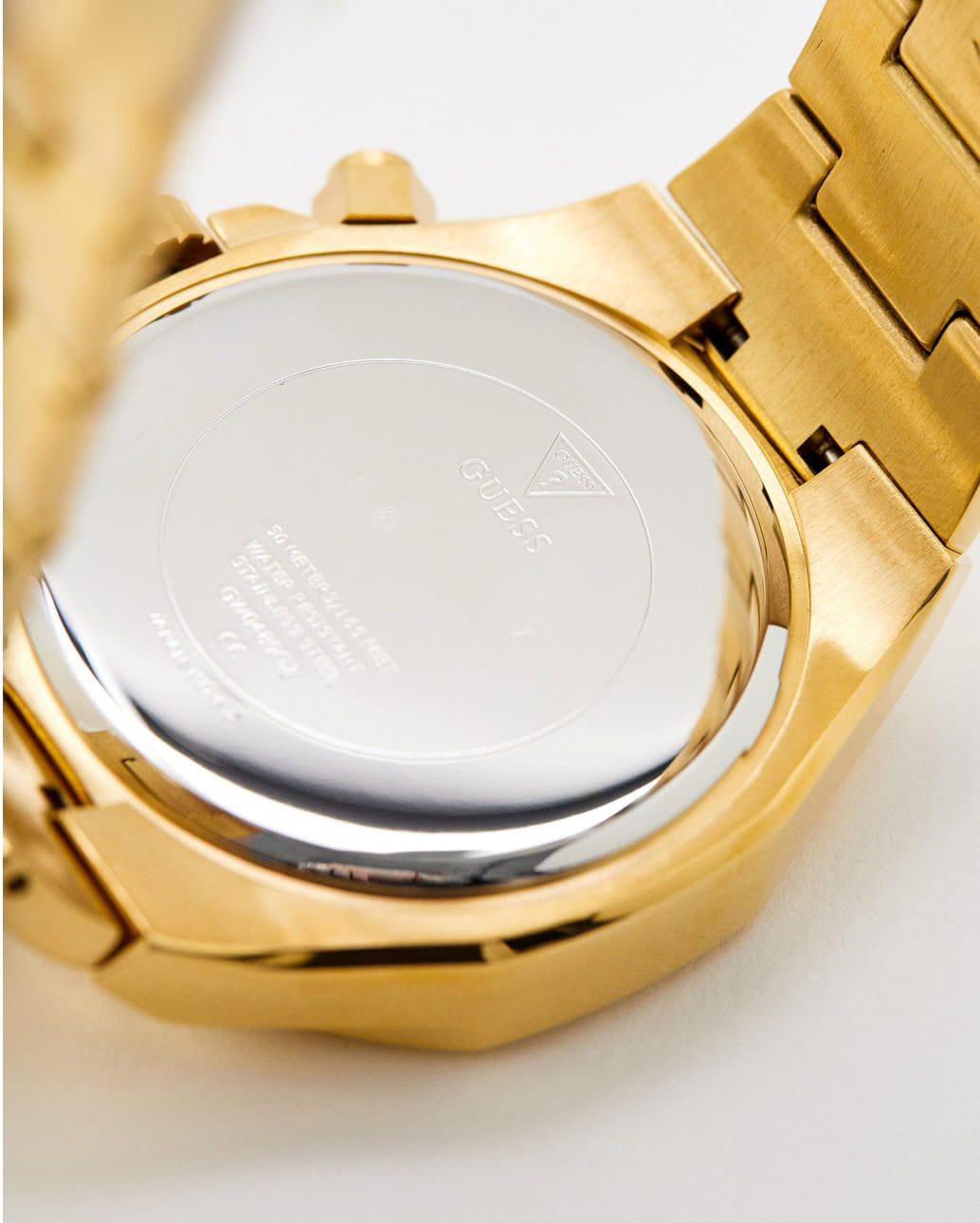 Мужские наручные часы с минеральным стекломМинеральное стеклоМинеральное стекло представляет собой искусственно выращенный минерал кварца. Такое стекло отличается особой устойчивостью к повреждениям и царапинам. Уступает по некоторым качествам сапфировому стеклу. Guess Empire GW0489G2, кварцевый механизм с высокой точностью. Класс водозащиты: 50 метров, позволит защитить корпус от случайных брызг или капель дождя. Корпус часов изготовлен из стали с IP-покрытиемIP-покрытиеМетод ионного напыления. Демонстрирует повышенную устойчивость к истиранию, окислению и химическим веществам. Под воздействием высокого давления и температуры около 1500°C молекулы металла надёжно соединяются с частицами корпуса часов.. Стальной браслет на раскладной застёжкеРаскладная застёжкаТакой тип застёжки используется только на браслетах из металла. Она никогда не раскрывается полностью, происходит разделение на 2 и более частей. Раскладывающая застёжка снизит вероятность потери часов к минимуму. с IP-покрытиемIP-покрытиеМетод ионного напыления. Демонстрирует повышенную устойчивость к истиранию, окислению и химическим веществам. Под воздействием высокого давления и температуры около 1500°C молекулы металла надёжно соединяются с частицами корпуса часов.. Стрелки с люминесцентным покрытиемЛюминесцентное покрытиеПозволяет считывать показания времени в темноте. Производители наносят на стрелки, часовые индексы, безель или поверхность циферблата светонакопительный состав, дающий холодное свечение.. 12-ти и 24-х часовой формат времени, дата и день недели вынесены на отдельные циферблаты. Метки в виде штрихов и арабских цифр. Рифленая заводная головка с защитой.