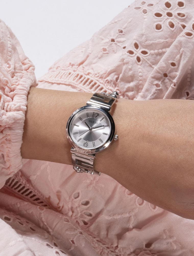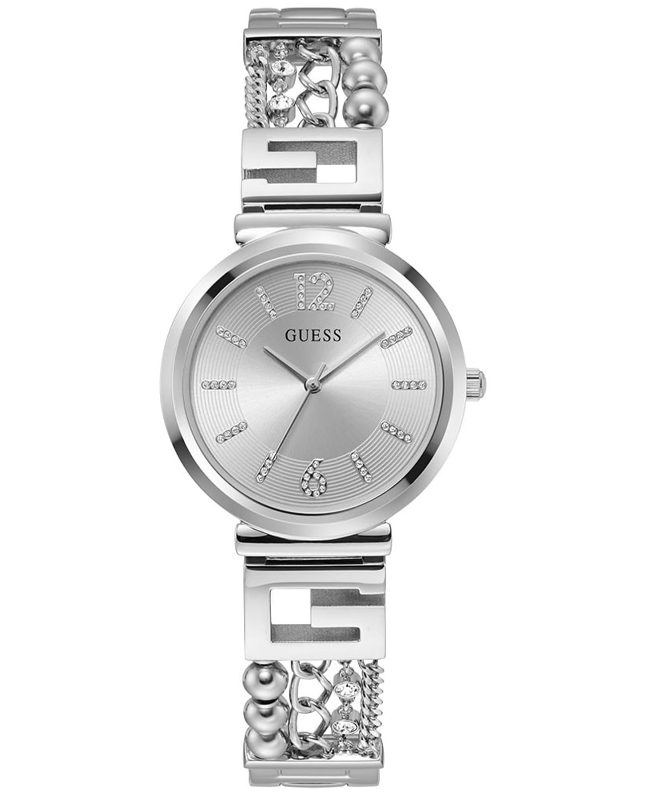 Женские кварцевые наручные часы с минеральным стекломМинеральное стеклоМинеральное стекло представляет собой искусственно выращенный минерал кварца. Такое стекло отличается особой устойчивостью к повреждениям и царапинам. Уступает по некоторым качествам сапфировому стеклу. Guess G Cluster GW0545L1, кварцевый механизм с высокой точностью. Класс водозащиты: 30 метров, позволит защитить корпус от случайных брызг или капель дождя. Корпус часов изготовлен из стали. Стальной браслет на ювелирной застёжке. Циферблат инкрустирован кристаллами.