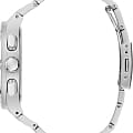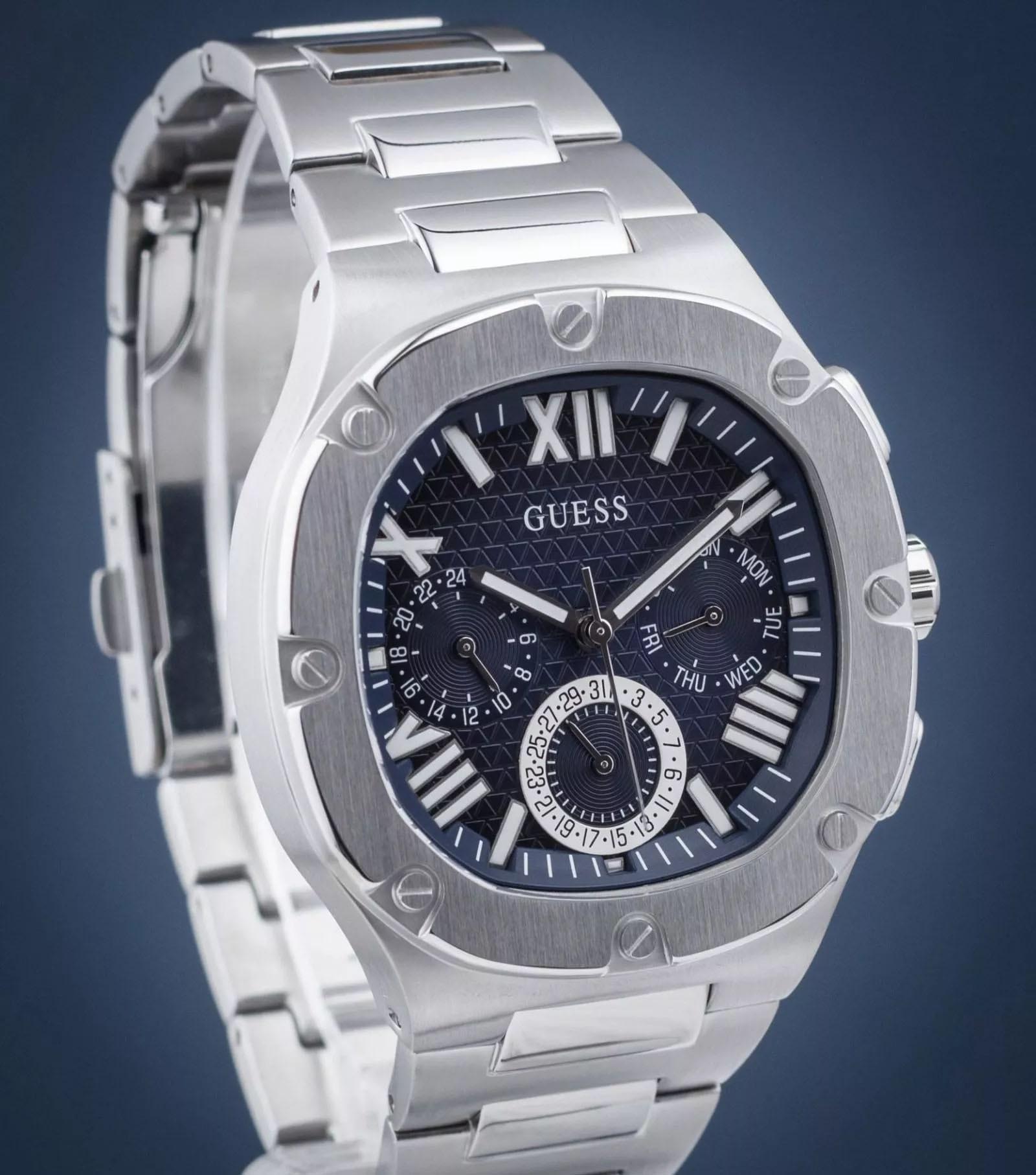 Мужские наручные часы Guess Headline GW0572G1 с минеральным стекломМинеральное стеклоМинеральное стекло представляет собой искусственно выращенный минерал кварца. Такое стекло отличается особой устойчивостью к повреждениям и царапинам. Уступает по некоторым качествам сапфировому стеклу., кварцевый механизм с высокой точностью. Класс водозащиты: 50 метров, позволит защитить корпус от случайных брызг или капель дождя. Стрелки с люминесцентным покрытиемЛюминесцентное покрытиеПозволяет считывать показания времени в темноте. Производители наносят на стрелки, часовые индексы, безель или поверхность циферблата светонакопительный состав, дающий холодное свечение.. Корпус часов и безельБезельВнешний ободок, закрепляющий стекло. В спортивных часах так называется поворотное кольцо с делениями на циферблате, выполняет роль таймера – замеряет отрезки времени на шкале. Неподвижный безель – элемент декора. Однонаправленно вращающийся безель на дайверских часах позволяет фиксировать моменты погружения и выныривания на поверхность. изготовлены из стали. Стальной браслет на раскладной застёжкеРаскладная застёжкаТакой тип застёжки используется только на браслетах из металла. Она никогда не раскрывается полностью, происходит разделение на 2 и более частей. Раскладывающая застёжка снизит вероятность потери часов к минимуму.. Рифленая заводная головка. Гильошированный циферблат. 24-х часовой формат времени, число и день недели отображаются на отдельных циферблатах. Метки в виде римских цифр и штрихов.