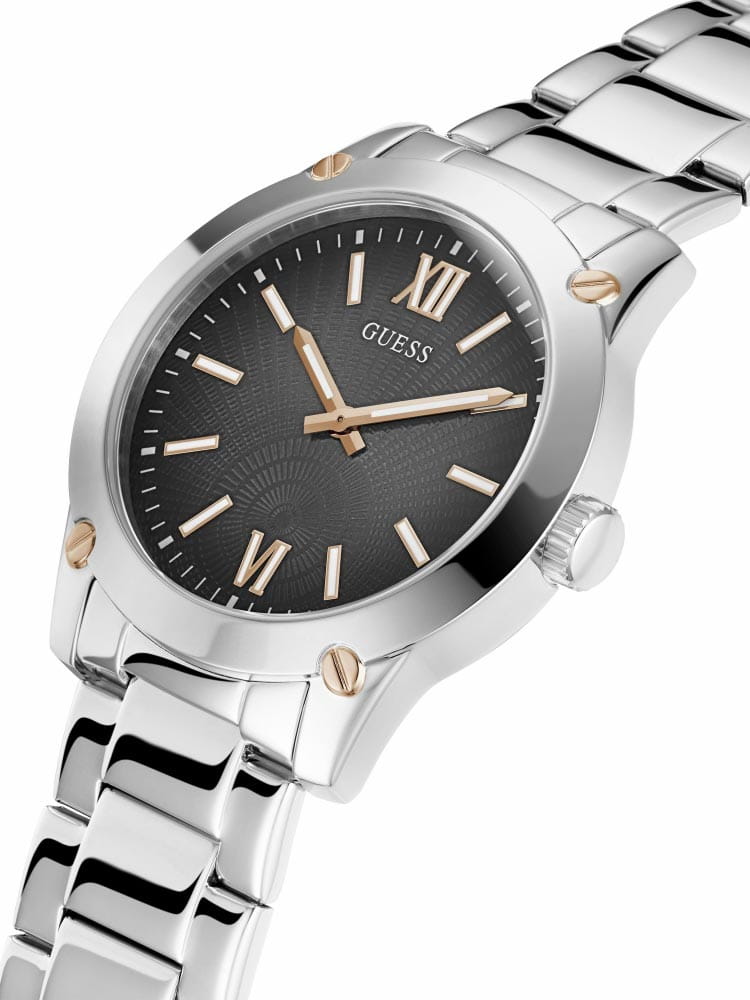 Мужские наручные часы Guess Crescent GW0574G1 с минеральным стекломМинеральное стеклоМинеральное стекло представляет собой искусственно выращенный минерал кварца. Такое стекло отличается особой устойчивостью к повреждениям и царапинам. Уступает по некоторым качествам сапфировому стеклу., кварцевый механизм с высокой точностью. Класс водозащиты: 50 метров, позволит защитить корпус от случайных брызг или капель дождя. Корпус часов и безельБезельВнешний ободок, закрепляющий стекло. В спортивных часах так называется поворотное кольцо с делениями на циферблате, выполняет роль таймера – замеряет отрезки времени на шкале. Неподвижный безель – элемент декора. Однонаправленно вращающийся безель на дайверских часах позволяет фиксировать моменты погружения и выныривания на поверхность. изготовлены из стали. Стальной браслет на раскладной застёжкеРаскладная застёжкаТакой тип застёжки используется только на браслетах из металла. Она никогда не раскрывается полностью, происходит разделение на 2 и более частей. Раскладывающая застёжка снизит вероятность потери часов к минимуму.. Гильошированный циферблат. Метки в виде штрихов и римских цифр. Рифленая заводная головка. Стрелки с люминесцентным покрытиемЛюминесцентное покрытиеПозволяет считывать показания времени в темноте. Производители наносят на стрелки, часовые индексы, безель или поверхность циферблата светонакопительный состав, дающий холодное свечение..