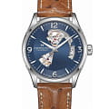 Мужские часы-скелетоны Hamilton Jazzmaster Open Heart Auto H32705041 с автоматическим механизмом Н-10. Корпус часов изготовлен из нержавеющей стали. Стрелки и метки с люминесцентным покрытиемЛюминесцентное покрытиеПозволяет считывать показания времени в темноте. Производители наносят на стрелки, часовые индексы, безель или поверхность циферблата светонакопительный состав, дающий холодное свечение.. Сапфировое стеклоСапфировое стеклоПрочный и надёжный материал из кристалла сапфира синтетического происхождения, характеризующийся особой твёрдостью и устойчивостью к царапинам и повреждениям. с антибликовым покрытием. Практичный кожаный ремешок с раскладной застёжкойРаскладная застёжкаТакой тип застёжки используется только на браслетах из металла. Она никогда не раскрывается полностью, происходит разделение на 2 и более частей. Раскладывающая застёжка снизит вероятность потери часов к минимуму.. Уровень влагозащиты: 50 метров, позволит защитить корпус от случайных брызг или капель дождя.