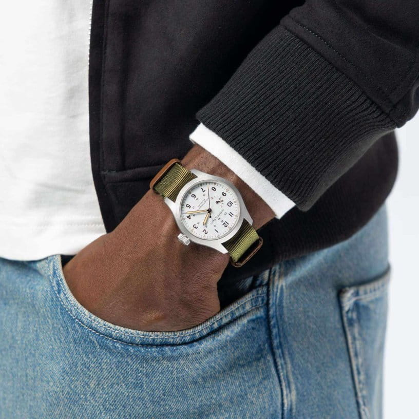 Мужские наручные часы Hamilton Khaki Field Mechanical Power Reserve 40mm H69509910 сочетают в себе спортивный стиль и элегантный дизайн. Модель обладает круглым корпусом диаметром 40 мм, изготовленным из нержавеющей стали, что обеспечивает высокую устойчивость к внешним воздействиям. Изысканный ремешок выполнен из ткани со стандартной застежкой, гарантирующей комфортное ношение и безопасность. Лаконичный циферблат оснащен крупными цифрами и стрелками с люминесцентным покрытиемЛюминесцентное покрытиеПозволяет считывать показания времени в темноте. Производители наносят на стрелки, часовые индексы, безель или поверхность циферблата светонакопительный состав, дающий холодное свечение. Super-LumiNova®, обеспечивающим превосходную видимость в темноте. Для защиты используется сапфировое стеклоСапфировое стеклоПрочный и надёжный материал из кристалла сапфира синтетического происхождения, характеризующийся особой твёрдостью и устойчивостью к царапинам и повреждениям., которое эффективно противостоит царапинам и имеет антибликовое покрытиеАнтибликовое покрытиеСлой оксида металла в 0,13-0,3 микрон, благодаря которому стекло часов не бликует и не отражает свет. Антибликовое покрытие уменьшает отражение света в 10 раз, обеспечивая отличную читаемость показателей циферблата.. Часы работают с помощью механизма H-23. Механизм с пружиной баланса Nivachron™Nivachron™Специально разработанный инновационный сплав Nivachron™ повышает устойчивость часов к воздействию магнитных полей. гарантирует точность хода, устойчивость к магнитным полям. На циферблате также буквы «F» для обозначения полного заряда и «E» для обозначения пустого заряда, что подчеркивает эту исключительную и практичную функцию. Водонепроницаемость часов достигает 10 атмосфер (100 метров), делающая их подходящими для повседневного использования и активного отдыха. Это сочетание высокой прочности, точности и изысканного дизайна для уверенных в себе мужчин.