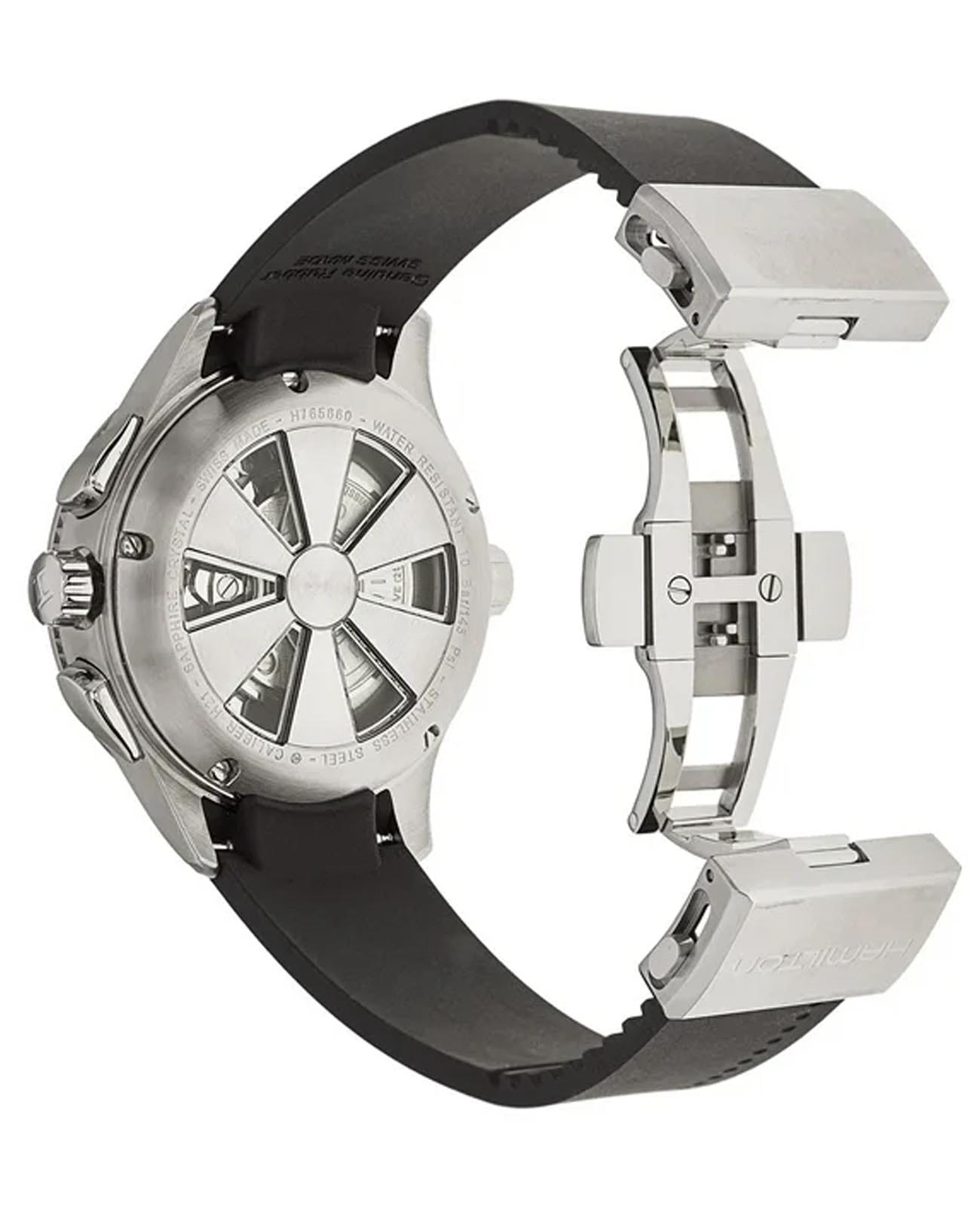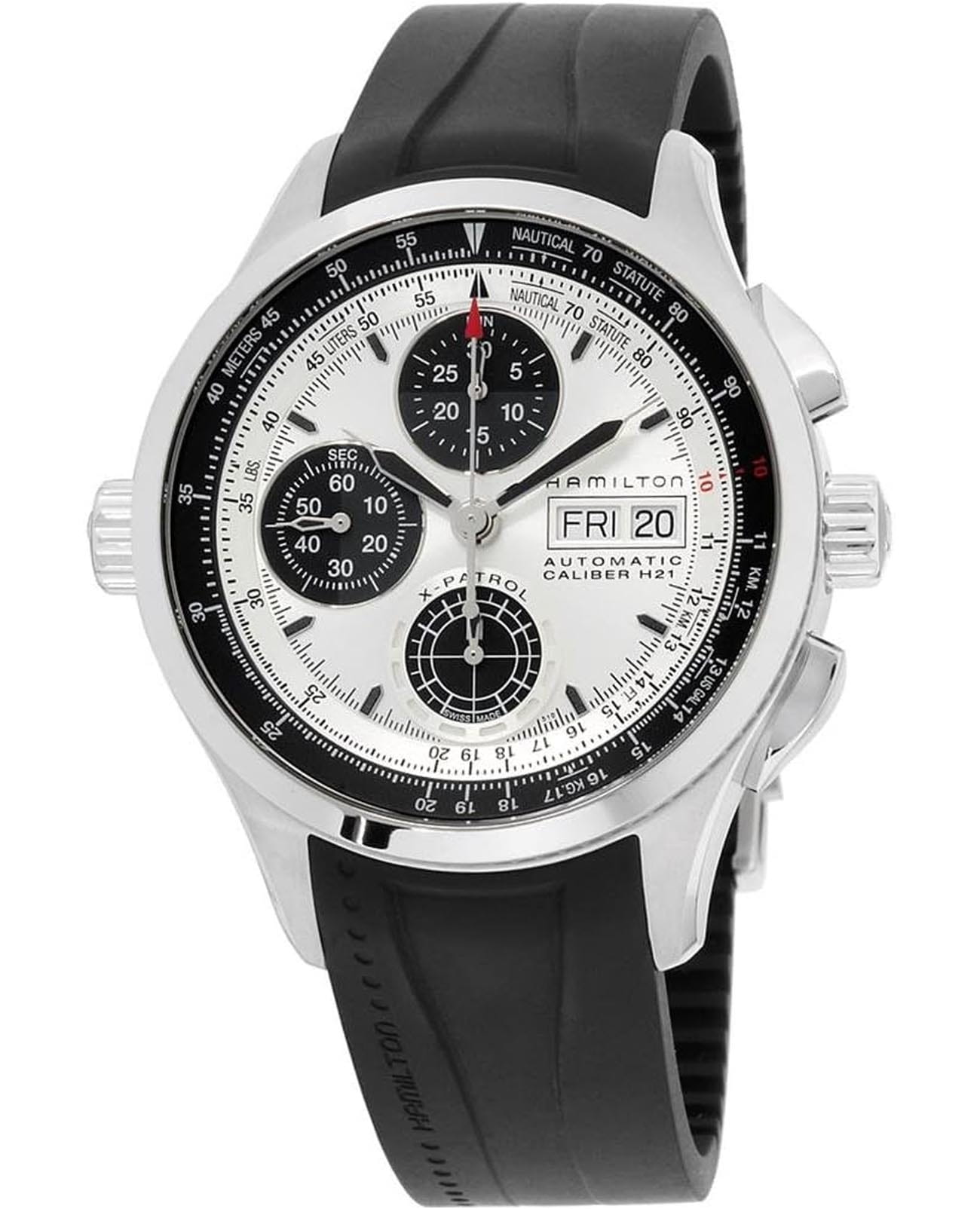 Мужские механические швейцарские часы-хронографХронографФункция позволяет измерять отрезки времени с особой точностью: часы, минуты, секунды. Верным признаком хронографа является наличие на циферблате 3 дополнительных окошек-счётчиков. с автоподзаводом Hamilton Khaki Aviation X-Patrol Auto Chrono H76566351. Корпус часов изготовлен из нержавеющей стали. Сапфировое стеклоСапфировое стеклоПрочный и надёжный материал из кристалла сапфира синтетического происхождения, характеризующийся особой твёрдостью и устойчивостью к царапинам и повреждениям. устойчивое к мелким механическим повреждениям. Стрелки и метки с люминесцентным покрытиемЛюминесцентное покрытиеПозволяет считывать показания времени в темноте. Производители наносят на стрелки, часовые индексы, безель или поверхность циферблата светонакопительный состав, дающий холодное свечение.. Класс водозащиты: 100 метров, позволит плавать, нырять и заниматься другими водными видами спорта. Каучуковый ремешок на застёжке-бабочке с кнопкамиЗастёжка "бабочка"Такой вид застёжки дополняется предохранителями, помогающими избежать случайного раскрытия браслета. Обладают изящным исполнением. . Окошки дня недели и даты находятся в положении 3 часа.