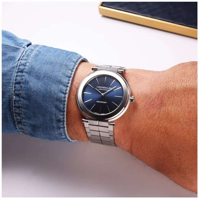 Мужские механические часы с ручным заводом Herbelin Newport Slim 11222B15S – отражающий идеальное сочетание современного дизайна, надёжности и функциональности. Элегантный облик станет превосходным завершением образа, наделив его индивидуальным характером. Корпус из нержавеющей стали 316L идеально сбалансирован и элегантен. Сапфировое стеклоСапфировое стеклоПрочный и надёжный материал из кристалла сапфира синтетического происхождения, характеризующийся особой твёрдостью и устойчивостью к царапинам и повреждениям. защищает циферблат от царапин и устойчивое к механическим повреждениям. Изысканный cтальной браслет из нержавеющей стали на застёжке-бабочке с кнопкамиЗастёжка "бабочка"Такой вид застёжки дополняется предохранителями, помогающими избежать случайного раскрытия браслета. Обладают изящным исполнением.  обеспечивает комфортное ношение. Водозащита 30 метров, позволит защитить корпус от случайных брызг или капель дождя. Эта модель – отличный выбор для тех, кто ищет сочетание стиля, качества и функциональности. Часы станут не только полезным аксессуаром, но и выразительным элементом вашего имиджа.