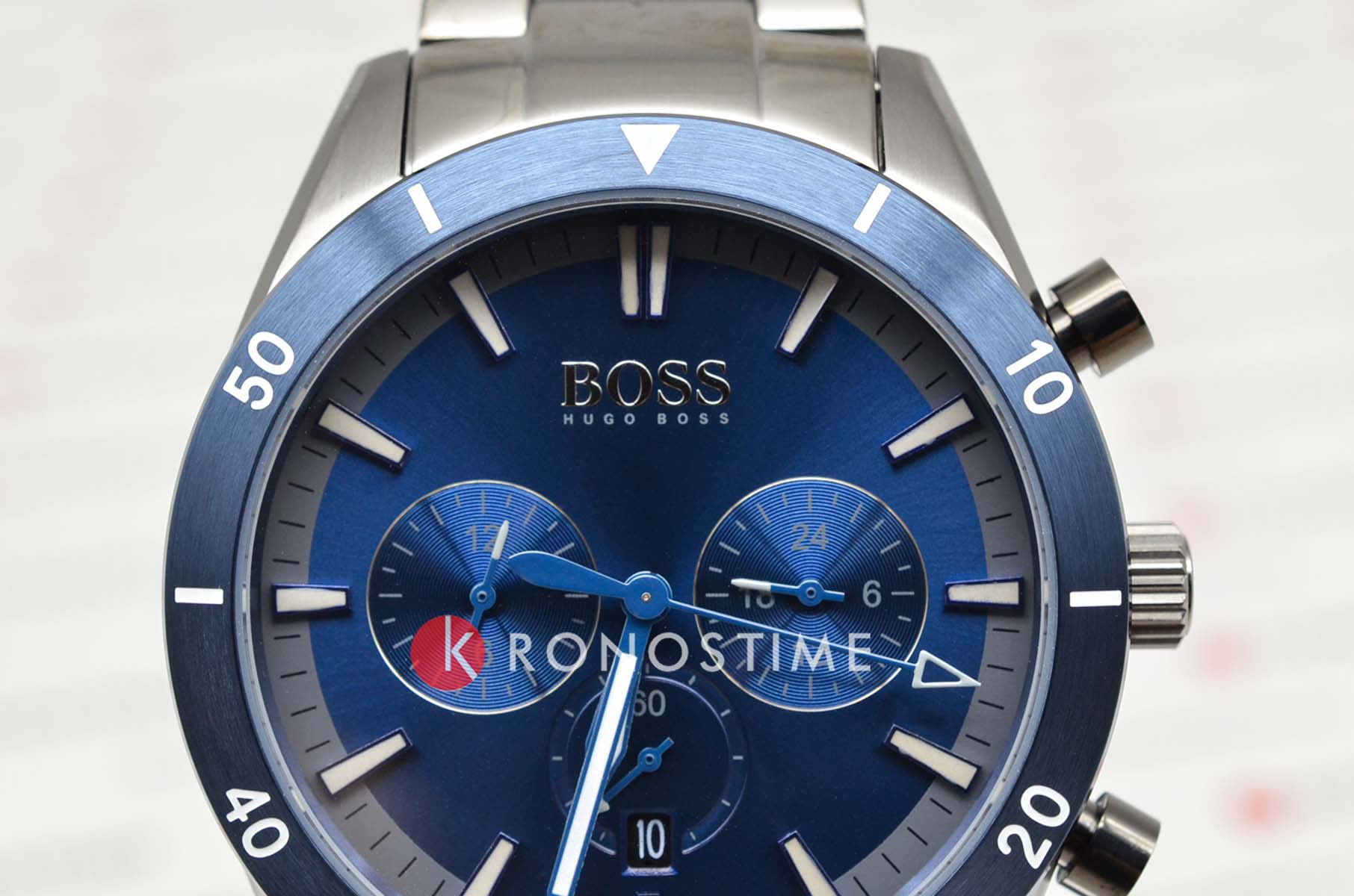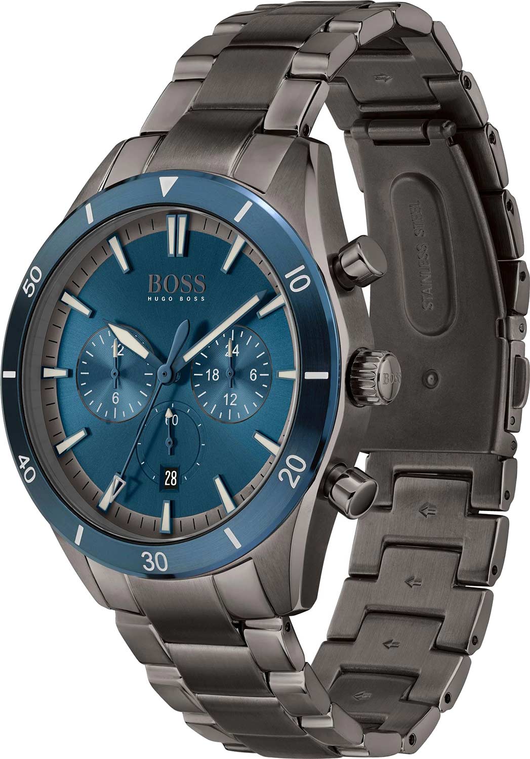 Мужские часы Hugo Boss HB1513863 коллекции Santiago представлены в круглом 44-мм корпусе из нержавеющей стали 316L с  IP-покрытиемIP-покрытиеМетод ионного напыления. Демонстрирует повышенную устойчивость к истиранию, окислению и химическим веществам. Под воздействием высокого давления и температуры около 1500°C молекулы металла надёжно соединяются с частицами корпуса часов.. Оснащены кварцевым механизмом с функциями хронографаХронографФункция позволяет измерять отрезки времени с особой точностью: часы, минуты, секунды. Верным признаком хронографа является наличие на циферблате 3 дополнительных окошек-счётчиков., секундомеромСекундомерСекундоме́р — прибор, способный измерять интервалы времени с точностью до долей секунды. и тахиметрической шкалойТахиметрРазмеченная шкала, располагается на ободке или безеле часов. Тахиметр позволяет рассчитать скорость на определённом участке пути, расстояние измеряется в километрах или милях., а также индикацией даты. Синий циферблат с метками в виде штрихов защищен устойчивым к царапинам минеральным стекломМинеральное стеклоМинеральное стекло представляет собой искусственно выращенный минерал кварца. Такое стекло отличается особой устойчивостью к повреждениям и царапинам. Уступает по некоторым качествам сапфировому стеклу.. Стальной браслет с IP-покрытиемIP-покрытиеМетод ионного напыления. Демонстрирует повышенную устойчивость к истиранию, окислению и химическим веществам. Под воздействием высокого давления и температуры около 1500°C молекулы металла надёжно соединяются с частицами корпуса часов. дополнен раскладной застёжкойРаскладная застёжкаТакой тип застёжки используется только на браслетах из металла. Она никогда не раскрывается полностью, происходит разделение на 2 и более частей. Раскладывающая застёжка снизит вероятность потери часов к минимуму.. Водонепроницаемость 50 метров (5 ATM) обеспечивает защиту от брызг и дождя.