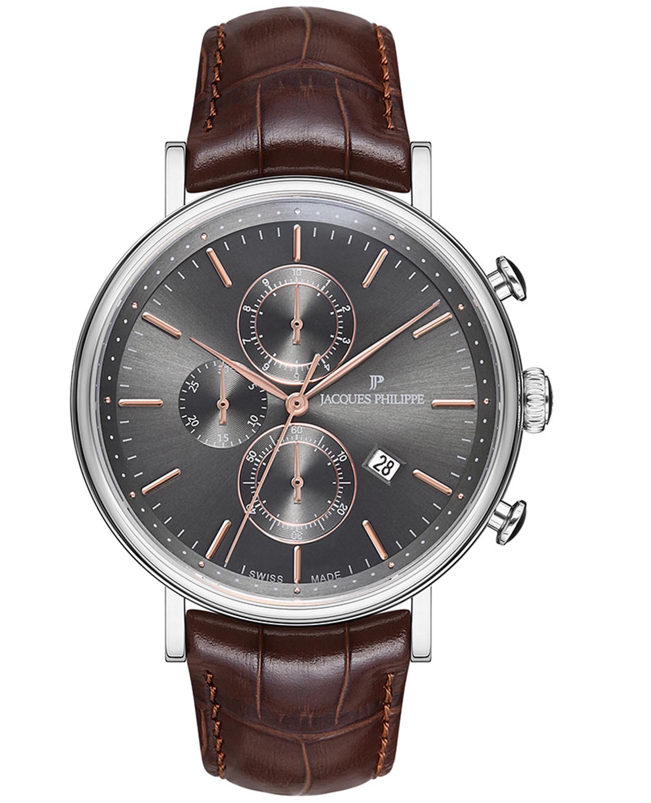Швейцарские мужские часы-хронографХронографФункция позволяет измерять отрезки времени с особой точностью: часы, минуты, секунды. Верным признаком хронографа является наличие на циферблате 3 дополнительных окошек-счётчиков. Jacques Philippe Aviator JPQGC021143, кварцевый механизм с высокой точностью. Сапфировое стеклоСапфировое стеклоПрочный и надёжный материал из кристалла сапфира синтетического происхождения, характеризующийся особой твёрдостью и устойчивостью к царапинам и повреждениям. устойчивое к появлению царапин, обладающее высокой прозрачностью. Класс водозащиты: 50 метров, позволит защитить корпус от случайных брызг или капель дождя. Окошко даты на отметке 4 часа. Корпус часов изготовлен из нержавеющей стали. Кожаный ремешок с классической застежкой.