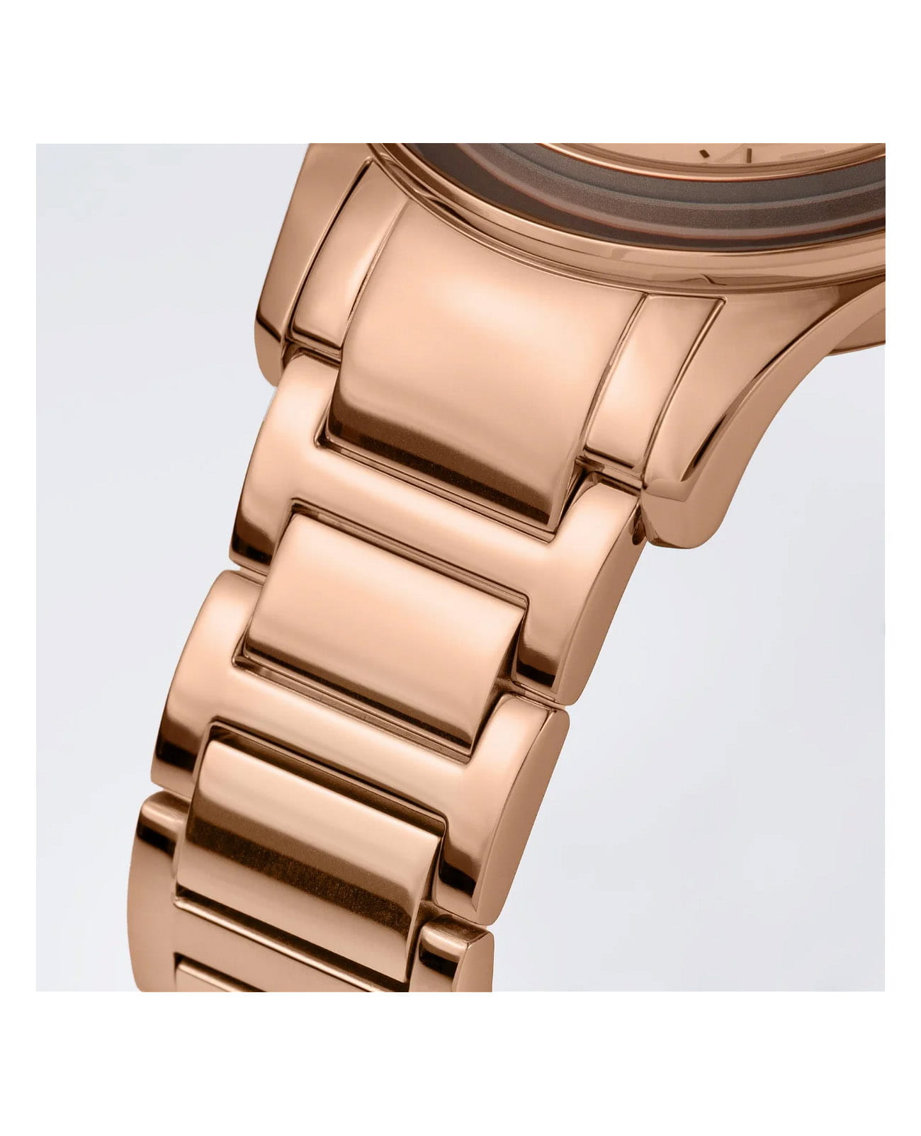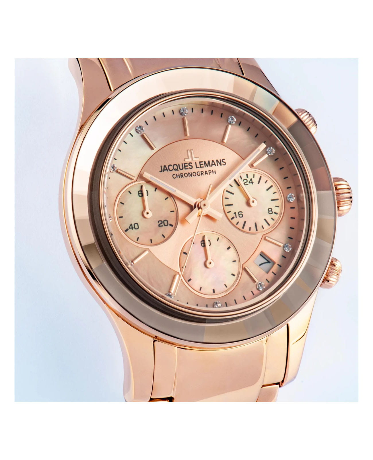 Женские часы-хронографХронографФункция позволяет измерять отрезки времени с особой точностью: часы, минуты, секунды. Верным признаком хронографа является наличие на циферблате 3 дополнительных окошек-счётчиков. c секундомеромСекундомерСекундоме́р — прибор, способный измерять интервалы времени с точностью до долей секунды. Jacques Lemans Venice 1-2151i, кварцевый механизм с высокой точностью. Минеральное стеклоМинеральное стеклоМинеральное стекло представляет собой искусственно выращенный минерал кварца. Такое стекло отличается особой устойчивостью к повреждениям и царапинам. Уступает по некоторым качествам сапфировому стеклу. устойчивое к мелким механическим повреждениям. Корпус из нержавеющей стали с PVDPVDУльтратонкое покрытие наносится в технике вакуумного напыления, сочетает в себе нитрид титана особой прочности со слоем золота или оксида хрома. Несёт в себе декоративную или защитную функцию. покрытием. Широкий безельБезельВнешний ободок, закрепляющий стекло. В спортивных часах так называется поворотное кольцо с делениями на циферблате, выполняет роль таймера – замеряет отрезки времени на шкале. Неподвижный безель – элемент декора. Однонаправленно вращающийся безель на дайверских часах позволяет фиксировать моменты погружения и выныривания на поверхность. с гранями. На циферблате расположены три дополнительных индикатора. Окошко даты находится в положении между 4 и 5 часов. Стрелки с люминесцентным покрытиемЛюминесцентное покрытиеПозволяет считывать показания времени в темноте. Производители наносят на стрелки, часовые индексы, безель или поверхность циферблата светонакопительный состав, дающий холодное свечение.. Каждая накладная риска украшена кристаллом Swarowski. Класс водозащиты: 50 метров, позволит защитить корпус от случайных брызг или капель дождя. Браслет из нержавеющей стали с PVDPVDУльтратонкое покрытие наносится в технике вакуумного напыления, сочетает в себе нитрид титана особой прочности со слоем золота или оксида хрома. Несёт в себе декоративную или защитную функцию. покрытием на раскладной застёжкеРаскладная застёжкаТакой тип застёжки используется только на браслетах из металла. Она никогда не раскрывается полностью, происходит разделение на 2 и более частей. Раскладывающая застёжка снизит вероятность потери часов к минимуму..
