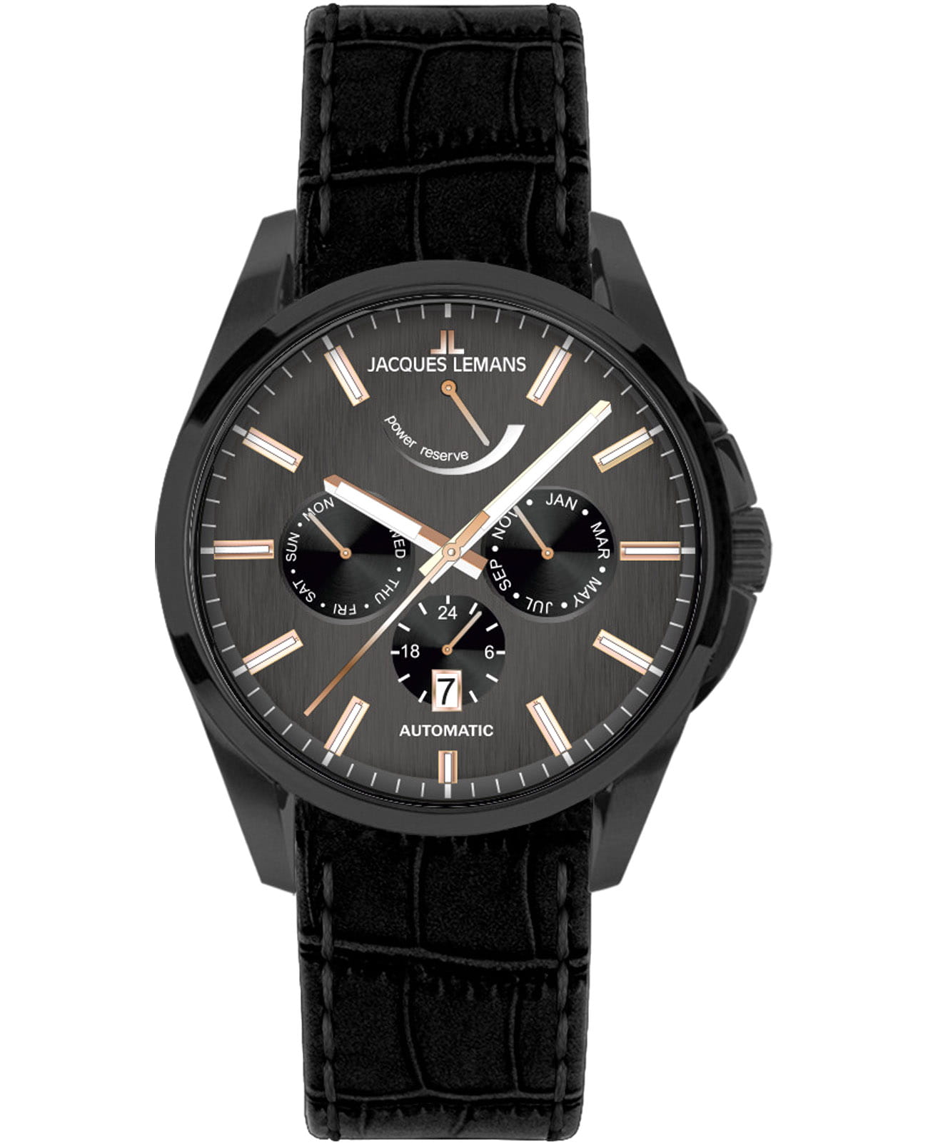 Мужские механические часы с автоподзаводом Jacques Lemans 1-2204K – лаконичная красота и изысканная элегантность. Оригинальная модель с классическим оформлением станет превосходным завершением образа, наделив его индивидуальным характером. Корпус выполнен из нержавеющей стали с PVD-покрытиемPVDУльтратонкое покрытие наносится в технике вакуумного напыления, сочетает в себе нитрид титана особой прочности со слоем золота или оксида хрома. Несёт в себе декоративную или защитную функцию. черного цвета, диаметром 44 мм, что обеспечивает долговечность и утончённый внешний вид. Минеральное стеклоМинеральное стеклоМинеральное стекло представляет собой искусственно выращенный минерал кварца. Такое стекло отличается особой устойчивостью к повреждениям и царапинам. Уступает по некоторым качествам сапфировому стеклу. с сапфировым напылением защищает циферблат от царапин. Кожаный ремешок на стандартной застёжке обеспечивает комфортное ношение. Водозащита 100 метров позволит плавать, нырять и заниматься другими водными видами спорта. Стрелки и метки с люминесцентным покрытиемЛюминесцентное покрытиеПозволяет считывать показания времени в темноте. Производители наносят на стрелки, часовые индексы, безель или поверхность циферблата светонакопительный состав, дающий холодное свечение. позволяющие легко определять время даже в темноте. 12-ти и 24-х часовой формат времени. День недели и месяц вынесены на отдельные циферблаты. Окошко даты находится в положении 6 часов. Рифленая заводная головка с защитой. Это аксессуар для мужчины, который ценит классический стиль и функциональность.
