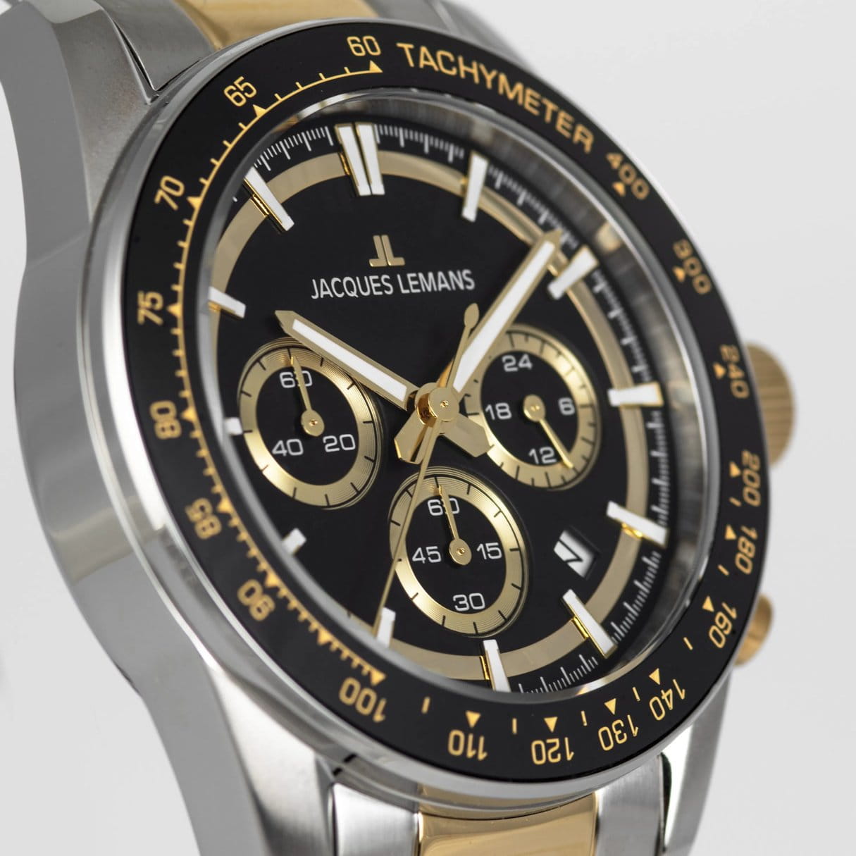 Мужские кварцевые часы-хронографХронографФункция позволяет измерять отрезки времени с особой точностью: часы, минуты, секунды. Верным признаком хронографа является наличие на циферблате 3 дополнительных окошек-счётчиков. с секундомеромСекундомерСекундоме́р — прибор, способный измерять интервалы времени с точностью до долей секунды. Jacques Lemans 1-2207D – лаконичная красота и изысканная элегантность. Оригинальная модель с классическим оформлением станет превосходным завершением образа, наделив его индивидуальным характером. Корпус выполнен из нержавеющей стали серебристого цвета, диаметром 43 мм, что обеспечивает долговечность и утончённый внешний вид. Минеральное стеклоМинеральное стеклоМинеральное стекло представляет собой искусственно выращенный минерал кварца. Такое стекло отличается особой устойчивостью к повреждениям и царапинам. Уступает по некоторым качествам сапфировому стеклу. повышенной прочности Crystex защищает циферблат от царапин. Неподвижный безельБезельВнешний ободок, закрепляющий стекло. В спортивных часах так называется поворотное кольцо с делениями на циферблате, выполняет роль таймера – замеряет отрезки времени на шкале. Неподвижный безель – элемент декора. Однонаправленно вращающийся безель на дайверских часах позволяет фиксировать моменты погружения и выныривания на поверхность. с PVD-покрытиемPVDУльтратонкое покрытие наносится в технике вакуумного напыления, сочетает в себе нитрид титана особой прочности со слоем золота или оксида хрома. Несёт в себе декоративную или защитную функцию. и тахиметромТахиметрРазмеченная шкала, располагается на ободке или безеле часов. Тахиметр позволяет рассчитать скорость на определённом участке пути, расстояние измеряется в километрах или милях.. Стальной браслет с частичным PVD-покрытиемPVDУльтратонкое покрытие наносится в технике вакуумного напыления, сочетает в себе нитрид титана особой прочности со слоем золота или оксида хрома. Несёт в себе декоративную или защитную функцию. на раскладной застёжке с фиксаторомРаскладная застёжкаТакой тип застёжки используется только на браслетах из металла. Она никогда не раскрывается полностью, происходит разделение на 2 и более частей. Раскладывающая застёжка снизит вероятность потери часов к минимуму. обеспечивает комфортное ношение Водозащита 200 метров позволит плавать, нырять и заниматься другими водными видами спорта. Стрелки и метки с люминесцентным покрытиемЛюминесцентное покрытиеПозволяет считывать показания времени в темноте. Производители наносят на стрелки, часовые индексы, безель или поверхность циферблата светонакопительный состав, дающий холодное свечение. позволяющие легко определять время даже в темноте. 12-ти и 24-х часовой формат времени. Окошко даты находится в положении между 4 и 5 часами. Рифленая заводная головка с защитой. Это аксессуар для мужчины, который ценит классический стиль и функциональность.