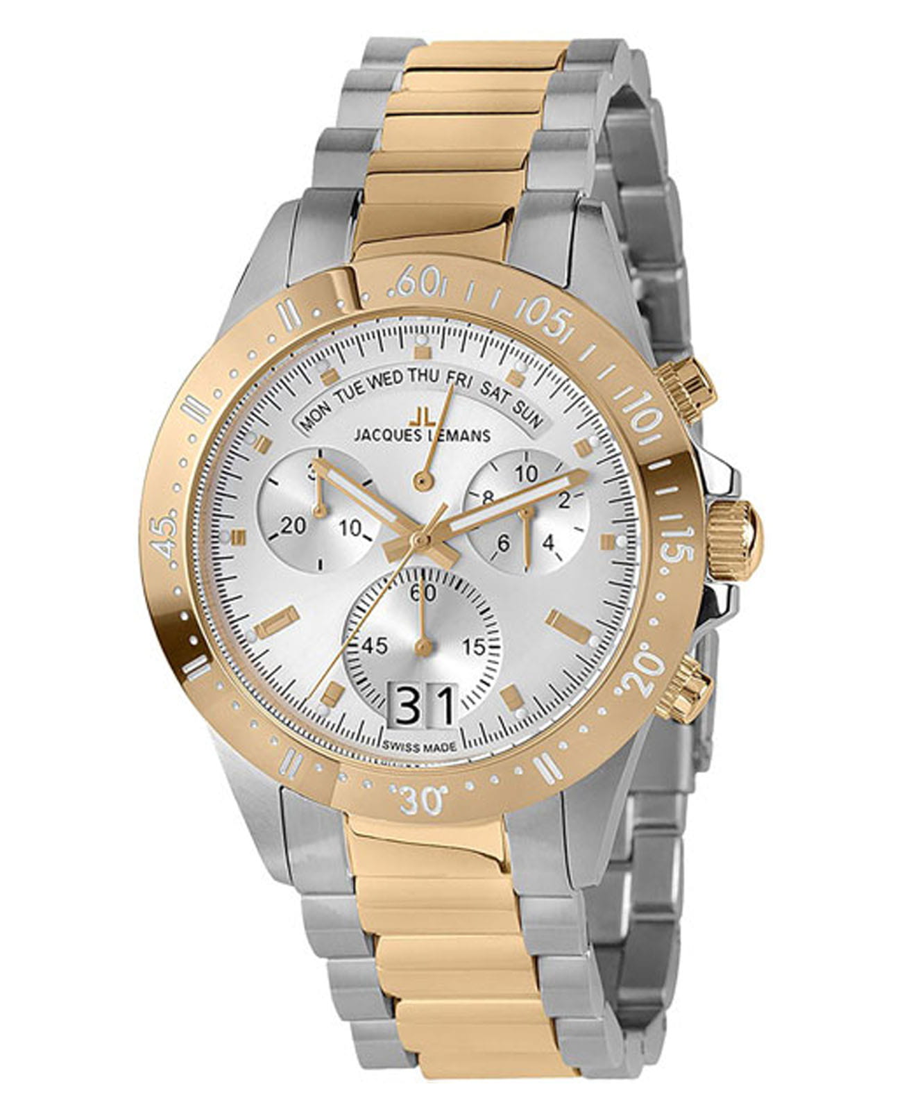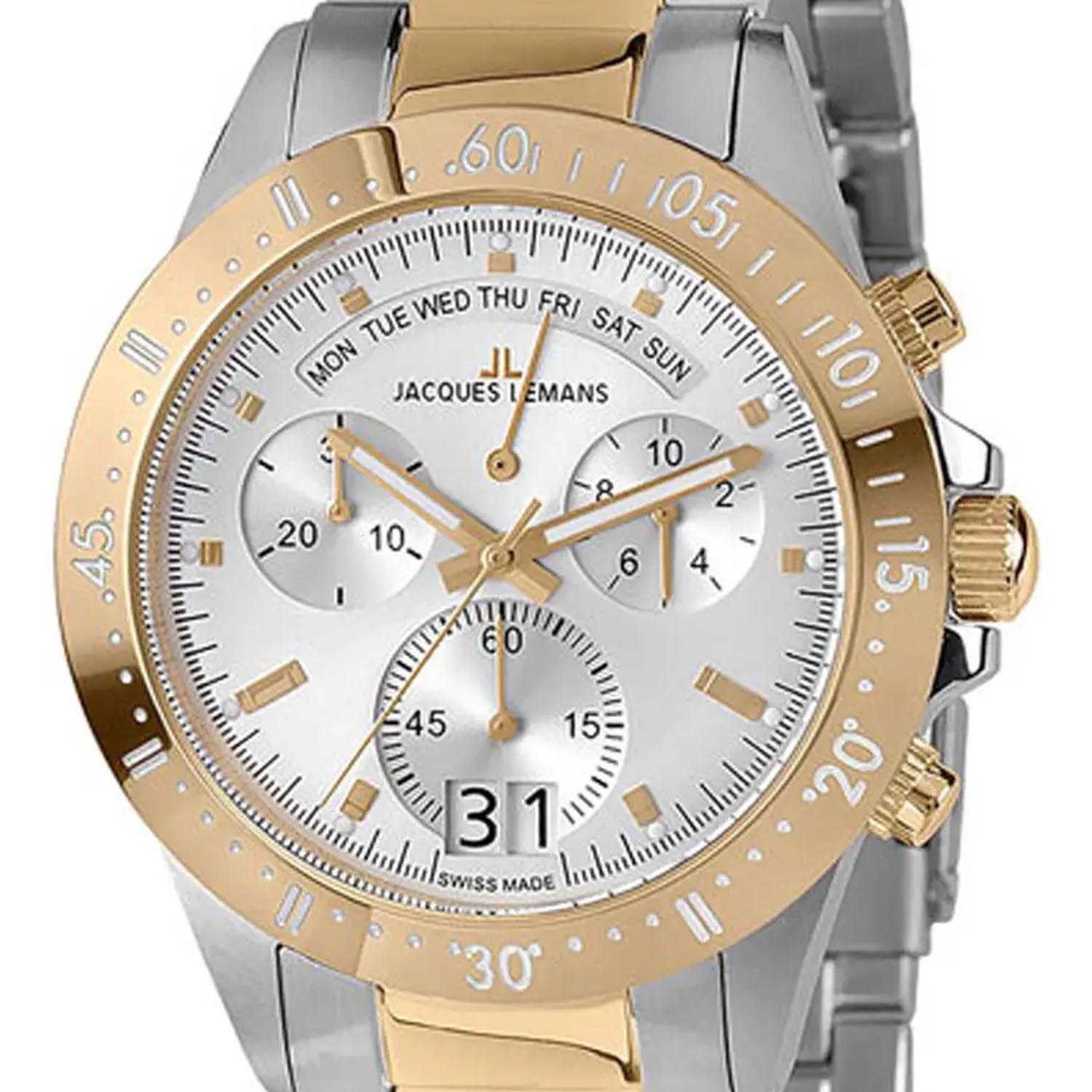 Мужские австрийские часы-хронографХронографФункция позволяет измерять отрезки времени с особой точностью: часы, минуты, секунды. Верным признаком хронографа является наличие на циферблате 3 дополнительных окошек-счётчиков. c секундомеромСекундомерСекундоме́р — прибор, способный измерять интервалы времени с точностью до долей секунды. Jacques Lemans Sport 40-10C, кварцевый механизм с высокой точностью. Минеральное стеклоМинеральное стеклоМинеральное стекло представляет собой искусственно выращенный минерал кварца. Такое стекло отличается особой устойчивостью к повреждениям и царапинам. Уступает по некоторым качествам сапфировому стеклу. устойчивое к мелким механическим повреждениям. Корпус часов изготовлен из стали. БезельБезельВнешний ободок, закрепляющий стекло. В спортивных часах так называется поворотное кольцо с делениями на циферблате, выполняет роль таймера – замеряет отрезки времени на шкале. Неподвижный безель – элемент декора. Однонаправленно вращающийся безель на дайверских часах позволяет фиксировать моменты погружения и выныривания на поверхность. с IP-покрытиемIP-покрытиеМетод ионного напыления. Демонстрирует повышенную устойчивость к истиранию, окислению и химическим веществам. Под воздействием высокого давления и температуры около 1500°C молекулы металла надёжно соединяются с частицами корпуса часов.. Стрелки с люминесцентным покрытиемЛюминесцентное покрытиеПозволяет считывать показания времени в темноте. Производители наносят на стрелки, часовые индексы, безель или поверхность циферблата светонакопительный состав, дающий холодное свечение.. Окошко даты находится в положении 6 часов. Класс водозащиты: 100 метров, позволит плавать, нырять и заниматься другими водными видами спорта. Стальной браслет с частичным IP-покрытиемIP-покрытиеМетод ионного напыления. Демонстрирует повышенную устойчивость к истиранию, окислению и химическим веществам. Под воздействием высокого давления и температуры около 1500°C молекулы металла надёжно соединяются с частицами корпуса часов. на раскладной застёжкеРаскладная застёжкаТакой тип застёжки используется только на браслетах из металла. Она никогда не раскрывается полностью, происходит разделение на 2 и более частей. Раскладывающая застёжка снизит вероятность потери часов к минимуму..