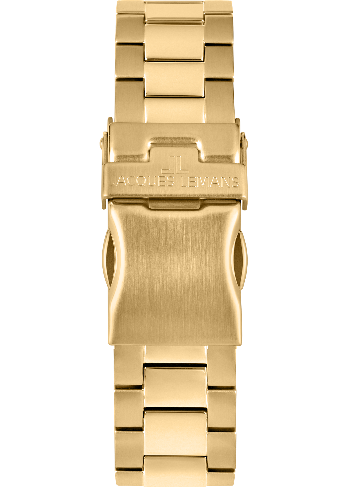 Женские наручные часы, выпущенные в честь 50-летия компании Jacques Lemans. Кварцевый механизм с высокой точностью. Минеральное стеклоМинеральное стеклоМинеральное стекло представляет собой искусственно выращенный минерал кварца. Такое стекло отличается особой устойчивостью к повреждениям и царапинам. Уступает по некоторым качествам сапфировому стеклу. устойчивое к появлению царапин, обладающее высокой прозрачностью. Окошко даты расположилось на трех часах. Стрелки и метки с люминесцентным покрытиемЛюминесцентное покрытиеПозволяет считывать показания времени в темноте. Производители наносят на стрелки, часовые индексы, безель или поверхность циферблата светонакопительный состав, дающий холодное свечение.. БезельБезельВнешний ободок, закрепляющий стекло. В спортивных часах так называется поворотное кольцо с делениями на циферблате, выполняет роль таймера – замеряет отрезки времени на шкале. Неподвижный безель – элемент декора. Однонаправленно вращающийся безель на дайверских часах позволяет фиксировать моменты погружения и выныривания на поверхность. с PVD-покрытиемPVDУльтратонкое покрытие наносится в технике вакуумного напыления, сочетает в себе нитрид титана особой прочности со слоем золота или оксида хрома. Несёт в себе декоративную или защитную функцию.. Класс водозащиты: 100 метров, позволит плавать, нырять и заниматься другими водными видами спорта. Корпус из нержавеющей стали с PVD-покрытиемPVDУльтратонкое покрытие наносится в технике вакуумного напыления, сочетает в себе нитрид титана особой прочности со слоем золота или оксида хрома. Несёт в себе декоративную или защитную функцию.. Браслет часов изготовлен из нержавеющей стали с PVD-покрытиемPVDУльтратонкое покрытие наносится в технике вакуумного напыления, сочетает в себе нитрид титана особой прочности со слоем золота или оксида хрома. Несёт в себе декоративную или защитную функцию..