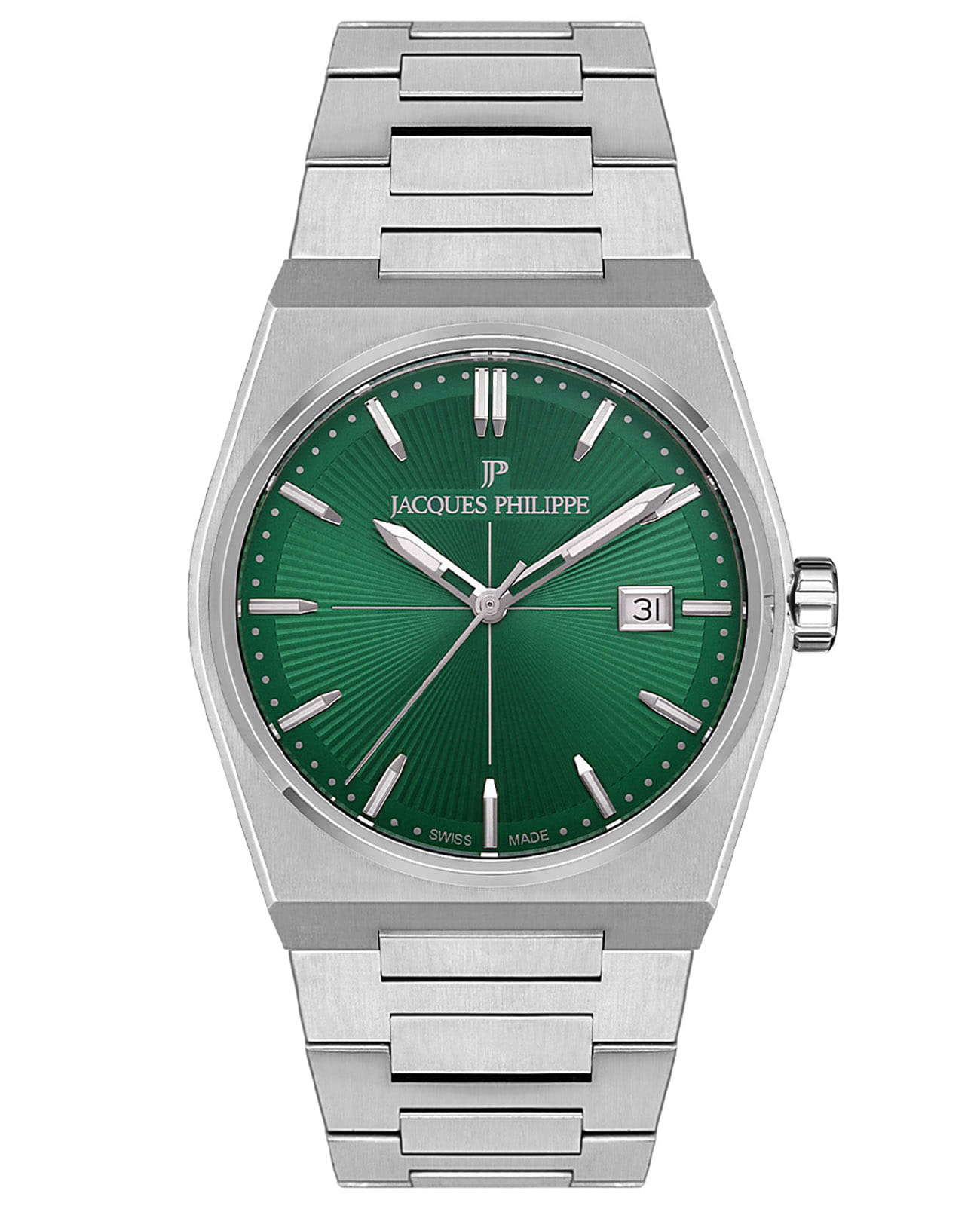 Часы Jacques Philippe JPQGS4213X6SG из коллекции Aurora — элегантные мужские часы, сочетающие швейцарское качество и современный дизайн. Корпус диаметром 42 мм выполнен из нержавеющей стали, а зеленый циферблат защищён сапфировым стекломСапфировое стеклоПрочный и надёжный материал из кристалла сапфира синтетического происхождения, характеризующийся особой твёрдостью и устойчивостью к царапинам и повреждениям..
