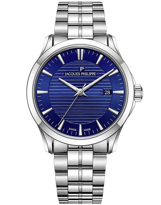 Jacques Philippe JPQGS791336 — стильные мужские часы в классическом формате с акцентом на надёжность и элегантность. Корпус круглой формы диаметром 40 мм из нержавеющей стали отличается утонченным силуэтом, обеспечивая комфорт при длительном ношении . Циферблат оформлен лаконично: тонкие стрелки и минималистичные часовые метки с люминесцентным покрытиемЛюминесцентное покрытиеПозволяет считывать показания времени в темноте. Производители наносят на стрелки, часовые индексы, безель или поверхность циферблата светонакопительный состав, дающий холодное свечение. подчёркивают строгий характер модели. Встроенная функция отображения даты придаёт часам практичность без лишнего визуального нагромождения. Поверхность защищает сапфировое стеклоСапфировое стеклоПрочный и надёжный материал из кристалла сапфира синтетического происхождения, характеризующийся особой твёрдостью и устойчивостью к царапинам и повреждениям. — устойчивое к царапинам и бликам. Внутри используется точный швейцарский кварцевый механизм, не требующий подзавода и сохраняющий стабильную работу без сложного обслуживания. Модель оснащена металлическим браслетом из нержавеющей стали в оттенке металлик на застёжке-бабочке с кнопкамиЗастёжка "бабочка"Такой вид застёжки дополняется предохранителями, помогающими избежать случайного раскрытия браслета. Обладают изящным исполнением. , что обеспечивает надёжную посадку и солидный внешний вид . Водозащита составляет до 5 ATM, — часы без проблем выдерживают случайный контакт с водой в повседневной эксплуатации . Jacques Philippe — гармоничное сочетание классического стиля, точного швейцарского кварца и практичности в одном надёжном аксессуаре.