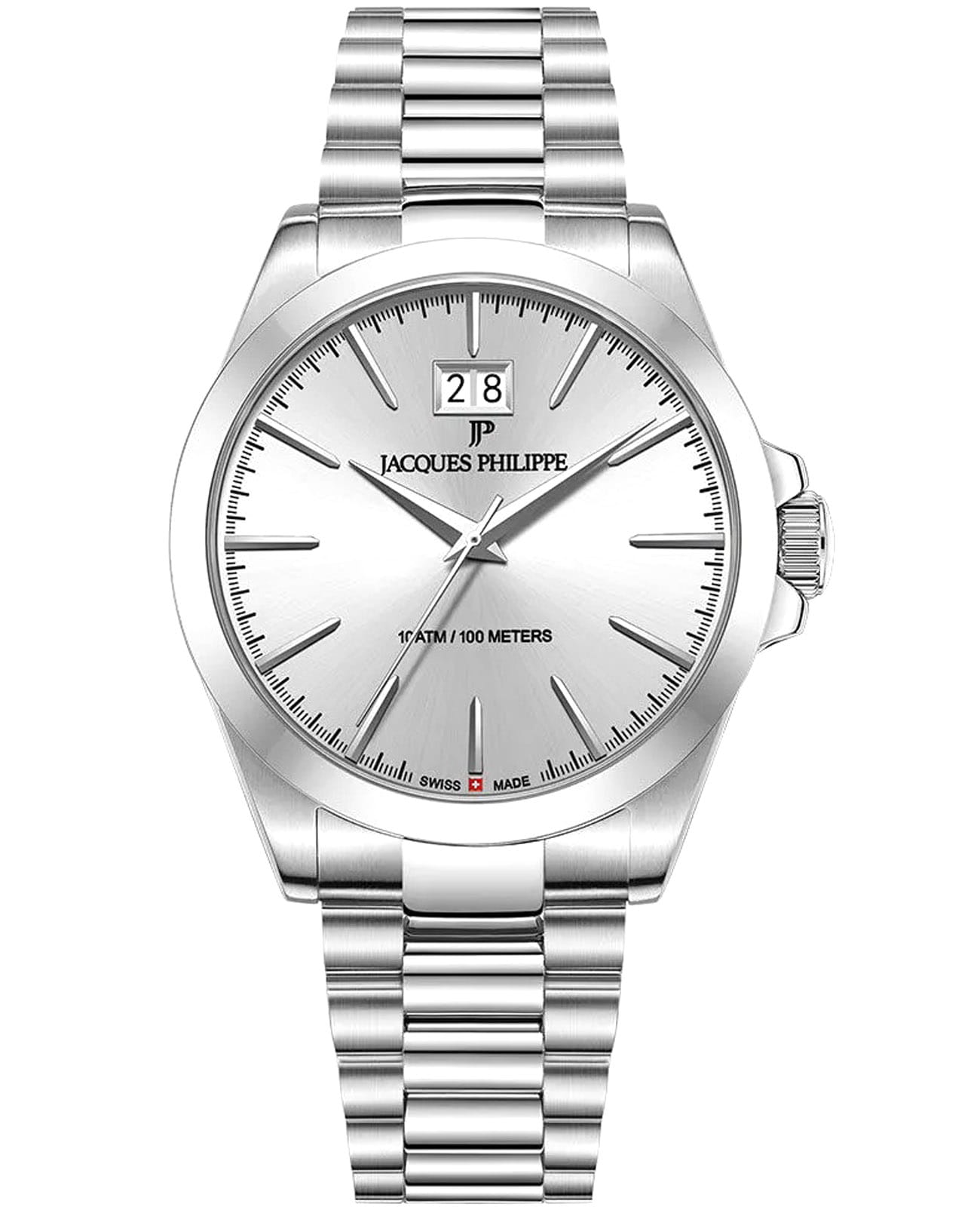 Швейцарские мужские часы Jacques Philippe Ordo JPQGS841326 кварцевый механизм с высокой точностью. Прочное сапфировое стеклоСапфировое стеклоПрочный и надёжный материал из кристалла сапфира синтетического происхождения, характеризующийся особой твёрдостью и устойчивостью к царапинам и повреждениям. устойчивое к царапинам и механическим повреждениям. Циферблат серебристого цвета украшен классическими стрелками и метками гармонично дополняющие общий дизайн модели. Элегантный корпус изготовлен из нержавеющей стали, диаметром 39 мм, что делает их устойчивыми к внешним воздействиям и придает благородный вид. Стальной браслет на застёжке-бабочке с кнопкамиЗастёжка "бабочка"Такой вид застёжки дополняется предохранителями, помогающими избежать случайного раскрытия браслета. Обладают изящным исполнением. обеспечивает комфортное и безопасное ношение. Окошко даты находится в положении 12 часов. Класс водозащиты: 100 метров позволит плавать, нырять и заниматься другими водными видами спорта. Эти часы станут идеальным выбором для мужчин, ценящих стиль, качество и функциональность.