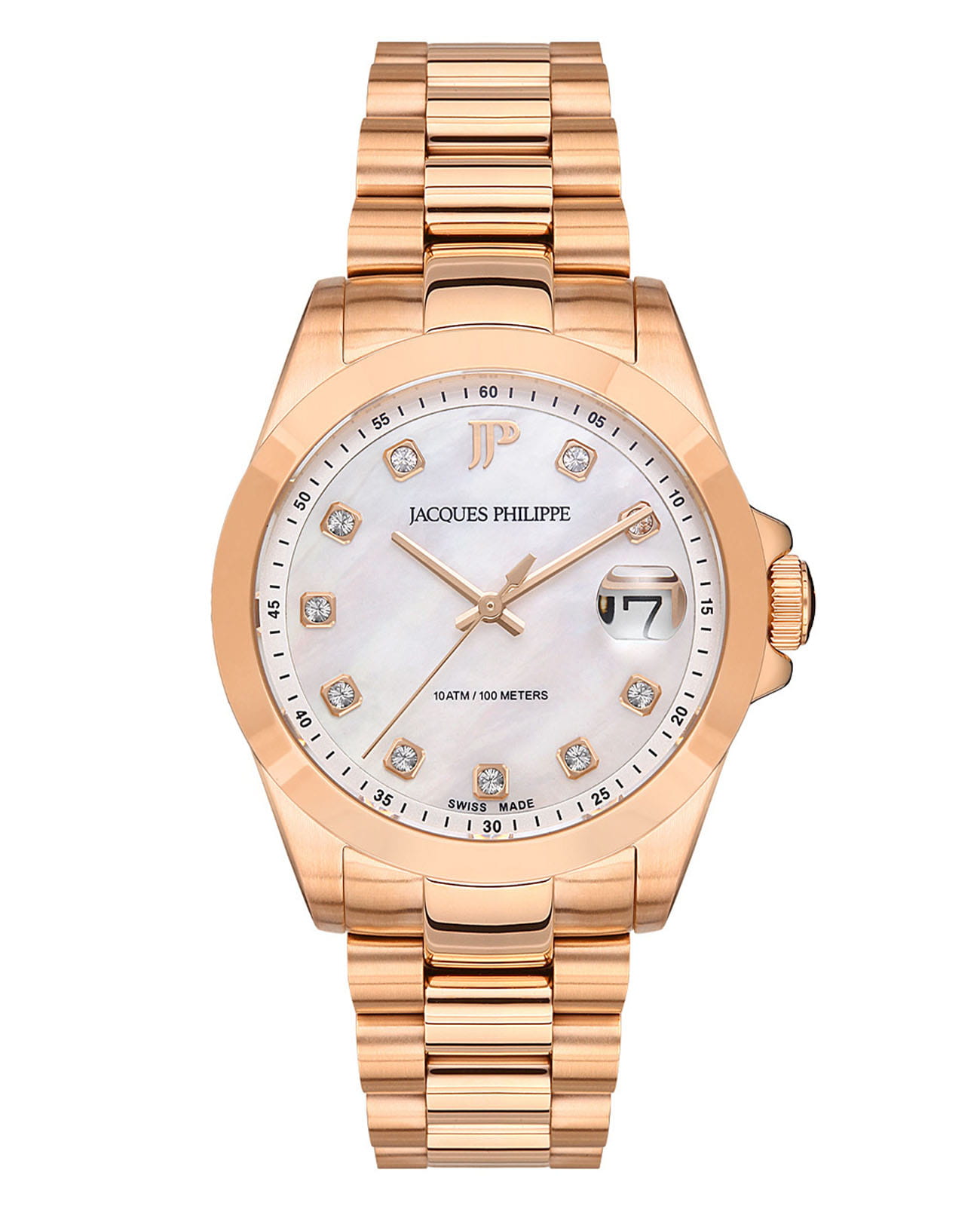 Швейцарские женские часы Jacques Philippe Infinitum JPQLS343385, кварцевый механизм с высокой точностью. Сапфировое стеклоСапфировое стеклоПрочный и надёжный материал из кристалла сапфира синтетического происхождения, характеризующийся особой твёрдостью и устойчивостью к царапинам и повреждениям. устойчивое к появлению царапин, обладающее высокой прозрачностью. Корпус часов изготовлен из нержавеющей стали с IP-покрытиемIP-покрытиеМетод ионного напыления. Демонстрирует повышенную устойчивость к истиранию, окислению и химическим веществам. Под воздействием высокого давления и температуры около 1500°C молекулы металла надёжно соединяются с частицами корпуса часов.. Окошко даты находится в положении 3 часа. Метки укаршены кристаллами. Класс водозащиты: 100 метров, позволит плавать, нырять и заниматься другими водными видами спорта. Стальной браслет с IP-покрытиемIP-покрытиеМетод ионного напыления. Демонстрирует повышенную устойчивость к истиранию, окислению и химическим веществам. Под воздействием высокого давления и температуры около 1500°C молекулы металла надёжно соединяются с частицами корпуса часов. на застёжке «бабочка» с кнопкамиЗастёжка "бабочка"Такой вид застёжки дополняется предохранителями, помогающими избежать случайного раскрытия браслета. Обладают изящным исполнением. .