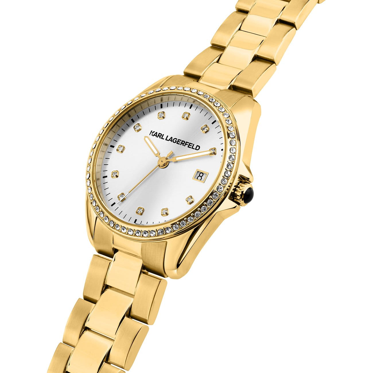 Женские элегантные часы Karl Lagerfeld Round Essentials R0553101505, кварцевый механизм с высокой точностью. Минеральное стеклоМинеральное стеклоМинеральное стекло представляет собой искусственно выращенный минерал кварца. Такое стекло отличается особой устойчивостью к повреждениям и царапинам. Уступает по некоторым качествам сапфировому стеклу. устойчивое к появлению царапин, обладающее высокой прозрачностью. Изысканный корпус изготовлен из нержавеющей стали с IP-покрытиемIP-покрытиеМетод ионного напыления. Демонстрирует повышенную устойчивость к истиранию, окислению и химическим веществам. Под воздействием высокого давления и температуры около 1500°C молекулы металла надёжно соединяются с частицами корпуса часов.. Лаконичные центральные часовая, минутная и секундная стрелки. Водонепроницаемость 5 АТМ позволяет использовать часы в повседневных условиях — при мытье рук или под лёгким дождём. Стальной браслет с IP-покрытиемIP-покрытиеМетод ионного напыления. Демонстрирует повышенную устойчивость к истиранию, окислению и химическим веществам. Под воздействием высокого давления и температуры около 1500°C молекулы металла надёжно соединяются с частицами корпуса часов. c раскладной застёжкойРаскладная застёжкаТакой тип застёжки используется только на браслетах из металла. Она никогда не раскрывается полностью, происходит разделение на 2 и более частей. Раскладывающая застёжка снизит вероятность потери часов к минимуму., обеспечивающей комфорт и уверенную фиксацию на запястье, а также добавляя завершающий штрих к этому стильному аксессуару. Стрелки оснащены люминесцентным покрытиемЛюминесцентное покрытиеПозволяет считывать показания времени в темноте. Производители наносят на стрелки, часовые индексы, безель или поверхность циферблата светонакопительный состав, дающий холодное свечение., обеспечивающим хорошую читаемость в темноте. Циферблат и безельБезельВнешний ободок, закрепляющий стекло. В спортивных часах так называется поворотное кольцо с делениями на циферблате, выполняет роль таймера – замеряет отрезки времени на шкале. Неподвижный безель – элемент декора. Однонаправленно вращающийся безель на дайверских часах позволяет фиксировать моменты погружения и выныривания на поверхность. с кристаллами подчёркивают изысканный характер часов, создавая универсальный образ, подходящий как для повседневных ситуаций, так и для особых случаев. Аккуратное окошко даты на отметке «3 часов».