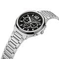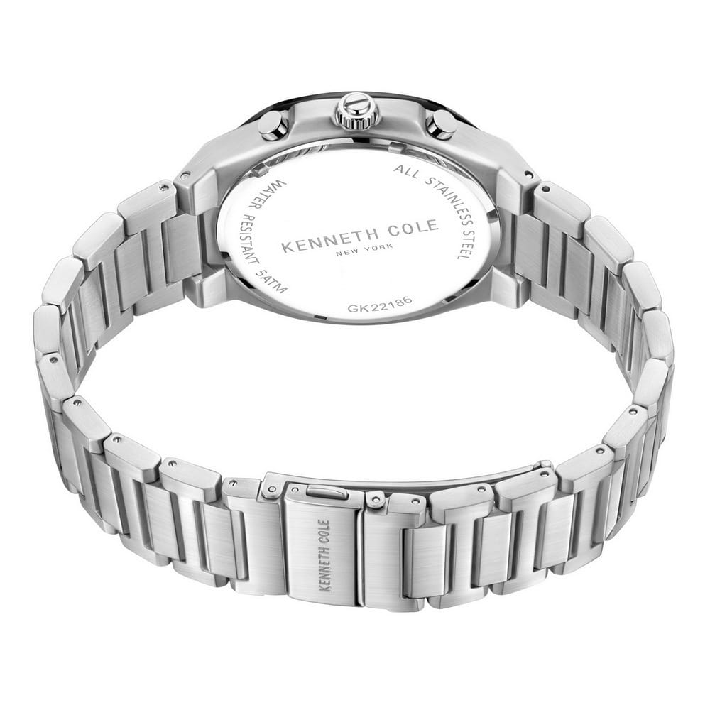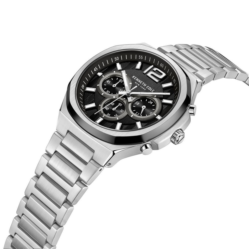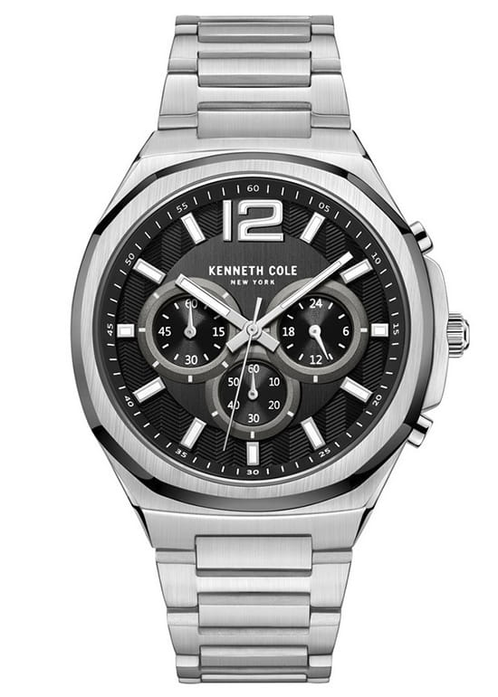 Мужские кварцевые часы-хронографХронографФункция позволяет измерять отрезки времени с особой точностью: часы, минуты, секунды. Верным признаком хронографа является наличие на циферблате 3 дополнительных окошек-счётчиков. с секундомеромСекундомерСекундоме́р — прибор, способный измерять интервалы времени с точностью до долей секунды. Kenneth Cole Dress Sport KCWGK2218601, кварцевый механизм с высокой точностью. Минеральное стеклоМинеральное стеклоМинеральное стекло представляет собой искусственно выращенный минерал кварца. Такое стекло отличается особой устойчивостью к повреждениям и царапинам. Уступает по некоторым качествам сапфировому стеклу. устойчивое к появлению царапин, обладающее высокой прозрачностью. Класс водозащиты: 30 метров, позволит защитить корпус от случайных брызг или капель дождя. Корпус и безельБезельВнешний ободок, закрепляющий стекло. В спортивных часах так называется поворотное кольцо с делениями на циферблате, выполняет роль таймера – замеряет отрезки времени на шкале. Неподвижный безель – элемент декора. Однонаправленно вращающийся безель на дайверских часах позволяет фиксировать моменты погружения и выныривания на поверхность. изготовлены из нержавеющей стали. Индикация даты и дня недели. Стрелки и метки с люминесцентным покрытиемЛюминесцентное покрытиеПозволяет считывать показания времени в темноте. Производители наносят на стрелки, часовые индексы, безель или поверхность циферблата светонакопительный состав, дающий холодное свечение.. Браслет  из стали с раскладной застёжкойРаскладная застёжкаТакой тип застёжки используется только на браслетах из металла. Она никогда не раскрывается полностью, происходит разделение на 2 и более частей. Раскладывающая застёжка снизит вероятность потери часов к минимуму..