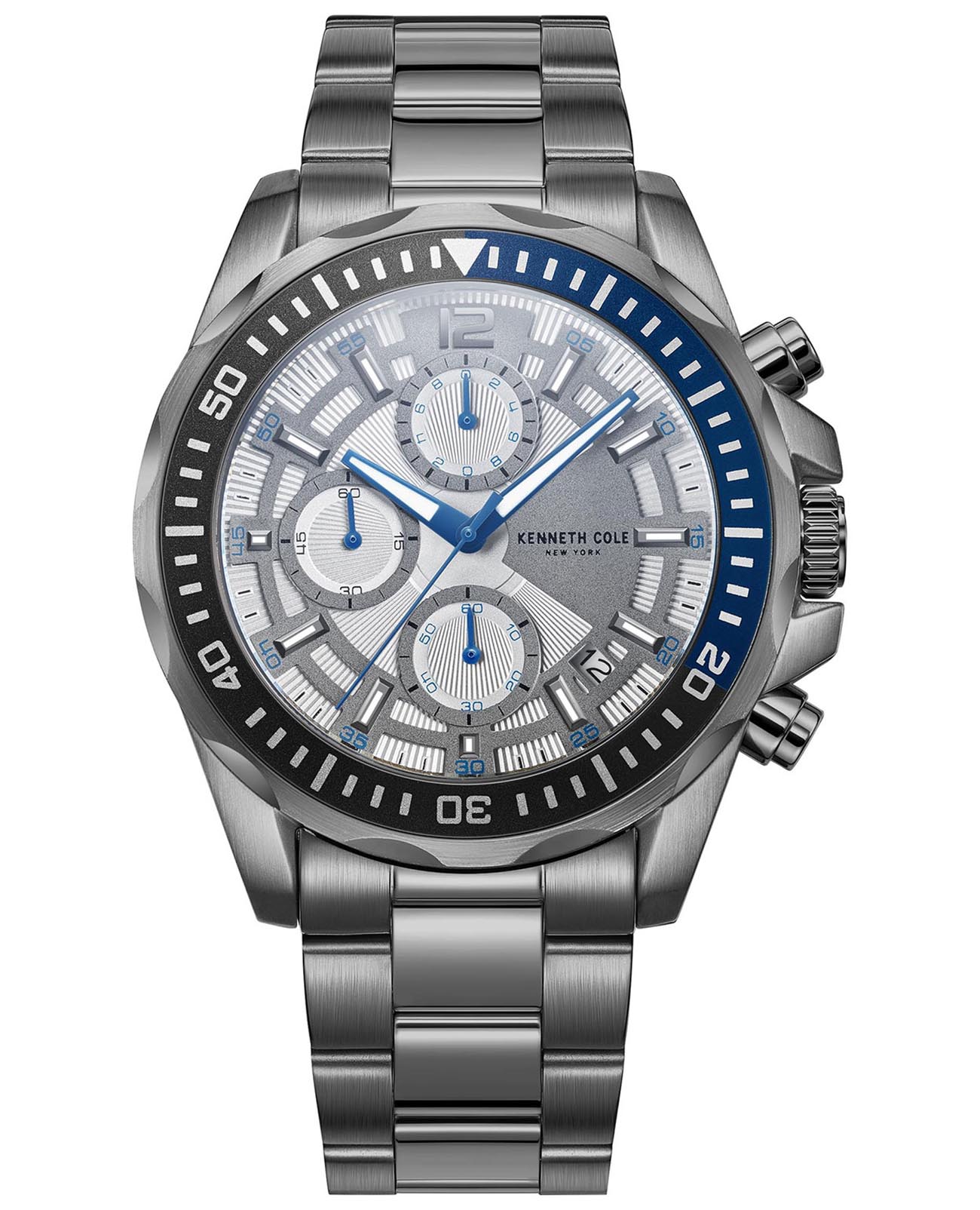 Мужские кварцевые часы-хронографХронографФункция позволяет измерять отрезки времени с особой точностью: часы, минуты, секунды. Верным признаком хронографа является наличие на циферблате 3 дополнительных окошек-счётчиков. с секундомеромСекундомерСекундоме́р — прибор, способный измерять интервалы времени с точностью до долей секунды. Kenneth Cole Dress Sport KCWGK2222201, кварцевый механизм с высокой точностью. Класс водозащиты: 30 метров, позволит защитить корпус от случайных брызг или капель дождя. Корпус часов изготовлен из стали с IP-покрытиемIP-покрытиеМетод ионного напыления. Демонстрирует повышенную устойчивость к истиранию, окислению и химическим веществам. Под воздействием высокого давления и температуры около 1500°C молекулы металла надёжно соединяются с частицами корпуса часов.. Стальной браслет на раскладной застёжкеРаскладная застёжкаТакой тип застёжки используется только на браслетах из металла. Она никогда не раскрывается полностью, происходит разделение на 2 и более частей. Раскладывающая застёжка снизит вероятность потери часов к минимуму. с IP-покрытиемIP-покрытиеМетод ионного напыления. Демонстрирует повышенную устойчивость к истиранию, окислению и химическим веществам. Под воздействием высокого давления и температуры около 1500°C молекулы металла надёжно соединяются с частицами корпуса часов.. Заводная головка с защитой. БезельБезельВнешний ободок, закрепляющий стекло. В спортивных часах так называется поворотное кольцо с делениями на циферблате, выполняет роль таймера – замеряет отрезки времени на шкале. Неподвижный безель – элемент декора. Однонаправленно вращающийся безель на дайверских часах позволяет фиксировать моменты погружения и выныривания на поверхность. с IP-покрытиемIP-покрытиеМетод ионного напыления. Демонстрирует повышенную устойчивость к истиранию, окислению и химическим веществам. Под воздействием высокого давления и температуры около 1500°C молекулы металла надёжно соединяются с частицами корпуса часов.. Окошко даты находится в положении между 4 и 5 часами. Стрелки и метки с люминесцентным покрытиемЛюминесцентное покрытиеПозволяет считывать показания времени в темноте. Производители наносят на стрелки, часовые индексы, безель или поверхность циферблата светонакопительный состав, дающий холодное свечение..
