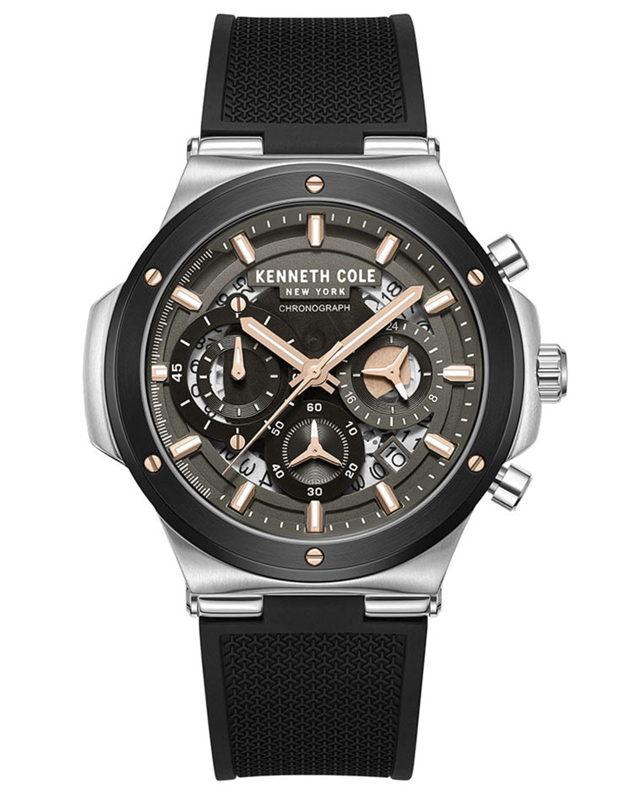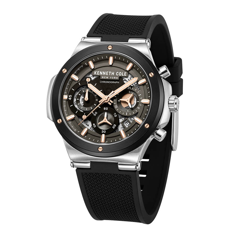Мужские кварцевые часы Kenneth Cole KCWGO0047301 — это выразительный аксессуар с мощным характером. Корпус диаметром 45 мм выполнен из нержавеющей стали. Безель с IP-покрытиемIP-покрытиеМетод ионного напыления. Демонстрирует повышенную устойчивость к истиранию, окислению и химическим веществам. Под воздействием высокого давления и температуры около 1500°C молекулы металла надёжно соединяются с частицами корпуса часов. чёрного цвета. Циферблат серого цвета оформлен метками в виде штрихов и дополнен функциями хронографаХронографФункция позволяет измерять отрезки времени с особой точностью: часы, минуты, секунды. Верным признаком хронографа является наличие на циферблате 3 дополнительных окошек-счётчиков. и индикации даты. Стрелки и метки оснащены люминесцентным покрытиемЛюминесцентное покрытиеПозволяет считывать показания времени в темноте. Производители наносят на стрелки, часовые индексы, безель или поверхность циферблата светонакопительный состав, дающий холодное свечение., обеспечивающим хорошую читаемость в темноте. Циферблат защищён минеральным стекломМинеральное стеклоМинеральное стекло представляет собой искусственно выращенный минерал кварца. Такое стекло отличается особой устойчивостью к повреждениям и царапинам. Уступает по некоторым качествам сапфировому стеклу.. Часы оснащены силиконовым ремешком чёрного цвета с классической пряжкой. Водонепроницаемость 30 м позволяет использовать часы в повседневных условиях, защищая от случайных брызг и капель дождя. Уверенный выбор для тех, кто предпочитает крупные детали и современный стиль.