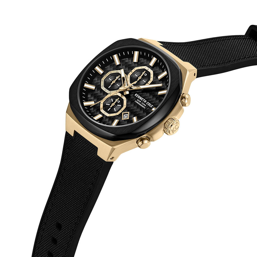 Мужские кварцевые часы Kenneth Cole KCWGO0059602 — это стильный и функциональный аксессуар с современным дизайном. Корпус размером 43 мм выполнен из нержавеющей стали с IP-покрытиемIP-покрытиеМетод ионного напыления. Демонстрирует повышенную устойчивость к истиранию, окислению и химическим веществам. Под воздействием высокого давления и температуры около 1500°C молекулы металла надёжно соединяются с частицами корпуса часов. золотого и чёрного цвета, придающим модели спортивный характер. Циферблат чёрного цвета оформлен метками в виде штрихов и дополнен функциями хронографаХронографФункция позволяет измерять отрезки времени с особой точностью: часы, минуты, секунды. Верным признаком хронографа является наличие на циферблате 3 дополнительных окошек-счётчиков. и индикации даты. Стрелки и метки оснащены люминесцентным покрытиемЛюминесцентное покрытиеПозволяет считывать показания времени в темноте. Производители наносят на стрелки, часовые индексы, безель или поверхность циферблата светонакопительный состав, дающий холодное свечение., обеспечивающим хорошую читаемость в темноте. Циферблат защищён минеральным стекломМинеральное стеклоМинеральное стекло представляет собой искусственно выращенный минерал кварца. Такое стекло отличается особой устойчивостью к повреждениям и царапинам. Уступает по некоторым качествам сапфировому стеклу.. Часы оснащены комбинированным ремешком из силикона и нейлона чёрного цвета с классической пряжкой. Водонепроницаемость 50 м позволяет использовать часы для плавания и повседневного ношения. Надёжный выбор для тех, кто ценит выносливость, стиль и функциональность.