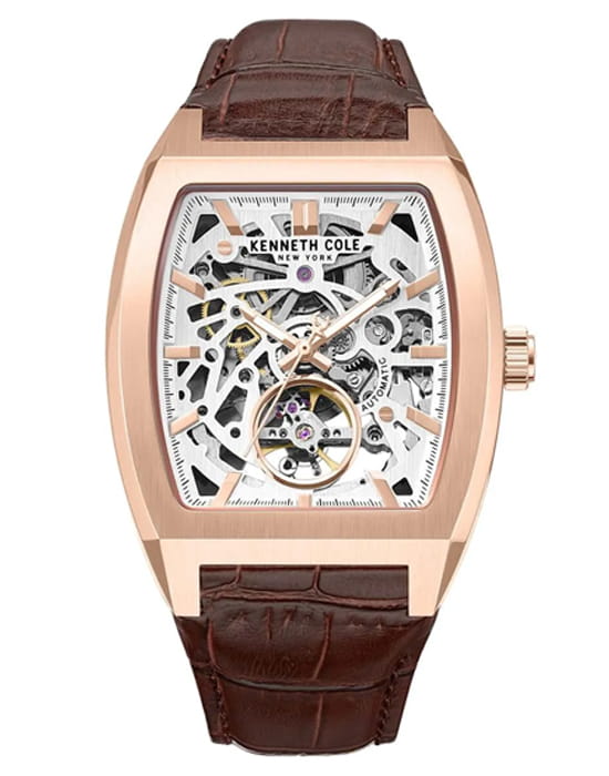 Kenneth Cole KCWGX0077402 — мужская автоматическая модель с выразительным современным стилем и скелетонизированным дизайном. Корпус выполнен из нержавеющей стали с PVD-покрытиемPVDУльтратонкое покрытие наносится в технике вакуумного напыления, сочетает в себе нитрид титана особой прочности со слоем золота или оксида хрома. Несёт в себе декоративную или защитную функцию. и подчёркивает архитектурный облик часов. Циферблат с открытым механизмом позволяет рассмотреть работу автоматического калибра, акцентируя внимание на его деталях. Метки и стрелки покрыты люминесцентным покрытиемЛюминесцентное покрытиеПозволяет считывать показания времени в темноте. Производители наносят на стрелки, часовые индексы, безель или поверхность циферблата светонакопительный состав, дающий холодное свечение., что обеспечивает читаемость в условиях слабого освещения. Защитную функцию выполняет минеральное стеклоМинеральное стеклоМинеральное стекло представляет собой искусственно выращенный минерал кварца. Такое стекло отличается особой устойчивостью к повреждениям и царапинам. Уступает по некоторым качествам сапфировому стеклу., устойчивое к повседневным повреждениям. Часы дополнены кожаным ремешком с классической застёжкой, создающим удобную посадку и комфорт в носке. Модель объединяет техническую эстетику скелетона и современный характер, подчёркивая индивидуальность владельца.