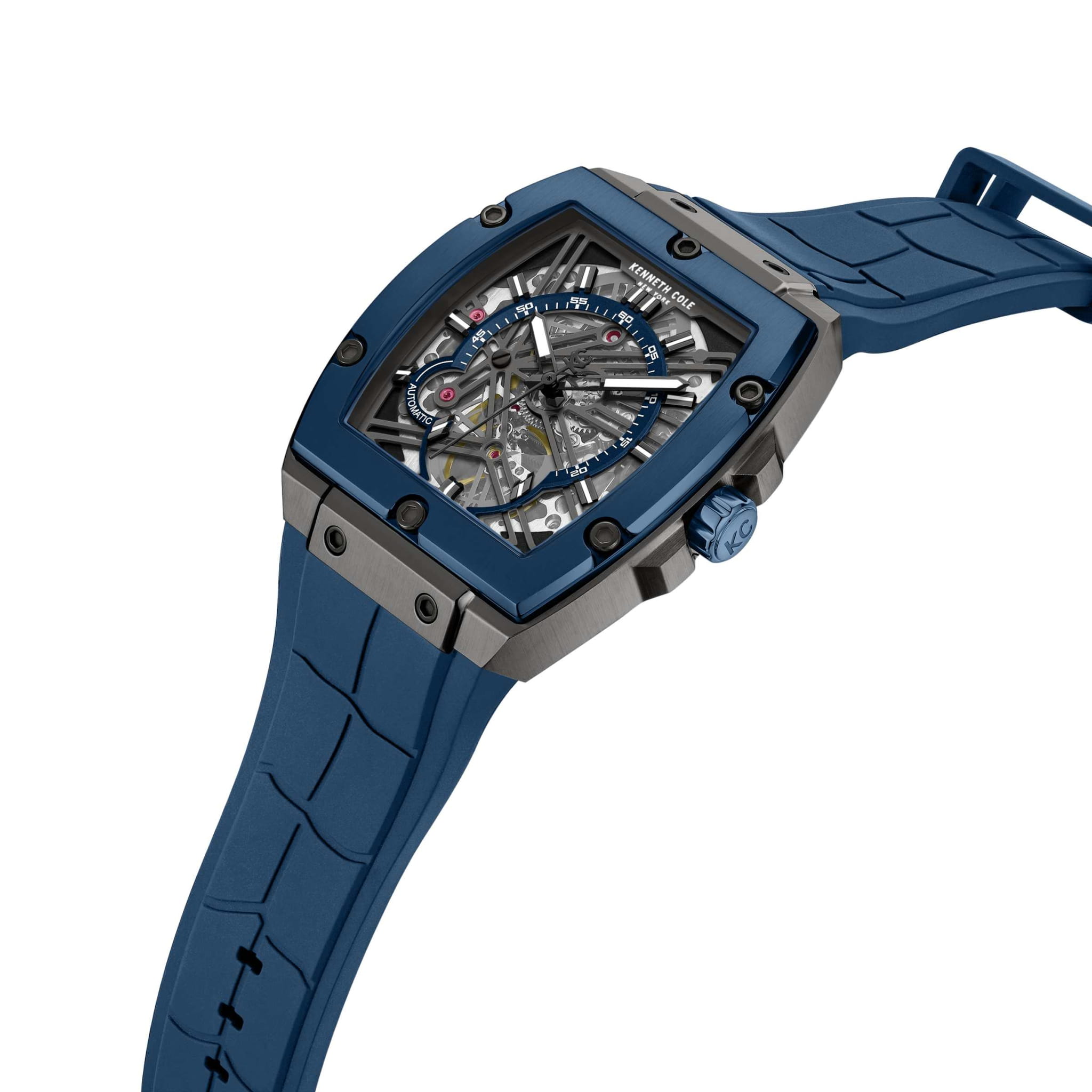 Kenneth Cole KCWGZ0067801 — мужская автоматическая модель с ярко выраженным современным стилем и эффектным скелетонизированным циферблатом. Корпус бочкообразной формы изготовлен из нержавеющей стали с тёмным PVDPVDУльтратонкое покрытие наносится в технике вакуумного напыления, сочетает в себе нитрид титана особой прочности со слоем золота или оксида хрома. Несёт в себе декоративную или защитную функцию.-покрытием и декорирован винтами на безелеБезельВнешний ободок, закрепляющий стекло. В спортивных часах так называется поворотное кольцо с делениями на циферблате, выполняет роль таймера – замеряет отрезки времени на шкале. Неподвижный безель – элемент декора. Однонаправленно вращающийся безель на дайверских часах позволяет фиксировать моменты погружения и выныривания на поверхность., что подчёркивает индустриальный характер часов. Архитектурный циферблат с открытой конструкцией демонстрирует работу автоматического механизма, а стрелки и метки с люминесцентным покрытиемЛюминесцентное покрытиеПозволяет считывать показания времени в темноте. Производители наносят на стрелки, часовые индексы, безель или поверхность циферблата светонакопительный состав, дающий холодное свечение. обеспечивают читаемость даже при слабом освещении. Защитную роль выполняет минеральное стеклоМинеральное стеклоМинеральное стекло представляет собой искусственно выращенный минерал кварца. Такое стекло отличается особой устойчивостью к повреждениям и царапинам. Уступает по некоторым качествам сапфировому стеклу., устойчивое к повседневным повреждениям. Модель дополнена каучуковым ремешком, который подчеркивает спортивный акцент и гарантирует комфортное ношение.