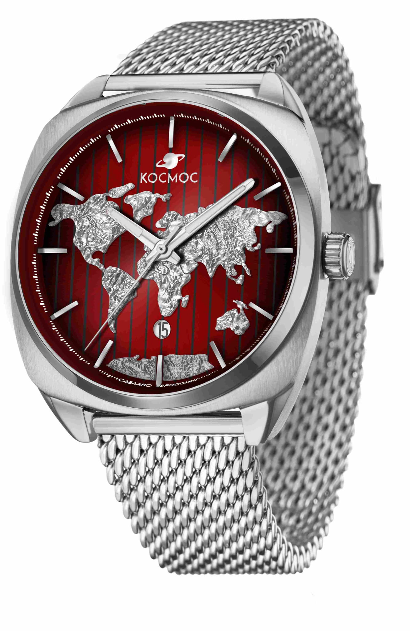Мужские часы Космос D 113.19.35 из коллекции ЦУП станут идеальным аксессуаром для тех, кто ценит историю и традиции российского часового производства Механический механизм с автоподзаводом TMI, произведенный японской компанией Seiko, гарантирует высокую точность хода и долговечность работы. Прозрачная задняя крышка, крепящаяся на четырех винтах, позволяет рассмотреть механизм во всех подробностях, включая ротор автоподзавода, украшенный изображением космонавта. Корпус часов выполнен из нержавеющей стали марки, изображение очертаний континентов защищено прочным минеральным стекломМинеральное стеклоМинеральное стекло представляет собой искусственно выращенный минерал кварца. Такое стекло отличается особой устойчивостью к повреждениям и царапинам. Уступает по некоторым качествам сапфировому стеклу., устойчивым к царапинам. Окошко даты расположено в положении 6 часа, а стрелки имеют люминесцентное покрытиеЛюминесцентное покрытиеПозволяет считывать показания времени в темноте. Производители наносят на стрелки, часовые индексы, безель или поверхность циферблата светонакопительный состав, дающий холодное свечение., что позволяет определять время даже в темноте. Стальной браслет миланского плетения на раскладном замкеРаскладной замокДанный вариант застежки используется только на часах с металлическим браслетом. Отличительная особенность такого крепления в том, что длина браслета становится универсальной и вы можете самостоятельно отрегулировать нужный вам размер – застежка просто двигается по браслету часов.. Часы обладают водозащитой до 10 атм (WR100), что позволит использовать их при плавании и других водных видах спорта.