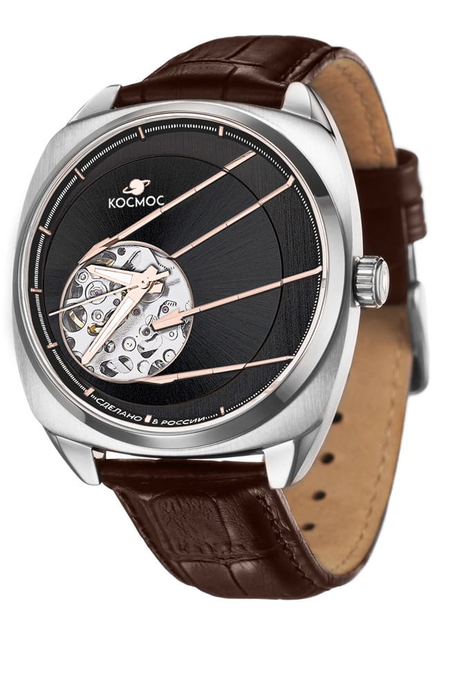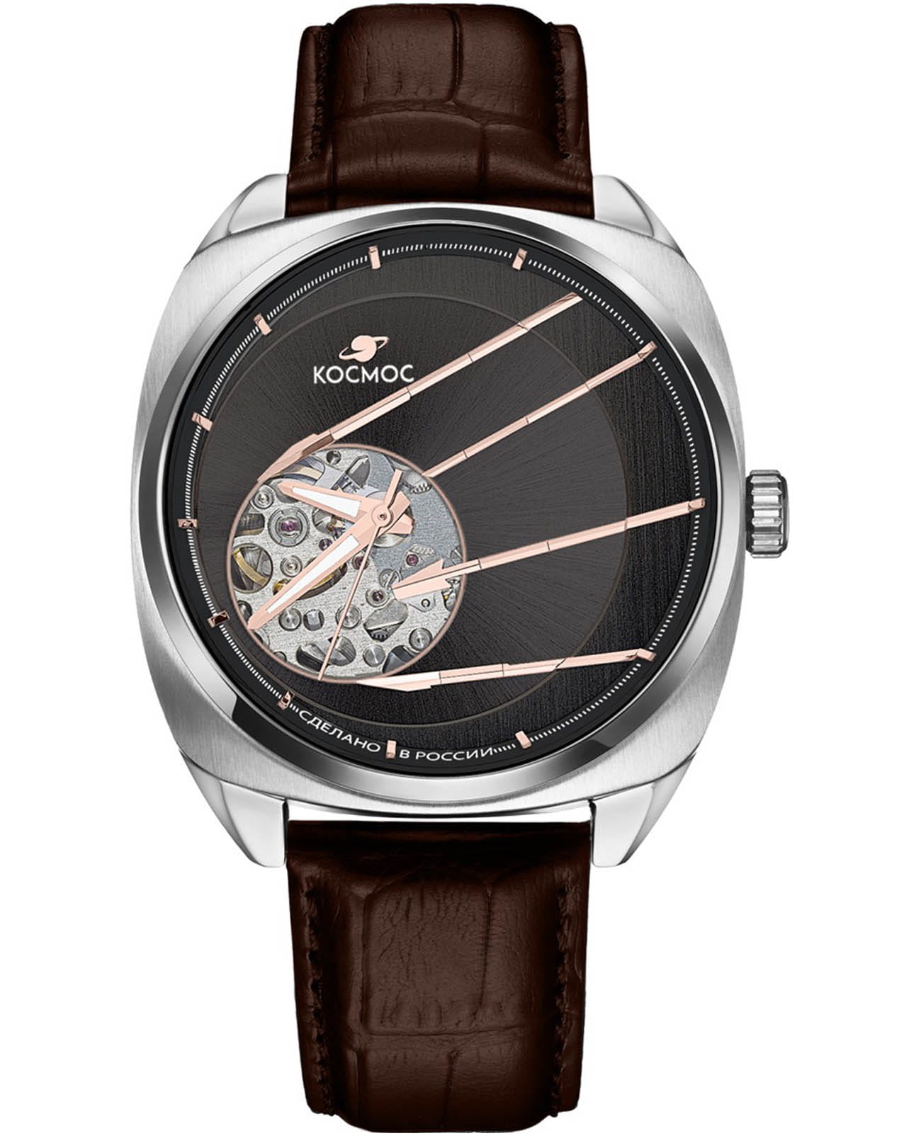 Мужские наручные часы Космос Спутник K 115.12.34 — это уникальная лимитированная серия, созданная в честь исторического запуска первого искусственного спутника Земли. В корпусе необычной круглой формы, выполненном из гипоаллергенной нержавеющей стали, работает надежный механический механизм с автоподзаводом от японской компании Seiko. Прозрачная задняя крышка, закрепленная на четырех винтах, открывает вид на сложный механизм, а на самой крышке указан индивидуальный номер модели в формате хх/50. Скелетонизированный черный циферблат защищен сапфировым стекломСапфировое стеклоПрочный и надёжный материал из кристалла сапфира синтетического происхождения, характеризующийся особой твёрдостью и устойчивостью к царапинам и повреждениям. с антибликовым покрытиемАнтибликовое покрытиеСлой оксида металла в 0,13-0,3 микрон, благодаря которому стекло часов не бликует и не отражает свет. Антибликовое покрытие уменьшает отражение света в 10 раз, обеспечивая отличную читаемость показателей циферблата., которое обеспечивает максимальную устойчивость к царапинам и идеальную видимость в любых условиях. Украшением циферблата служат крупные стрелки с люминесцентным покрытиемЛюминесцентное покрытиеПозволяет считывать показания времени в темноте. Производители наносят на стрелки, часовые индексы, безель или поверхность циферблата светонакопительный состав, дающий холодное свечение., а также специальная апертура, окаймленная элементами, напоминающими антенны Спутника. Часовая и минутная стрелки отлично читаются благодаря своему размеру и светящемуся покрытию. Браслет из натуральной кожи коричневого цвета дополнен удобной застежкой-бабочкой с двумя боковыми кнопкамиЗастёжка "бабочка"Такой вид застёжки дополняется предохранителями, помогающими избежать случайного раскрытия браслета. Обладают изящным исполнением. , что гарантирует надежную фиксацию на руке. Водозащита до 10 атм (WR100) позволяет использовать часы при плавании и других водных видах спорта без акваланга. Коллекция Спутник — это выбор для ценителей истории космических достижений и современных технологий.