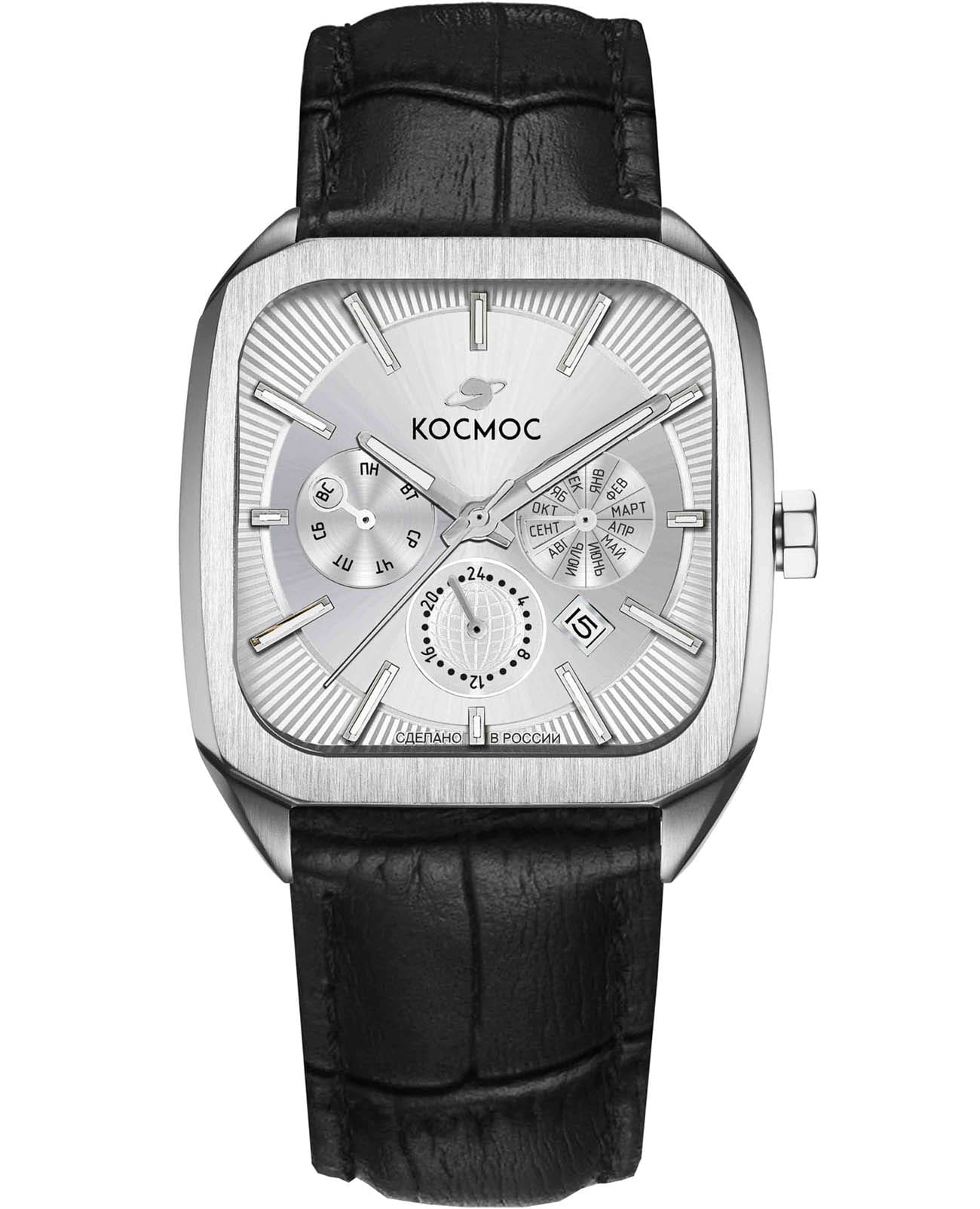 Мужские наручные часы Космос Марсоход II K 219.11.33 — это уникальная лимитированная серия, посвященная аппарату, способному передвигаться по поверхности Красной планеты. Марсоход ассоциируется с брутальностью, мастерством и технической сложностью. Наша страна дважды запускала подобные аппараты еще в 70-х годах прошлого века. Дизайн часов серии Марсоход вдохновлен лучшими работами советских мастеров, сочетая современные технологии часового искусства с обаянием стиля ретро. Корпус в форме квадрата с закругленными углами выполнен из нержавеющей стали украшенной зеркальной полировкой и сатинированием. Удобная заводная головка имеет форму гайки, что добавляет модели индустриальный шарм. Задняя крышка прозрачная, закрепленная на четырех винтах, и позволяет увидеть работу механизма TMI с подвижным ротором, на котором гравируется надпись «Сделано в России». Также здесь представлена гравировка с изображением космонавта, придающая часам особую значимость. Водостойкость достигает 10 атм (WR100), что позволяет использовать часы при плавании и других водных видах спорта. На задней крышке указан индивидуальный номер модели в формате от 01/50 до 50/50. Объемный циферблат состоит из двух уровней. В центре движутся три стрелки, часовая и минутная из которых имеют люминесцентное покрытиеЛюминесцентное покрытиеПозволяет считывать показания времени в темноте. Производители наносят на стрелки, часовые индексы, безель или поверхность циферблата светонакопительный состав, дающий холодное свечение., позволяющее определять время даже в темноте. Также, здесь расположили три дополнительных индикатора: день недели, месяц и время в формате 24-х часов. Для обозначения дня недели и месяца используется кириллица. Окошко даты между 4 и 5 часами выделено накладной рамкой. Циферблат защищен прочным сапфировым стеклом с антибликовым покрытиемСапфировое стеклоПрочный и надёжный материал из кристалла сапфира синтетического происхождения, характеризующийся особой твёрдостью и устойчивостью к царапинам и повреждениям., обеспечивающим отличную читаемость показаний в любых условиях. Второй уровень декорирован гильоше в виде солнечных лучей, на нем закреплены накладные индексы. Браслет изготовлен из натуральной кожи черного цвета и оснащен удобной застёжкой «бабочка» с кнопкамиЗастёжка "бабочка"Такой вид застёжки дополняется предохранителями, помогающими избежать случайного раскрытия браслета. Обладают изящным исполнением. , которая сводит к минимуму вероятность потери. Заводная головка, застежка и браслет украшены фирменным логотипом бренда. Коллекция Марсоход — идеальный выбор для ценителей истории космических достижений и современных технологий.