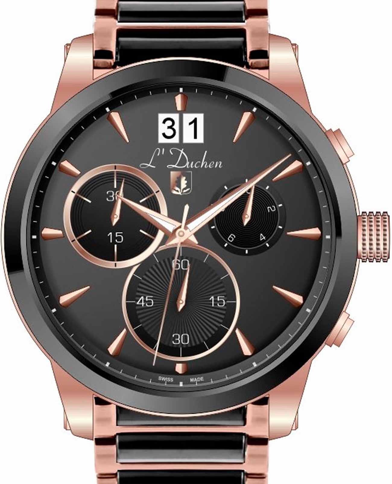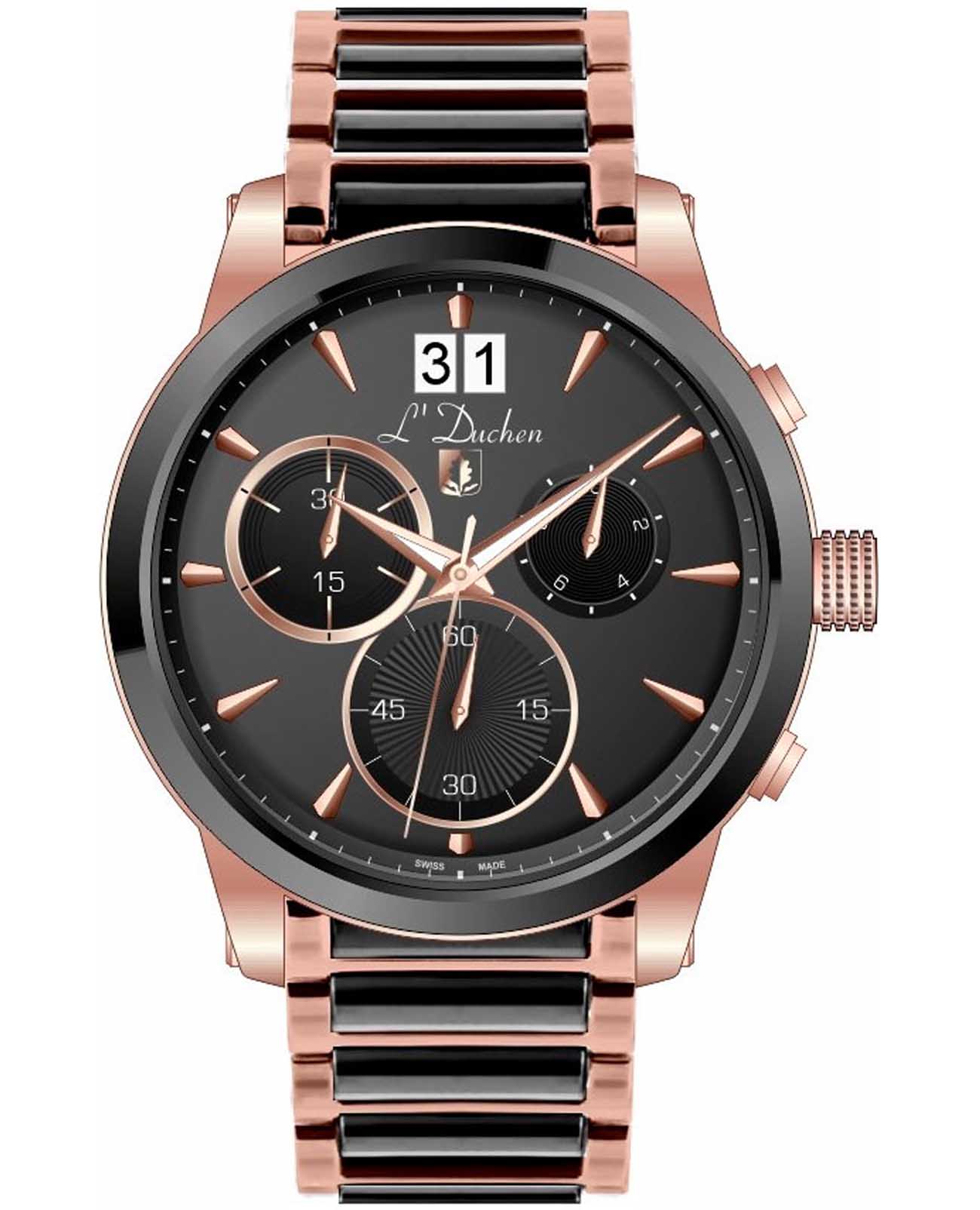 Мужские швейцарские часы-хронографХронографФункция позволяет измерять отрезки времени с особой точностью: часы, минуты, секунды. Верным признаком хронографа является наличие на циферблате 3 дополнительных окошек-счётчиков. L'Duchen Aerostat Chrono D 232.40.31,кварцевый механизм с высокой точностью. Сапфировое стеклоСапфировое стеклоПрочный и надёжный материал из кристалла сапфира синтетического происхождения, характеризующийся особой твёрдостью и устойчивостью к царапинам и повреждениям. устойчивое к появлению царапин, обладающее высокой прозрачностью. Корпус часов выполнен из нержавеющей стали с PVD-покрытиемPVDУльтратонкое покрытие наносится в технике вакуумного напыления, сочетает в себе нитрид титана особой прочности со слоем золота или оксида хрома. Несёт в себе декоративную или защитную функцию.. БезельБезельВнешний ободок, закрепляющий стекло. В спортивных часах так называется поворотное кольцо с делениями на циферблате, выполняет роль таймера – замеряет отрезки времени на шкале. Неподвижный безель – элемент декора. Однонаправленно вращающийся безель на дайверских часах позволяет фиксировать моменты погружения и выныривания на поверхность. из керамики. Стрелки с люминесцентным покрытиемЛюминесцентное покрытиеПозволяет считывать показания времени в темноте. Производители наносят на стрелки, часовые индексы, безель или поверхность циферблата светонакопительный состав, дающий холодное свечение.. Класс водозащиты: 100 метров, позволит плавать, нырять и заниматься другими водными видами спорта. Стальной браслет с PVD-покрытиемPVDУльтратонкое покрытие наносится в технике вакуумного напыления, сочетает в себе нитрид титана особой прочности со слоем золота или оксида хрома. Несёт в себе декоративную или защитную функцию. и керамическими вставками на застёжке «бабочка» с кнопкамиЗастёжка "бабочка"Такой вид застёжки дополняется предохранителями, помогающими избежать случайного раскрытия браслета. Обладают изящным исполнением. .