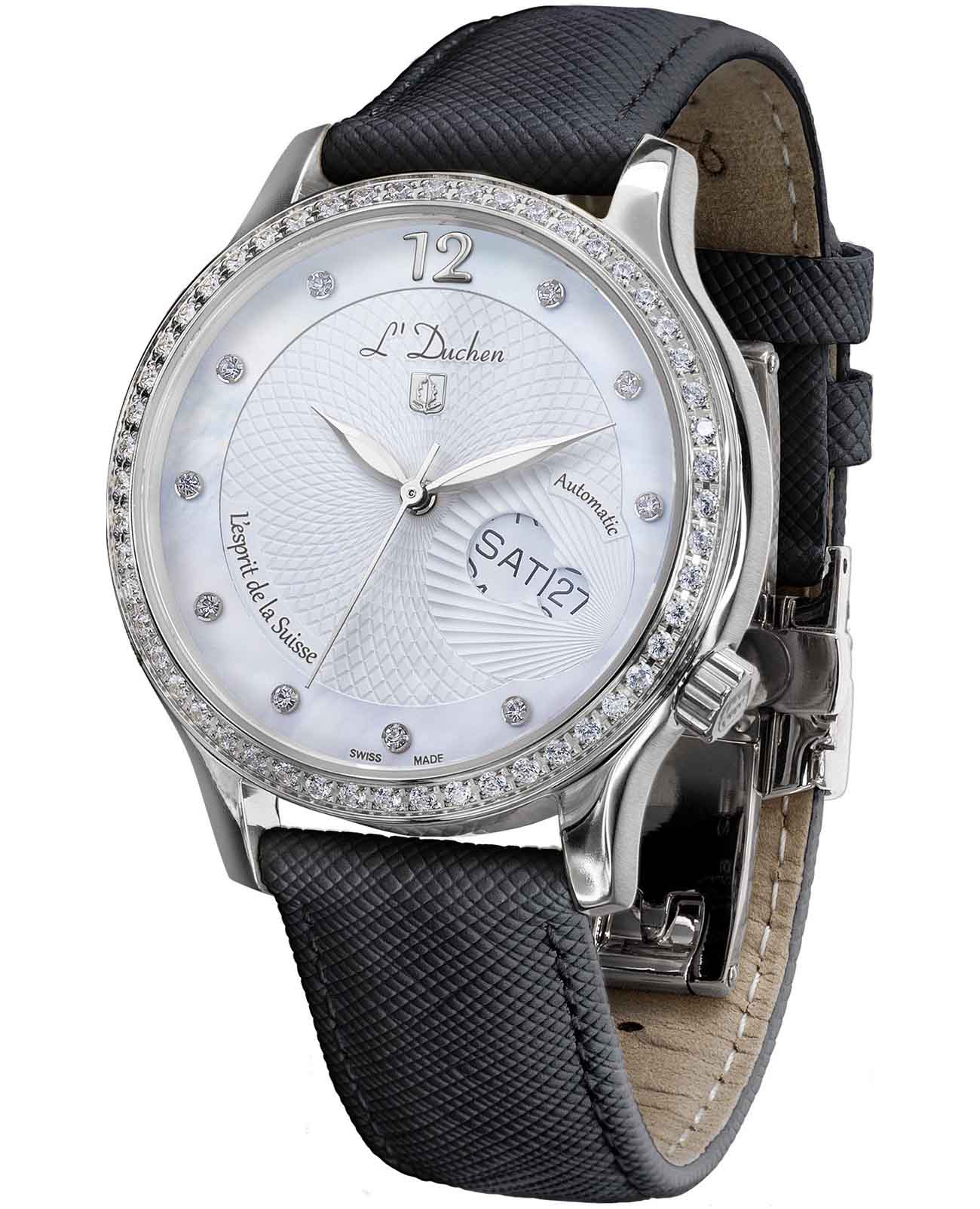 Женские швейцарские механические часы с автоподзаводом L'Duchen Coquille D 713.11.33. Сапфировое стеклоСапфировое стеклоПрочный и надёжный материал из кристалла сапфира синтетического происхождения, характеризующийся особой твёрдостью и устойчивостью к царапинам и повреждениям. устойчивое к появлению царапин, обладающее высокой прозрачностью. Корпус часов выполнен из нержавеющей стали. БезельБезельВнешний ободок, закрепляющий стекло. В спортивных часах так называется поворотное кольцо с делениями на циферблате, выполняет роль таймера – замеряет отрезки времени на шкале. Неподвижный безель – элемент декора. Однонаправленно вращающийся безель на дайверских часах позволяет фиксировать моменты погружения и выныривания на поверхность. и циферблат украшены фианитами. Стрелки с люминесцентным покрытиемЛюминесцентное покрытиеПозволяет считывать показания времени в темноте. Производители наносят на стрелки, часовые индексы, безель или поверхность циферблата светонакопительный состав, дающий холодное свечение.. Класс водозащиты: 50 метров, позволит защитить корпус от случайных брызг или капель дождя. Кожаный ремешок на застёжке «бабочка» с кнопкамиЗастёжка "бабочка"Такой вид застёжки дополняется предохранителями, помогающими избежать случайного раскрытия браслета. Обладают изящным исполнением. .