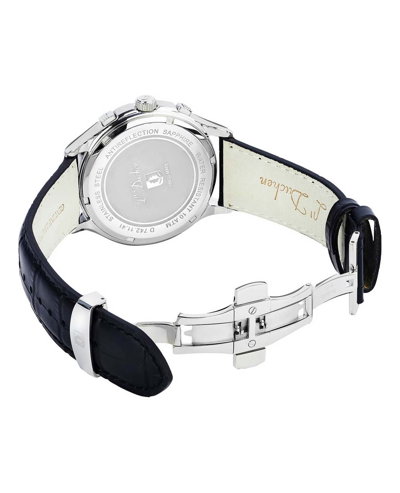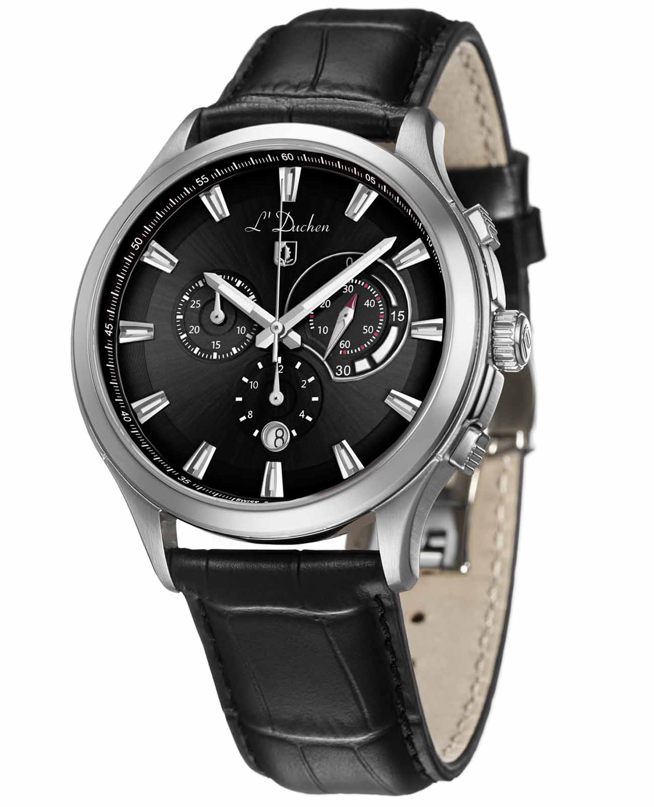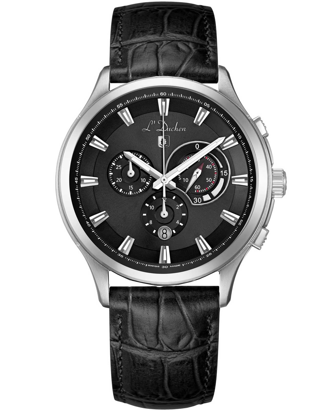 Мужские швейцарские часы- хронографХронографФункция позволяет измерять отрезки времени с особой точностью: часы, минуты, секунды. Верным признаком хронографа является наличие на циферблате 3 дополнительных окошек-счётчиков. L'Duchen Pilotage D 742.11.41, кварцевый механизм с высокой точностью. Сапфировое стеклоСапфировое стеклоПрочный и надёжный материал из кристалла сапфира синтетического происхождения, характеризующийся особой твёрдостью и устойчивостью к царапинам и повреждениям. устойчивое к появлению царапин, обладающее высокой прозрачностью. Корпус часов выполнен из нержавеющей стали. Стрелки с люминесцентным покрытиемЛюминесцентное покрытиеПозволяет считывать показания времени в темноте. Производители наносят на стрелки, часовые индексы, безель или поверхность циферблата светонакопительный состав, дающий холодное свечение.. Класс водозащиты: 100 метров, позволит плавать, нырять и заниматься другими водными видами спорта. Кожаный ремешок на застёжке «бабочка» с кнопкамиЗастёжка "бабочка"Такой вид застёжки дополняется предохранителями, помогающими избежать случайного раскрытия браслета. Обладают изящным исполнением. .
