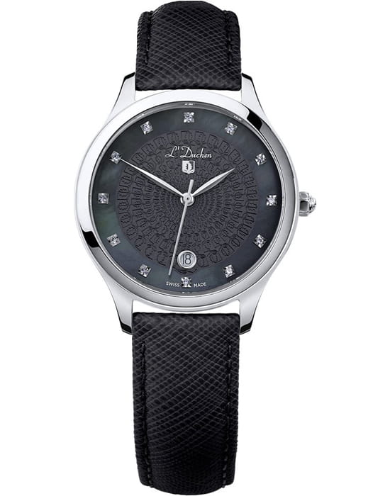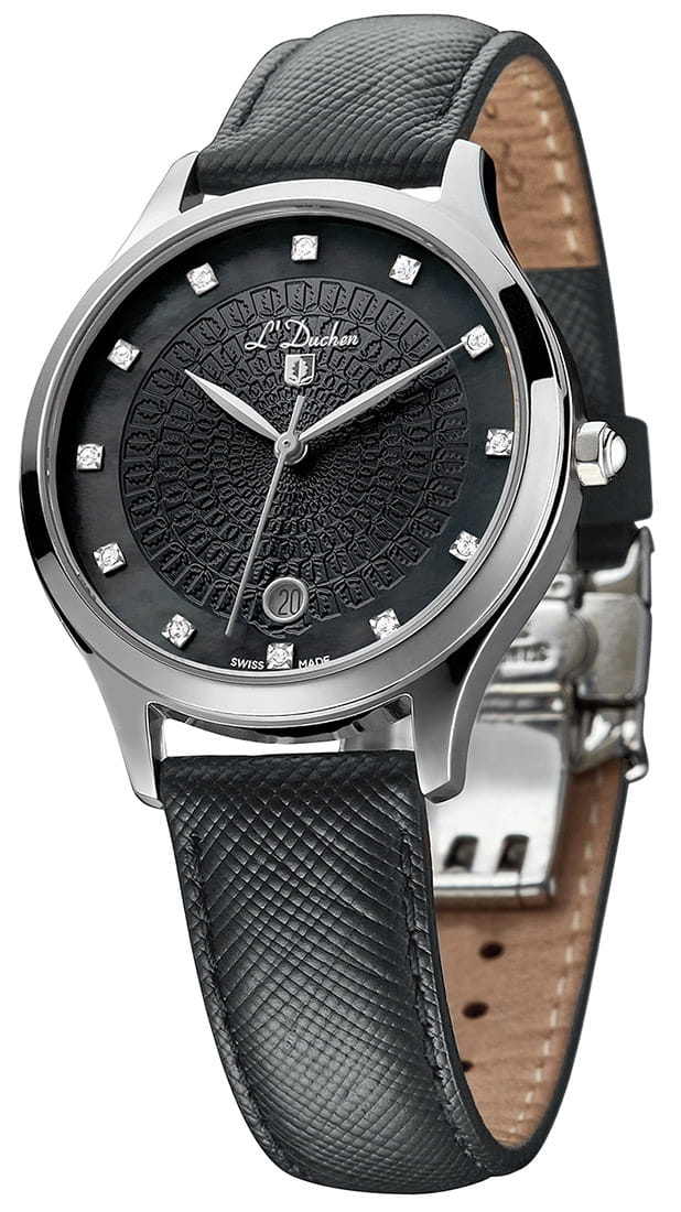 Женские швейцарские часы L'Duchen Grace D 791.11.31, кварцевый механизм с высокой точностью. Сапфировое стеклоСапфировое стеклоПрочный и надёжный материал из кристалла сапфира синтетического происхождения, характеризующийся особой твёрдостью и устойчивостью к царапинам и повреждениям. устойчивое к появлению царапин, обладающее высокой прозрачностью. Корпус часов выполнен из нержавеющей стали. Окошко даты находится в положении 6 часов. Класс водозащиты: 50 метров, позволит защитить корпус от случайных брызг или капель дождя. Кожаный ремешок на застёжке «бабочка» с кнопкамиЗастёжка "бабочка"Такой вид застёжки дополняется предохранителями, помогающими избежать случайного раскрытия браслета. Обладают изящным исполнением. .