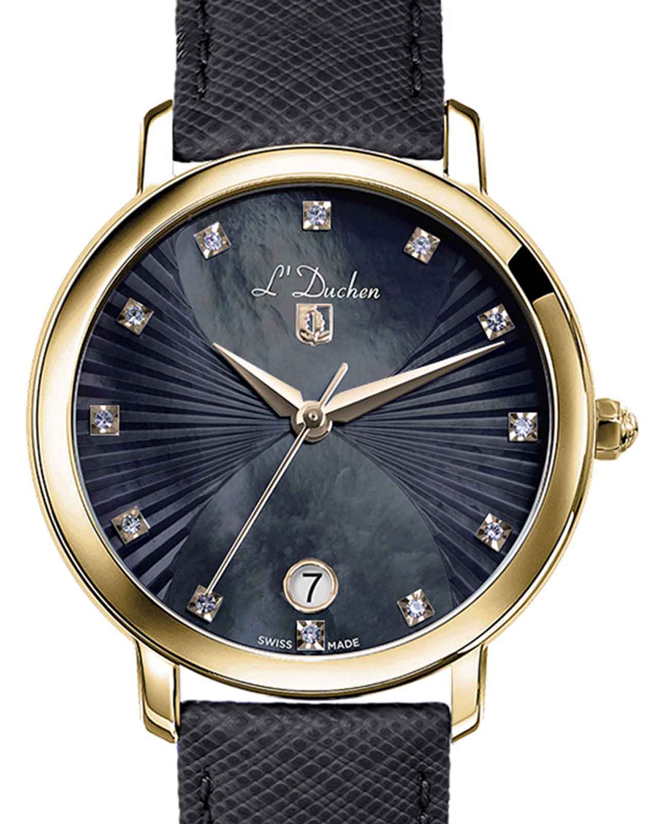 Женские швейцарские часы L'Duchen Eternity D 801.21.31, кварцевый механизм с высокой точностью. Сапфировое стеклоСапфировое стеклоПрочный и надёжный материал из кристалла сапфира синтетического происхождения, характеризующийся особой твёрдостью и устойчивостью к царапинам и повреждениям. устойчивое к появлению царапин, обладающее высокой прозрачностью. Корпус часов выполнен из нержавеющей стали с PVD-покрытиемPVDУльтратонкое покрытие наносится в технике вакуумного напыления, сочетает в себе нитрид титана особой прочности со слоем золота или оксида хрома. Несёт в себе декоративную или защитную функцию.. Окошко даты находится в положении 6 часов. Класс водозащиты: 50 метров, позволит защитить корпус от случайных брызг или капель дождя. Кожаный ремешок на застёжке «бабочка» с кнопкамиЗастёжка "бабочка"Такой вид застёжки дополняется предохранителями, помогающими избежать случайного раскрытия браслета. Обладают изящным исполнением. .