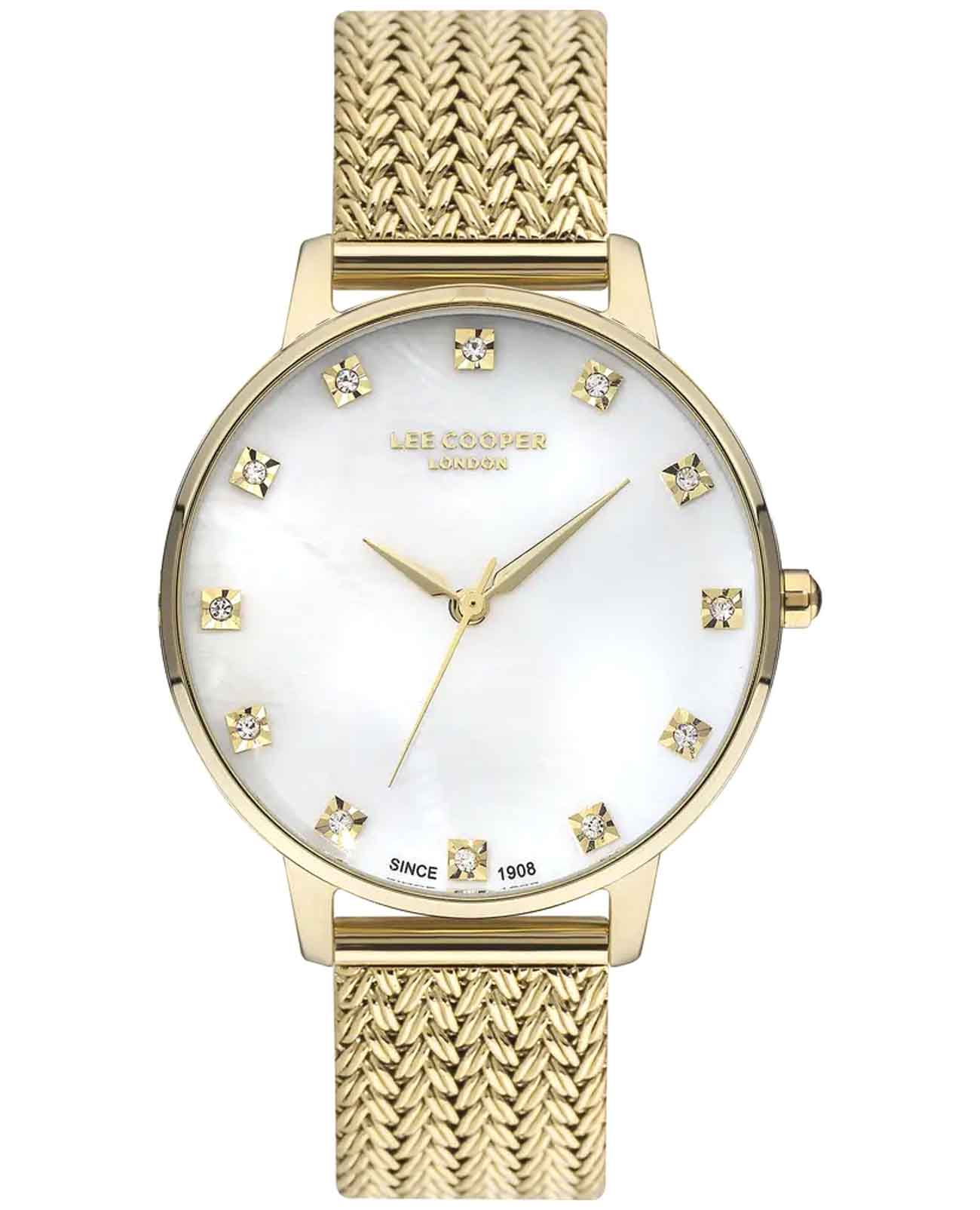 Женские наручные часы Lee Cooper LC07401.120 — это элегантная модель с утончённым дизайном. Корпус диаметром 36 мм выполнен из нержавеющей стали с IP-покрытиемIP-покрытиеМетод ионного напыления. Демонстрирует повышенную устойчивость к истиранию, окислению и химическим веществам. Под воздействием высокого давления и температуры около 1500°C молекулы металла надёжно соединяются с частицами корпуса часов., что придаёт часам изысканный вид. Перламутровый циферблат украшен изящными вставками из кристаллов и стрелками, обеспечивая удобное считывание времени. Циферблат защищён минеральным стекломМинеральное стеклоМинеральное стекло представляет собой искусственно выращенный минерал кварца. Такое стекло отличается особой устойчивостью к повреждениям и царапинам. Уступает по некоторым качествам сапфировому стеклу., устойчивым к царапинам. Часы работают на кварцевом механизме, обеспечивая точность хода. Браслет из нержавеющей стали с раскладной застёжкойРаскладная застёжкаТакой тип застёжки используется только на браслетах из металла. Она никогда не раскрывается полностью, происходит разделение на 2 и более частей. Раскладывающая застёжка снизит вероятность потери часов к минимуму. гарантирует комфортное ношение и надёжную фиксацию на запястье. Водозащита 30 метров защищает часы от случайных брызг и дождя, делая их подходящими для повседневного использования.