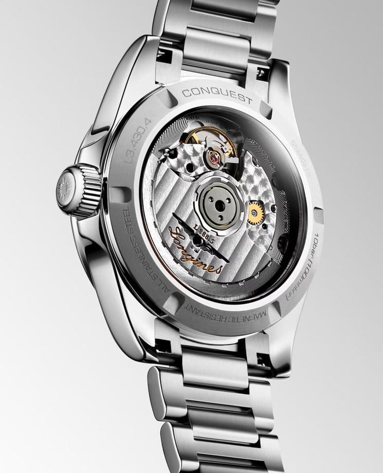 Женские швейцарские механические часы с автоподзаводом Longines Conquest L3.430.4.97.6. Сапфировое стеклоСапфировое стеклоПрочный и надёжный материал из кристалла сапфира синтетического происхождения, характеризующийся особой твёрдостью и устойчивостью к царапинам и повреждениям. устойчивое к появлению царапин, обладающее высокой прозрачностью. Корпус часов изготовлен из нержавеющей стали. Циферблат выполнен по технологии Sunray (солнечные лучи). Циферблат с 14 бриллиантами группы Top Wesselton VS-SI общим весом 0.035 карата. Стрелки с люминесцентным покрытиемЛюминесцентное покрытиеПозволяет считывать показания времени в темноте. Производители наносят на стрелки, часовые индексы, безель или поверхность циферблата светонакопительный состав, дающий холодное свечение.. Окошко даты в положении 6 часов. Прозрачная задняя крышка. Класс водозащиты: 100 метров, позволит плавать, нырять и заниматься другими водными видами спорта. Стальной браслет на раскладной застёжкеРаскладная застёжкаТакой тип застёжки используется только на браслетах из металла. Она никогда не раскрывается полностью, происходит разделение на 2 и более частей. Раскладывающая застёжка снизит вероятность потери часов к минимуму..