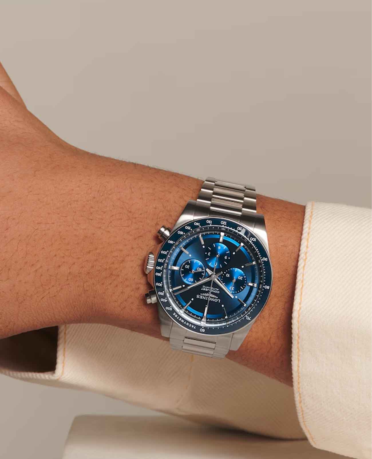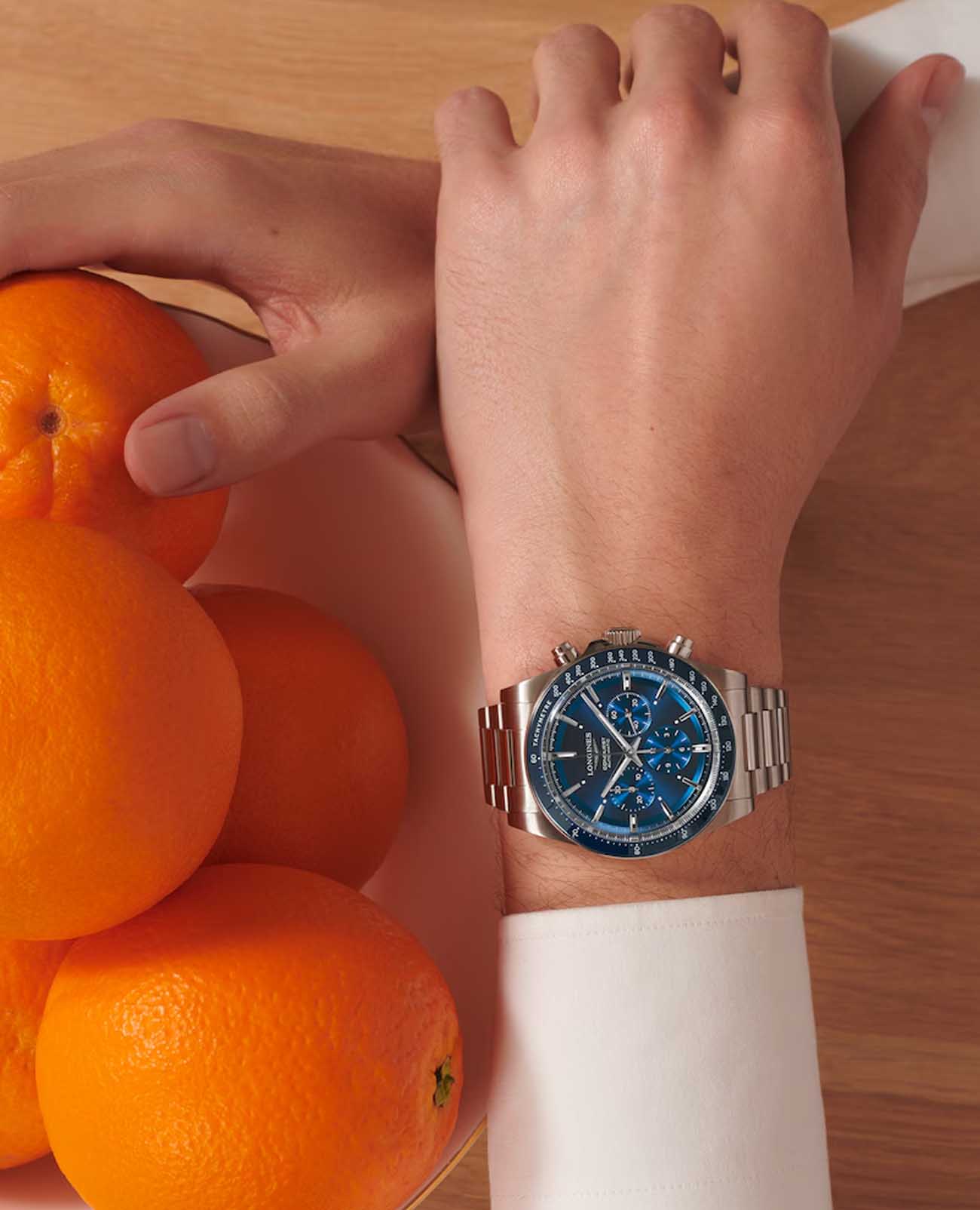 Мужские швейцарские механические часы- хронографХронографФункция позволяет измерять отрезки времени с особой точностью: часы, минуты, секунды. Верным признаком хронографа является наличие на циферблате 3 дополнительных окошек-счётчиков. Longines Conquest L3.835.4.92.6. Сапфировое стеклоСапфировое стеклоПрочный и надёжный материал из кристалла сапфира синтетического происхождения, характеризующийся особой твёрдостью и устойчивостью к царапинам и повреждениям. с многослойным антибликовым покрытием с обеих сторон, устойчивое к появлению царапин, обладающее высокой прозрачностью. Корпус часов изготовлен из стали. Неподвижный безельБезельВнешний ободок, закрепляющий стекло. В спортивных часах так называется поворотное кольцо с делениями на циферблате, выполняет роль таймера – замеряет отрезки времени на шкале. Неподвижный безель – элемент декора. Однонаправленно вращающийся безель на дайверских часах позволяет фиксировать моменты погружения и выныривания на поверхность. из стали и керамики, защищенный от царапин, никогда не изнашивается и не выцветает. Шкала тахиметрТахиметрРазмеченная шкала, располагается на ободке или безеле часов. Тахиметр позволяет рассчитать скорость на определённом участке пути, расстояние измеряется в километрах или милях.. На циферблате расположены три дополнительных индикатора. Стрелки и метки с люминесцентным покрытиемЛюминесцентное покрытиеПозволяет считывать показания времени в темноте. Производители наносят на стрелки, часовые индексы, безель или поверхность циферблата светонакопительный состав, дающий холодное свечение.. Класс водозащиты: 100 метров, позволит плавать, нырять и заниматься другими водными видами спорта. Стальной браслет на раскладной застёжкеРаскладная застёжкаТакой тип застёжки используется только на браслетах из металла. Она никогда не раскрывается полностью, происходит разделение на 2 и более частей. Раскладывающая застёжка снизит вероятность потери часов к минимуму..