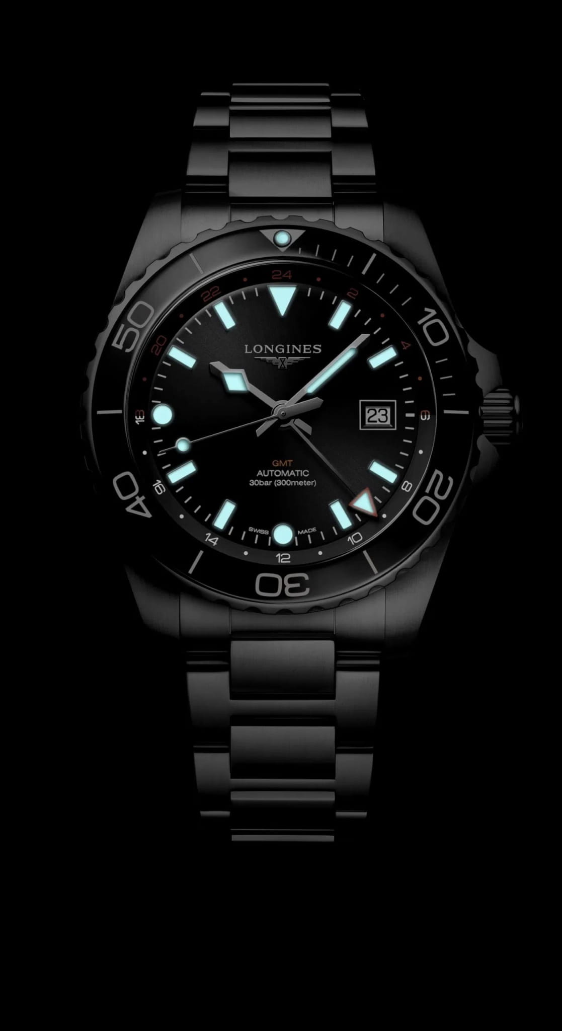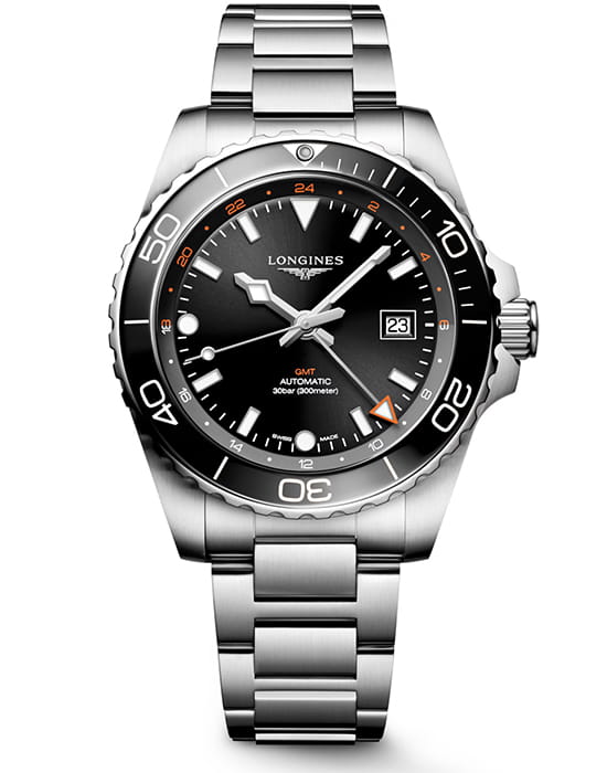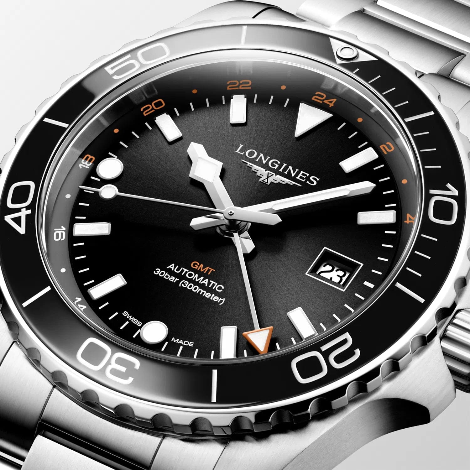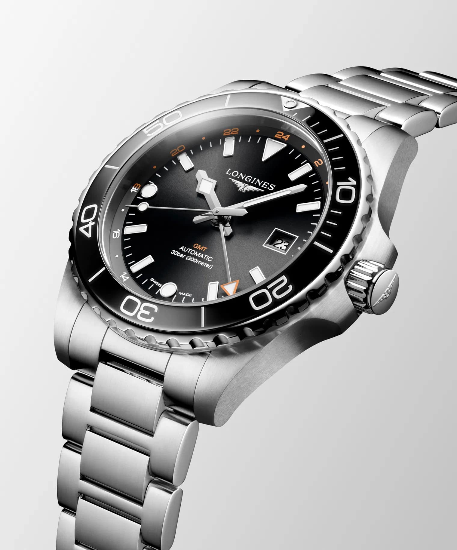 Женские механические швейцарские часы с автоподзаводом Longines Hydroconquest GMT L3.890.4.56.6. Сапфировое стеклоСапфировое стеклоПрочный и надёжный материал из кристалла сапфира синтетического происхождения, характеризующийся особой твёрдостью и устойчивостью к царапинам и повреждениям. с антибликовым покрытием, устойчивое к мелким механическим повреждениям. Корпус часов изготовлен из нержавеющей стали. Вращающийся стальной безельБезельВнешний ободок, закрепляющий стекло. В спортивных часах так называется поворотное кольцо с делениями на циферблате, выполняет роль таймера – замеряет отрезки времени на шкале. Неподвижный безель – элемент декора. Однонаправленно вращающийся безель на дайверских часах позволяет фиксировать моменты погружения и выныривания на поверхность. с люминесцентным покрытиемЛюминесцентное покрытиеПозволяет считывать показания времени в темноте. Производители наносят на стрелки, часовые индексы, безель или поверхность циферблата светонакопительный состав, дающий холодное свечение. Superluminova из нержавеющей стали и керамики, защищенный от царапин, никогда не изнашивается и не выцветает. Стрелки и метки с люминесцентным покрытиемЛюминесцентное покрытиеПозволяет считывать показания времени в темноте. Производители наносят на стрелки, часовые индексы, безель или поверхность циферблата светонакопительный состав, дающий холодное свечение.. Окошко даты находится в положении 3 часа. Класс водозащиты: 300 метров, позволит плавать, нырять и заниматься другими водными видами спорта. Стальной браслет на раскладной застёжкеРаскладная застёжкаТакой тип застёжки используется только на браслетах из металла. Она никогда не раскрывается полностью, происходит разделение на 2 и более частей. Раскладывающая застёжка снизит вероятность потери часов к минимуму..