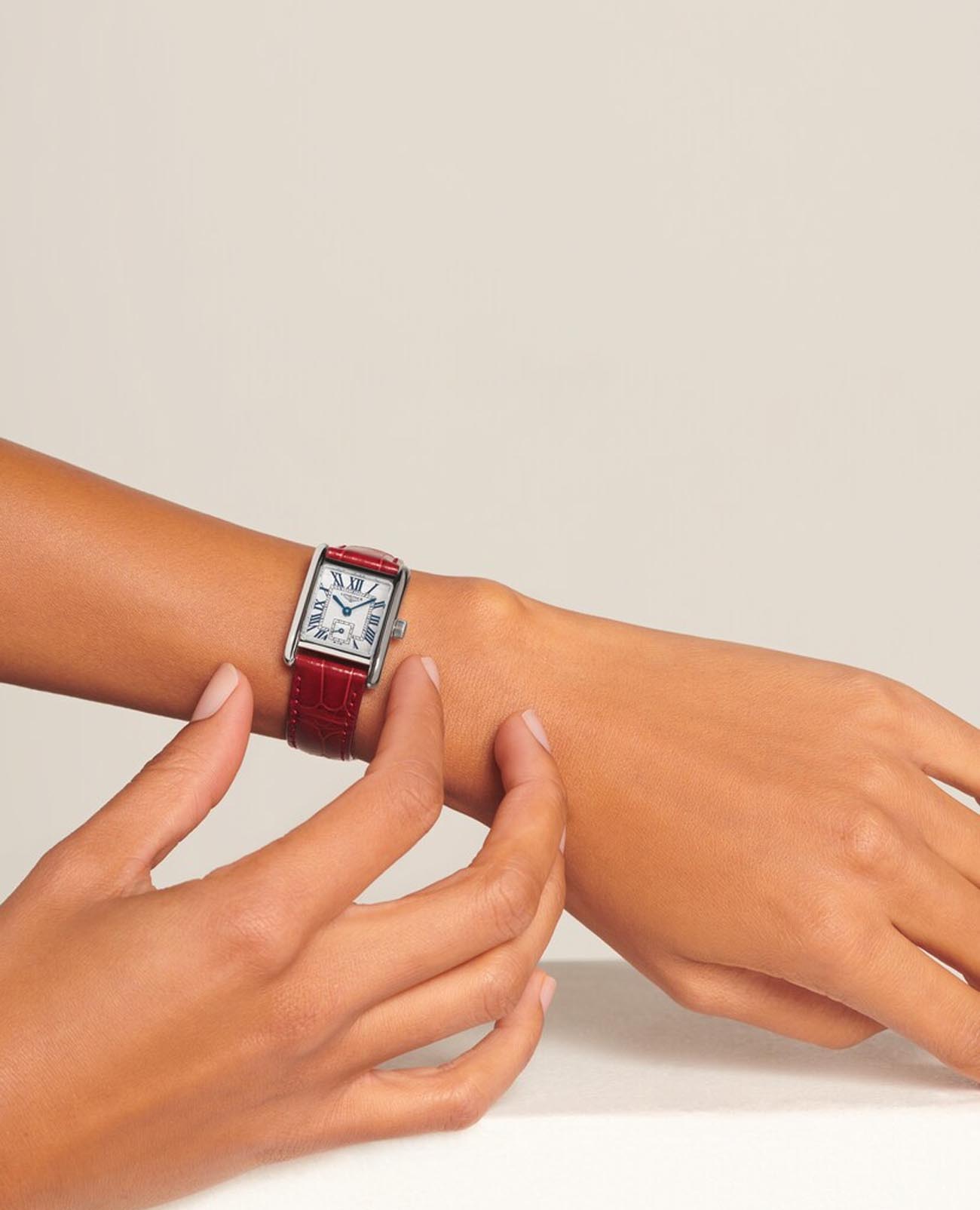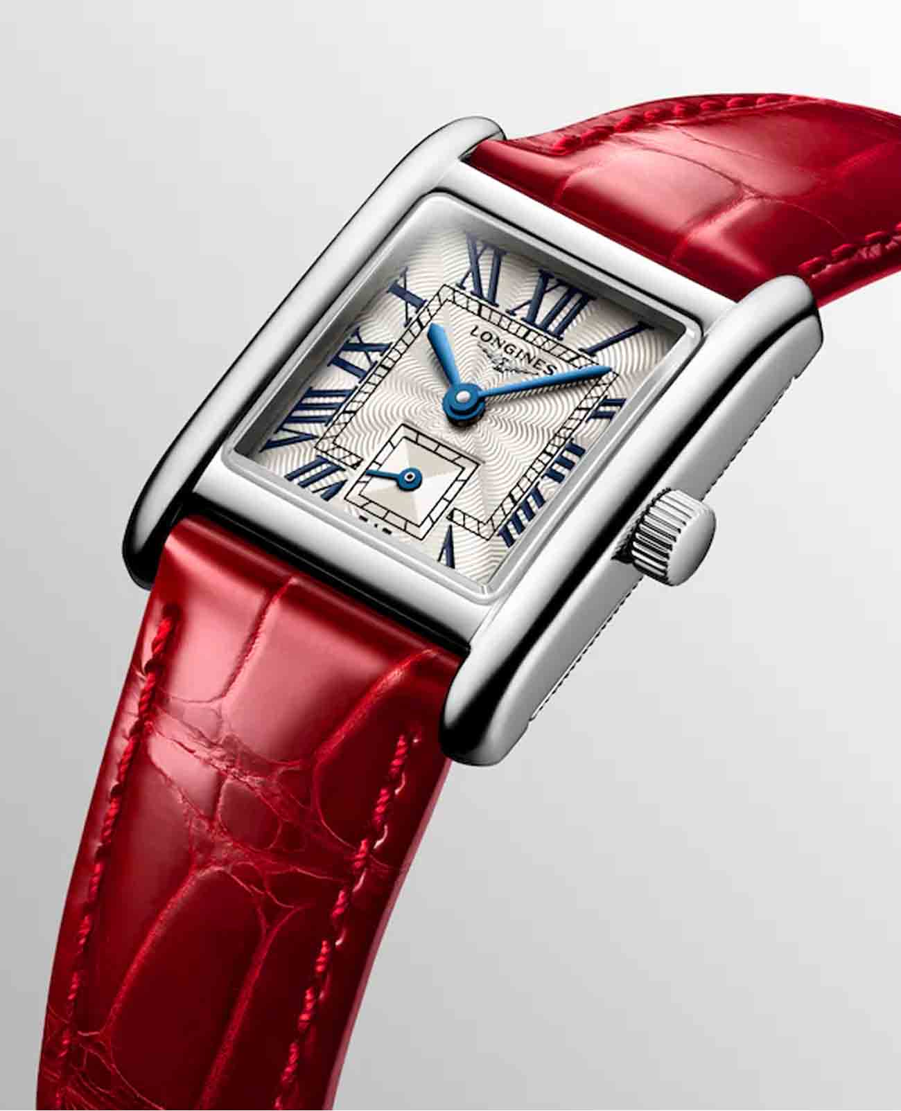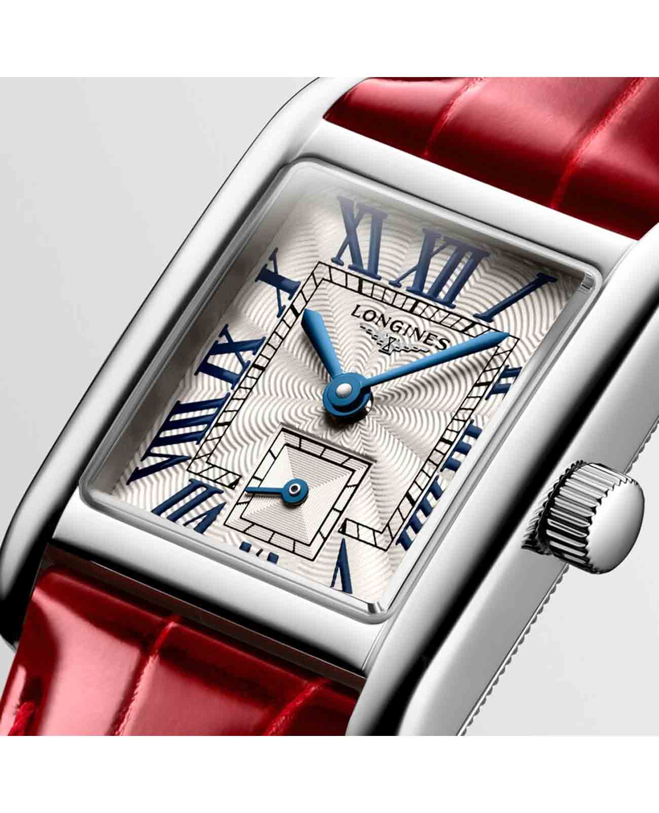 Женские швейцарские часы Longines DolceVita L5.200.4.71.5, кварцевый механизм с высокой точностью. Сапфировое стеклоСапфировое стеклоПрочный и надёжный материал из кристалла сапфира синтетического происхождения, характеризующийся особой твёрдостью и устойчивостью к царапинам и повреждениям. устойчивое к появлению царапин, обладающее высокой прозрачностью. Корпус часов изготовлен из нержавеющей стали. Циферблат украшен узором «Flinque»,  метки в виде римских цифр. Малая секундная стрелка в положении 6 часов. Класс водозащиты: 30 метров, позволит защитить корпус от случайных брызг или капель дождя. Ремешок из кожи аллигатора на стандартной застежке.