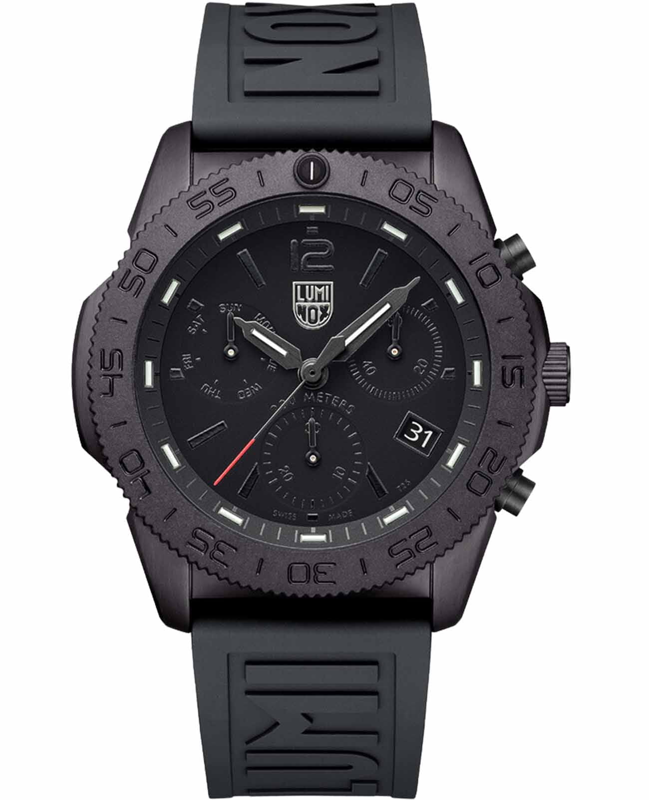 Швейцарские наручные часы Luminox Pacific Diver Chronograph XS.3141.BO.1 – это идеальный симбиоз стиля и высокой функциональности. Оснащенные высокоточным кварцевым механизмом, они гарантируют безупречное времяизмерение и надежность в любом случае. Часы-хронографХронографФункция позволяет измерять отрезки времени с особой точностью: часы, минуты, секунды. Верным признаком хронографа является наличие на циферблате 3 дополнительных окошек-счётчиков. обладают функцией секундомераСекундомерСекундоме́р — прибор, способный измерять интервалы времени с точностью до долей секунды., что делает их практичными в использовании. Циферблат этих часов защищен сапфировым стекломСапфировое стеклоПрочный и надёжный материал из кристалла сапфира синтетического происхождения, характеризующийся особой твёрдостью и устойчивостью к царапинам и повреждениям. с антибликовым покрытиемАнтибликовое покрытиеСлой оксида металла в 0,13-0,3 микрон, благодаря которому стекло часов не бликует и не отражает свет. Антибликовое покрытие уменьшает отражение света в 10 раз, обеспечивая отличную читаемость показателей циферблата., которое славится своей прочностью и устойчивостью к царапинам, обеспечивая кристально чистый обзор. Корпус часов выполнен из качественной стали с черным PVD-покрытиемPVDУльтратонкое покрытие наносится в технике вакуумного напыления, сочетает в себе нитрид титана особой прочности со слоем золота или оксида хрома. Несёт в себе декоративную или защитную функцию., что свидетельствует о долговечности и прочности изделия. Стрелки с LLTLLTLLT — это автономный механизм подсветки, основанный на использовании микроскопических газонаполненных элементов. Специальные герметичные капсулы из боросиликатного стекла, интегрированные в циферблат, генерируют свечение без необходимости подключения к внешним источникам энергии. Для их работы не требуется ни дополнительный свет, ни механическое воздействие (например, нажатие кнопки). Свечение возникает благодаря химическому процессу: реакция между тритием, заключенным в капсулах, и люминофорным покрытием создает стабильное автономное освещение. Технология обеспечивает энергетическую независимость и долговечность подсветки.-подсветкой, обеспечивают отличную видимость даже в условиях недостаточной освещенности, что делает их удобными для использования в любых условиях. Дополнительно часы располагают окошком даты в положении 4 часа, позволяющим быстро и удобно отслеживать текущую дату. Их внушительный класс водозащиты в 200 метров делает их идеальными для любителей водных видов спорта, таких как плавание и ныряние, не беспокоясь о повреждении механизма. Каучуковый ремешок, надёжно фиксирующий часы на запястье с помощью раскладной застёжкиРаскладная застёжкаТакой тип застёжки используется только на браслетах из металла. Она никогда не раскрывается полностью, происходит разделение на 2 и более частей. Раскладывающая застёжка снизит вероятность потери часов к минимуму., обеспечивает комфортное ношение в течение всего дня. Стильный вращающийся безельБезельВнешний ободок, закрепляющий стекло. В спортивных часах так называется поворотное кольцо с делениями на циферблате, выполняет роль таймера – замеряет отрезки времени на шкале. Неподвижный безель – элемент декора. Однонаправленно вращающийся б