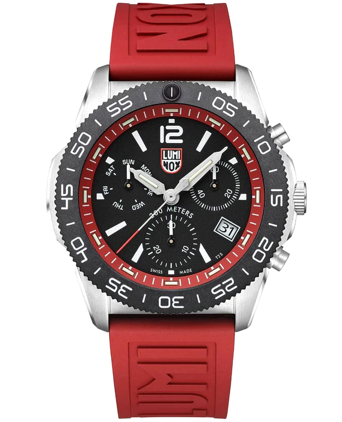 Швейцарские наручные часы Luminox Pacific Diver Chronograph XS.3155 – это идеальный симбиоз стиля и высокой функциональности. Оснащенные высокоточным кварцевым механизмом, они гарантируют безупречное измерение и надежность в любом случае. Часы-хронографХронографФункция позволяет измерять отрезки времени с особой точностью: часы, минуты, секунды. Верным признаком хронографа является наличие на циферблате 3 дополнительных окошек-счётчиков. обладают функцией секундомераСекундомерСекундоме́р — прибор, способный измерять интервалы времени с точностью до долей секунды., что делает их практичными в использовании. Циферблат этих часов защищен сапфировым стекломСапфировое стеклоПрочный и надёжный материал из кристалла сапфира синтетического происхождения, характеризующийся особой твёрдостью и устойчивостью к царапинам и повреждениям. с антибликовым покрытиемАнтибликовое покрытиеСлой оксида металла в 0,13-0,3 микрон, благодаря которому стекло часов не бликует и не отражает свет. Антибликовое покрытие уменьшает отражение света в 10 раз, обеспечивая отличную читаемость показателей циферблата., которое славится своей прочностью и устойчивостью к царапинам, обеспечивая кристально чистый обзор. Корпус часов выполнен из качественной стали, что свидетельствует о долговечности и прочности изделия. Стрелки с LLTLLTLLT — это автономный механизм подсветки, основанный на использовании микроскопических газонаполненных элементов. Специальные герметичные капсулы из боросиликатного стекла, интегрированные в циферблат, генерируют свечение без необходимости подключения к внешним источникам энергии. Для их работы не требуется ни дополнительный свет, ни механическое воздействие (например, нажатие кнопки). Свечение возникает благодаря химическому процессу: реакция между тритием, заключенным в капсулах, и люминофорным покрытием создает стабильное автономное освещение. Технология обеспечивает энергетическую независимость и долговечность подсветки.-подсветкой, обеспечивают отличную видимость даже в условиях недостаточной освещенности, что делает их удобными для использования в любых условиях. Дополнительно часы располагают окошком даты в положении 4 часа, позволяющим быстро и удобно отслеживать текущую дату. Их внушительный класс водозащиты в 200 метров делает их идеальными для любителей водных видов спорта, таких как плавание и ныряние, не беспокоясь о повреждении механизма. Ремешок из нитрилового каучука надёжно фиксирующий часы на запястье с помощью раскладной застёжкиРаскладная застёжкаТакой тип застёжки используется только на браслетах из металла. Она никогда не раскрывается полностью, происходит разделение на 2 и более частей. Раскладывающая застёжка снизит вероятность потери часов к минимуму., обеспечивает комфортное ношение в течение всего дня. Стильный вращающийся безельБезельВнешний ободок, закрепляющий стекло. В спортивных часах так называется поворотное кольцо с делениями на циферблате, выполняет роль таймера – замеряет отрезки времени на шкале. Неподвижный безель – элемент декора. Однонаправленно вращающийся безель на дайверских часах позволяет фиксировать моменты погружения и выныривания на поверхность., изготовленный из карбонаКарбонОт «carbon», «carbone» - углерод, углепластик - полимерный композиционный материал из пер