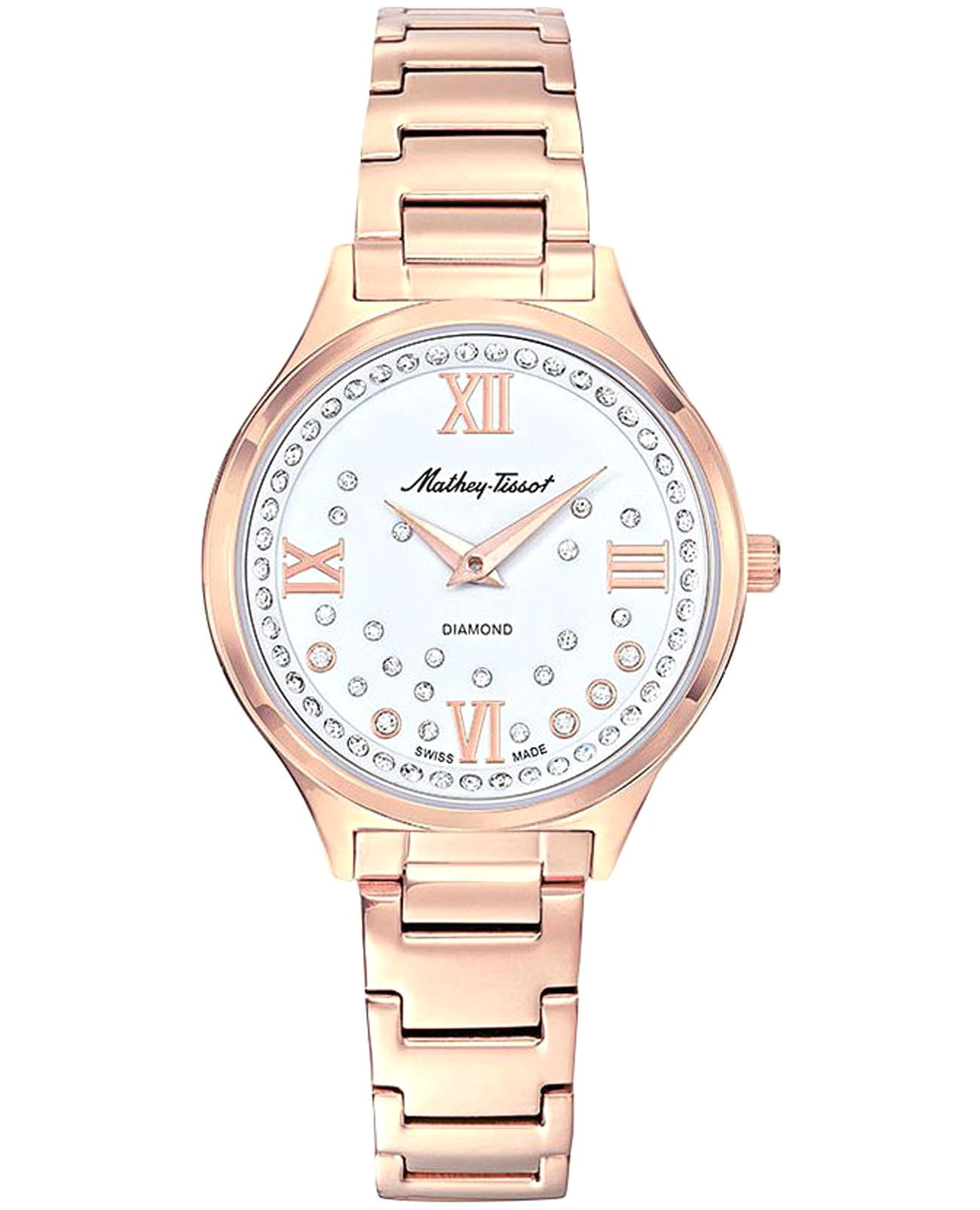 Женские кварцевые часы Mathey-Tissot Nicole D985SPI — это стильное сочетание элегантности и современного дизайна. Изящный корпус выполнен из нержавеющей стали с PVD-покрытиемPVDУльтратонкое покрытие наносится в технике вакуумного напыления, сочетает в себе нитрид титана особой прочности со слоем золота или оксида хрома. Несёт в себе декоративную или защитную функцию. цвета розового золота, диаметром 32 мм, прекрасно впишется в ваш исключительный стиль. Изысканный циферблат с метками в виде римских цифр придает модели особый блеск и защищен сапфировым стекломСапфировое стеклоПрочный и надёжный материал из кристалла сапфира синтетического происхождения, характеризующийся особой твёрдостью и устойчивостью к царапинам и повреждениям., обеспечивающим устойчивость к царапинам. Циферблат украшен кристаллами. Мечевидные стрелки в стиле Dauphine. Часы оснащены надежным кварцевым механизмом. Рифленая заводная головка. Стальной браслет с PVD-покрытиемPVDУльтратонкое покрытие наносится в технике вакуумного напыления, сочетает в себе нитрид титана особой прочности со слоем золота или оксида хрома. Несёт в себе декоративную или защитную функцию. на застёжке-бабочке с кнопкамиЗастёжка "бабочка"Такой вид застёжки дополняется предохранителями, помогающими избежать случайного раскрытия браслета. Обладают изящным исполнением. гарантирует комфортное и безопасное ношение. Класс водозащиты: 50 метров позволит защитить корпус от случайных брызг или капель дождя. Mathey-Tissot  — отличный выбор для тех, кто ценит утонченность и качество.