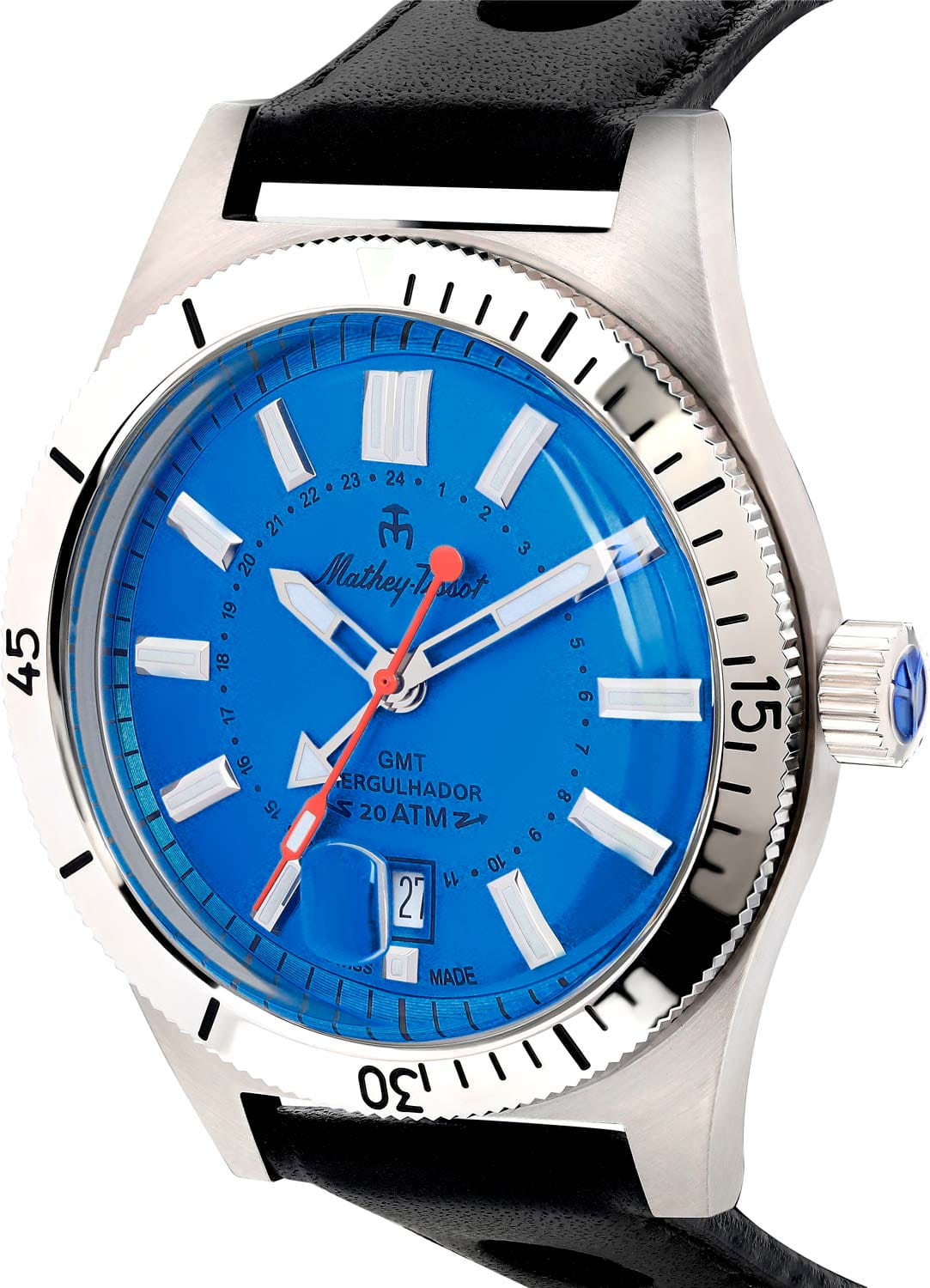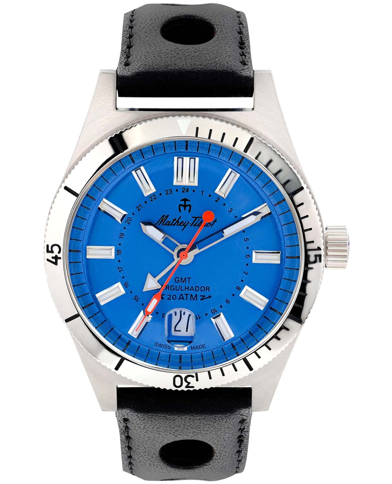 Мужские кварцевые часы Mathey-Tissot Mergulhador GMTGMTОтображение времени второго часового пояса.Такая функция особенно актуальна для путешественников и бизнесменов,которые общаются с людьми из разных стран,теперь вы всегда будете знать,какой час у вашего партнёра или близкого человека. MRGABU — это стильное сочетание элегантности и современного дизайна. Изящный корпус выполнен из нержавеющей стали, диаметром 41 мм, что придаст образу элегантности и надежности. Циферблат с метками в виде штрихов придает модели особый блеск. Циферблат защищен минеральным стекломМинеральное стеклоМинеральное стекло представляет собой искусственно выращенный минерал кварца. Такое стекло отличается особой устойчивостью к повреждениям и царапинам. Уступает по некоторым качествам сапфировому стеклу. с сапфировым покрытием, обеспечивает устойчивость к царапинам. Второй часовой поясВторой часовой поясФункция, позволяющая отображать время двух часовых поясов одновременно. в 24-х часовом формате времени отображается центральной стрелкой. Стрелки и метки с люминесцентным покрытиемЛюминесцентное покрытиеПозволяет считывать показания времени в темноте. Производители наносят на стрелки, часовые индексы, безель или поверхность циферблата светонакопительный состав, дающий холодное свечение. SuperLumiNova, которое светится в темноте после непродолжительной зарядки на свету. Окошко даты находится в положении 6 часов.  Рифленый безельБезельВнешний ободок, закрепляющий стекло. В спортивных часах так называется поворотное кольцо с делениями на циферблате, выполняет роль таймера – замеряет отрезки времени на шкале. Неподвижный безель – элемент декора. Однонаправленно вращающийся безель на дайверских часах позволяет фиксировать моменты погружения и выныривания на поверхность. с минутными отметками вращается в одном направлении. Часы оснащены надежным кварцевым механизмом. Кожаный ремешок на стандартной застёжке гарантирует комфортное и безопасное ношение. Класс водозащиты: 200 метров позволит плавать, нырять и заниматься другими водными видами спорта. Mathey-Tissot  — отличный выбор для тех, кто ценит утонченность и качество.