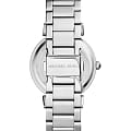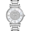 Женские американские часы Michael Kors Catlin MK3355, кварцевый механизм с высокой точностью. Минеральное стеклоМинеральное стеклоМинеральное стекло представляет собой искусственно выращенный минерал кварца. Такое стекло отличается особой устойчивостью к повреждениям и царапинам. Уступает по некоторым качествам сапфировому стеклу., устойчивое к мелким механическим повреждениям. Корпус часов выполнен из нержавеющей стали. БезельБезельВнешний ободок, закрепляющий стекло. В спортивных часах так называется поворотное кольцо с делениями на циферблате, выполняет роль таймера – замеряет отрезки времени на шкале. Неподвижный безель – элемент декора. Однонаправленно вращающийся безель на дайверских часах позволяет фиксировать моменты погружения и выныривания на поверхность. и циферблат украшены кристаллами. Класс водозащиты: 30 метров, позволит защитить корпус от случайных брызг или капель дождя. Стальной браслет на раскладной застёжкеРаскладная застёжкаТакой тип застёжки используется только на браслетах из металла. Она никогда не раскрывается полностью, происходит разделение на 2 и более частей. Раскладывающая застёжка снизит вероятность потери часов к минимуму..