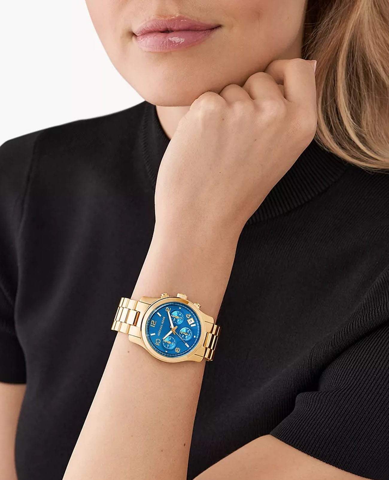 Женские часы-хронографХронографФункция позволяет измерять отрезки времени с особой точностью: часы, минуты, секунды. Верным признаком хронографа является наличие на циферблате 3 дополнительных окошек-счётчиков. Michael Kors Runway MK7353, кварцевый механизм с высокой точностью. Минеральное стеклоМинеральное стеклоМинеральное стекло представляет собой искусственно выращенный минерал кварца. Такое стекло отличается особой устойчивостью к повреждениям и царапинам. Уступает по некоторым качествам сапфировому стеклу. устойчивое к появлению царапин, обладающее высокой прозрачностью. Корпус и браслет изготовлены из нержавеющей стали c PVDPVDУльтратонкое покрытие наносится в технике вакуумного напыления, сочетает в себе нитрид титана особой прочности со слоем золота или оксида хрома. Несёт в себе декоративную или защитную функцию. покрытием. На циферблате три дополнительных индикатора, окошко даты. Стрелки с люминесцентным покрытиемЛюминесцентное покрытиеПозволяет считывать показания времени в темноте. Производители наносят на стрелки, часовые индексы, безель или поверхность циферблата светонакопительный состав, дающий холодное свечение.. Класс водозащиты: 100 метров, позволит плавать, нырять и заниматься другими водными видами спорта. Стальной на раскладной застёжкеРаскладная застёжкаТакой тип застёжки используется только на браслетах из металла. Она никогда не раскрывается полностью, происходит разделение на 2 и более частей. Раскладывающая застёжка снизит вероятность потери часов к минимуму..