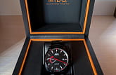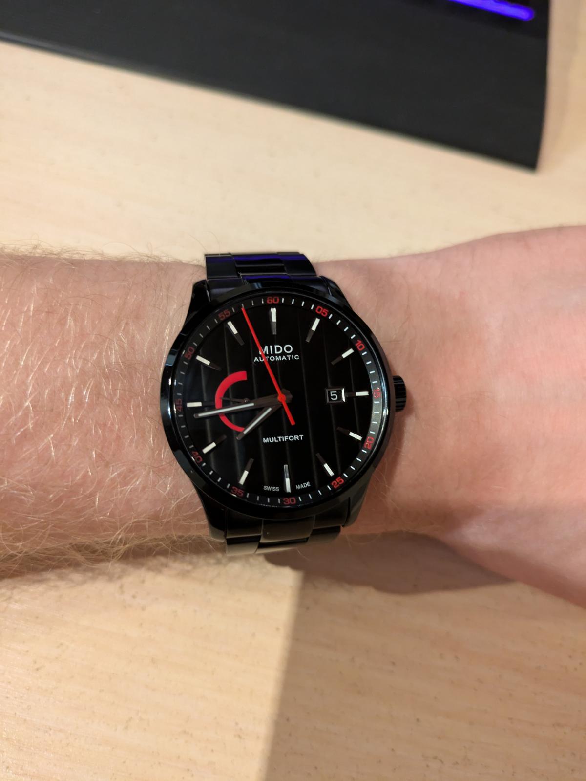Часы MIDO Multifort Power Reserve (артикул M038.424.33.051.00) сочетают в себе спортивный и городской дизайн, подчёркивая надёжность и элегантность. Корпус диаметром 42 мм выполнен из нержавеющей стали с чёрным PVD-покрытиемPVDУльтратонкое покрытие наносится в технике вакуумного напыления, сочетает в себе нитрид титана особой прочности со слоем золота или оксида хрома. Несёт в себе декоративную или защитную функцию. и водозащитой до 10 бар (100 метров). Прозрачная задняя крышка подчёркивает изысканный механизм. Чёрный циферблат с узором «Côtes de Genève» и накладными часовыми метками оснащён покрытием Super-LumiNova®Люминесцентное покрытиеПозволяет считывать показания времени в темноте. Производители наносят на стрелки, часовые индексы, безель или поверхность циферблата светонакопительный состав, дающий холодное свечение. для отличной читаемости. Индикатор запаса хода расположен в положении «9 часов», а окошко даты — в положении «3 часа». Циферблат защищён сапфировым стекломСапфировое стеклоПрочный и надёжный материал из кристалла сапфира синтетического происхождения, характеризующийся особой твёрдостью и устойчивостью к царапинам и повреждениям. с антибликовым покрытием.