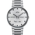 Серебристый циферблат с фирменным логотипом Mido 1950-х годов украшен накладными индексами и стрелками  с люминесцентным покрытиемЛюминесцентное покрытиеПозволяет считывать показания времени в темноте. Производители наносят на стрелки, часовые индексы, безель или поверхность циферблата светонакопительный состав, дающий холодное свечение., обеспечивающим читаемость даже в условиях слабого освещения. На «3 часах» расположено двойное окошко календаря — день недели и дата. Стальной браслет на раскладной застёжкеРаскладная застёжкаТакой тип застёжки используется только на браслетах из металла. Она никогда не раскрывается полностью, происходит разделение на 2 и более частей. Раскладывающая застёжка снизит вероятность потери часов к минимуму..