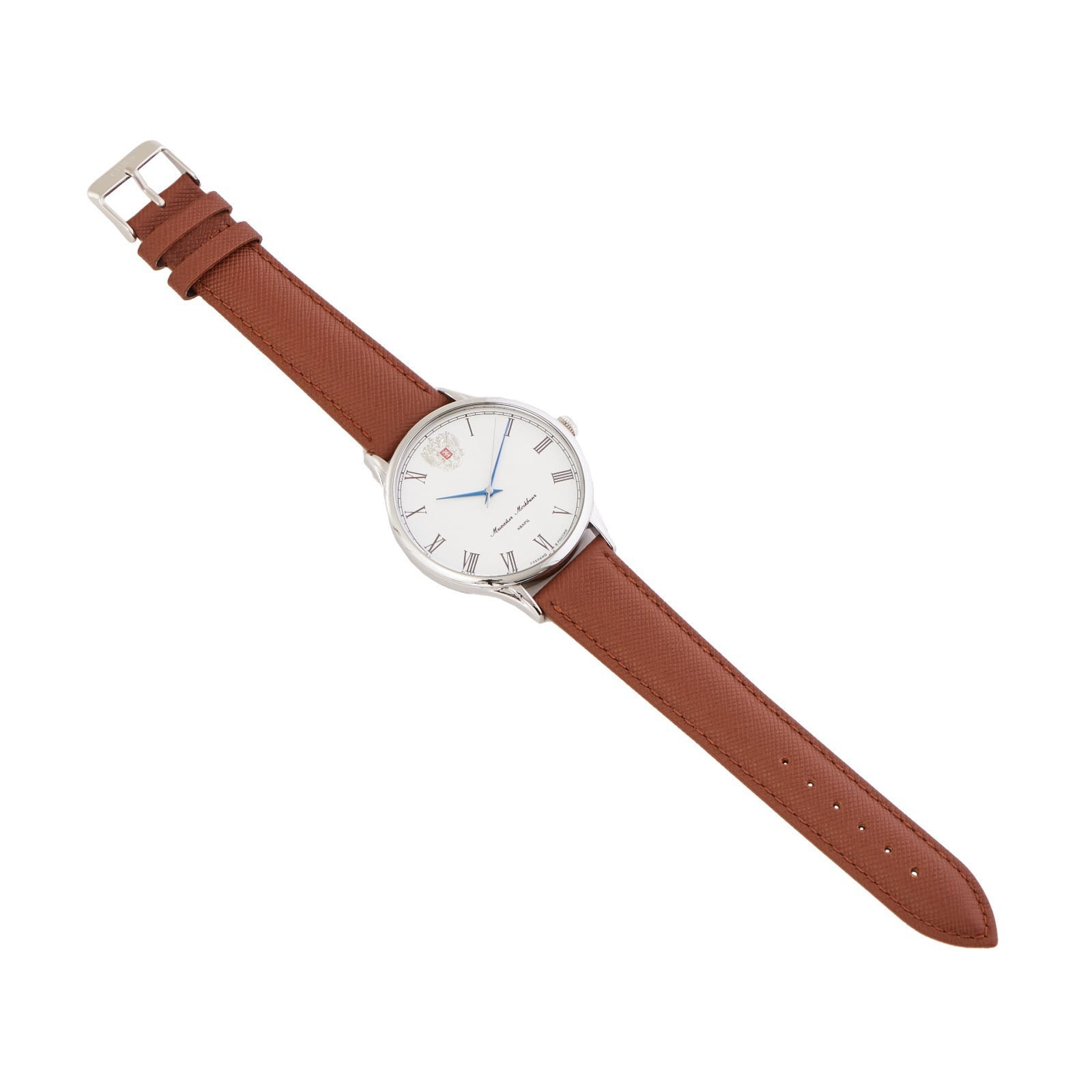 Мужские кварцевые часы Михаил Москвин Classic 1310B1L6 - элегантное сочетание классического стиля и патриотического акцента. Круглый корпус диаметром 43 мм из латуни, белый циферблат с римскими цифрами, где отметка «12» выполнена в виде герба Российской Федерации. Стекло минеральное закалённоеМинеральное стеклоМинеральное стекло представляет собой искусственно выращенный минерал кварца. Такое стекло отличается особой устойчивостью к повреждениям и царапинам. Уступает по некоторым качествам сапфировому стеклу., устойчивое к царапинам. Механизм японский кварцевый Epson AL21E2D, обеспечивающий высокую точность и надёжность. Центральные часовая, минутная и секундная стрелки. Рифлёная заводная головка удобна в использовании и гармонично вписывается в общий дизайн. Водонепроницаемость 30 м (WR30) защита от брызг и дождя, подходит для повседневного ношения. Коричневый кожаный ремешок на стандартной застёжке придаёт часам благородный и универсальный вид. Идеальный выбор для ценителей классики, русской символики и лаконичного белого циферблата в надёжном и стильном исполнении.